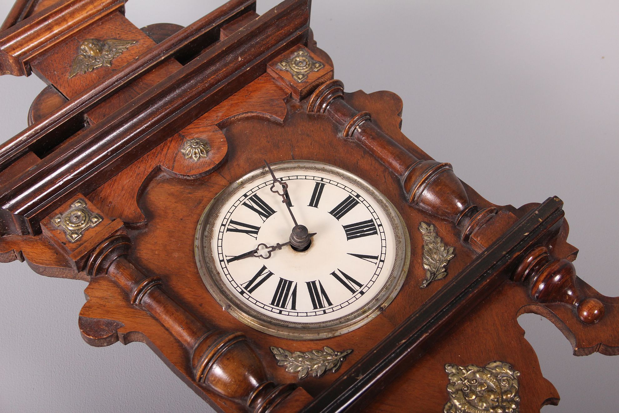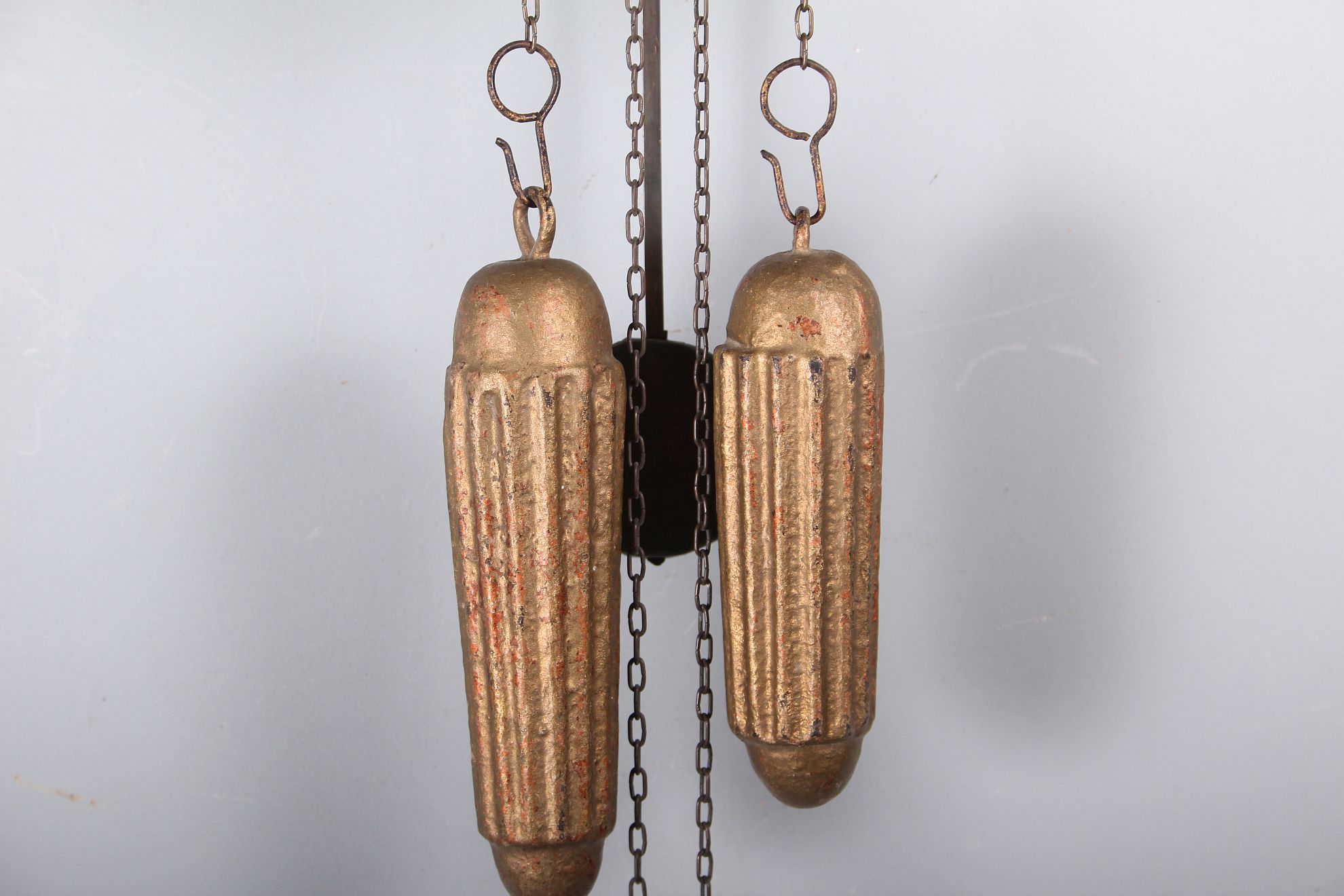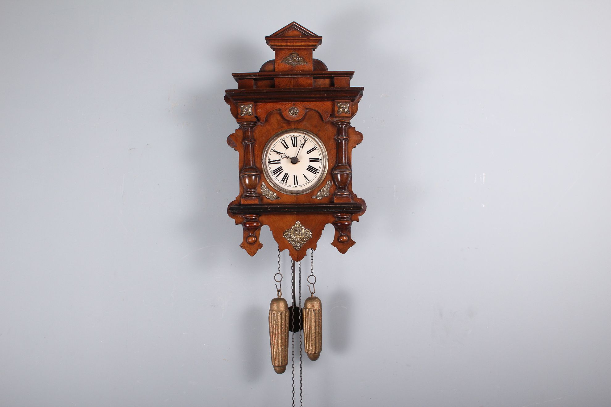 závěsné dvouzávažové hodiny, skleněný kulatý ciferník na zdobené dřevěné podložce dekorativních tvarů s mosaznými aplikami, půlové bití, závaží na řetízkách, funkční stav, rozměr ciferníku 44 x 26 cm