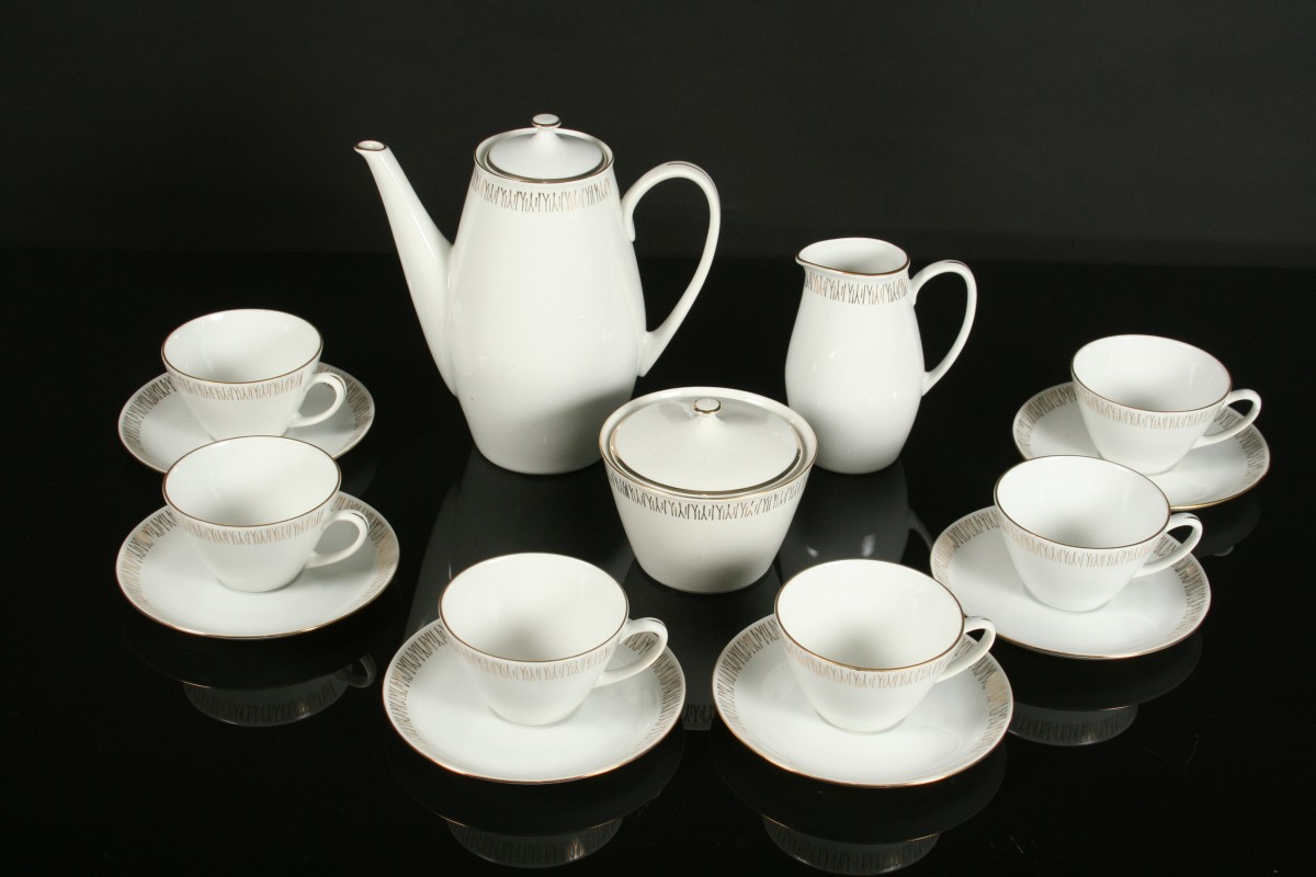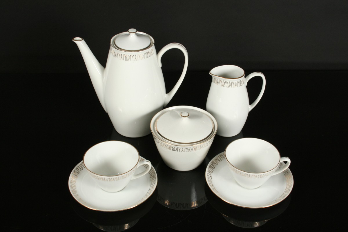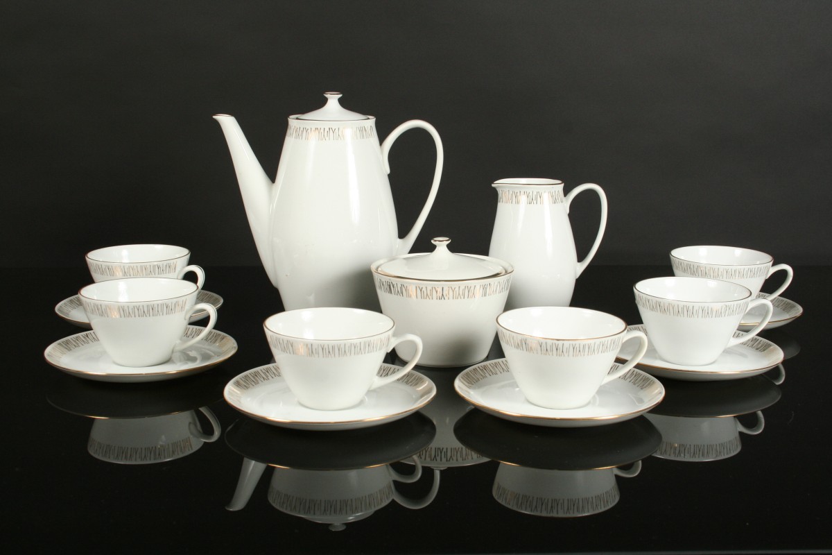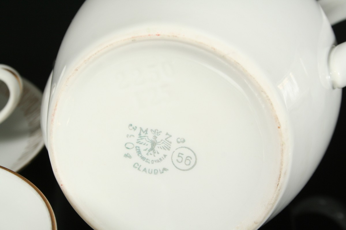 bílý porcelánový čajový servis ve stylu Brusel, 15 kusů, zdobené po obvodu zlatou linkou a jemným větvičkovým dekorem, velká konvice s víčkem proti vypadnutí 21 cm, konvička na mléko, cukřenka s víčkem, 6 x šálek a 6 x podšálek, značeno na dně MZ, 60. léta 20. století, bez poškození