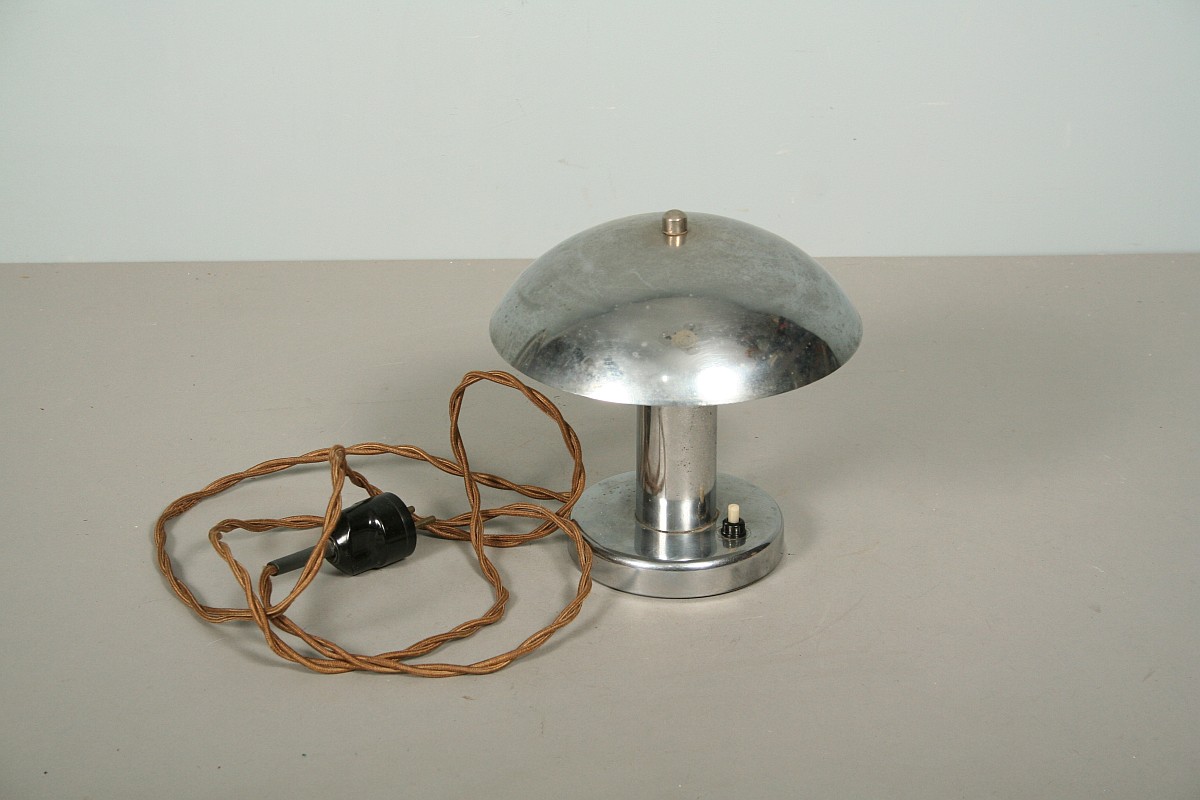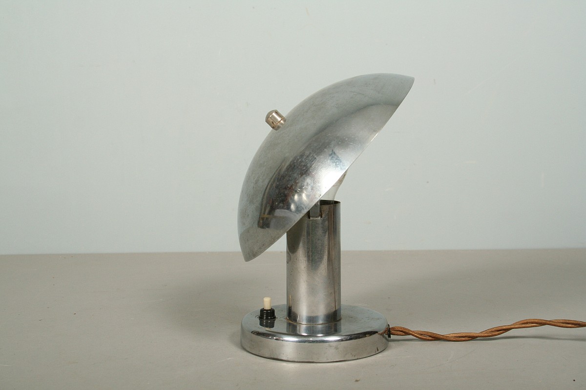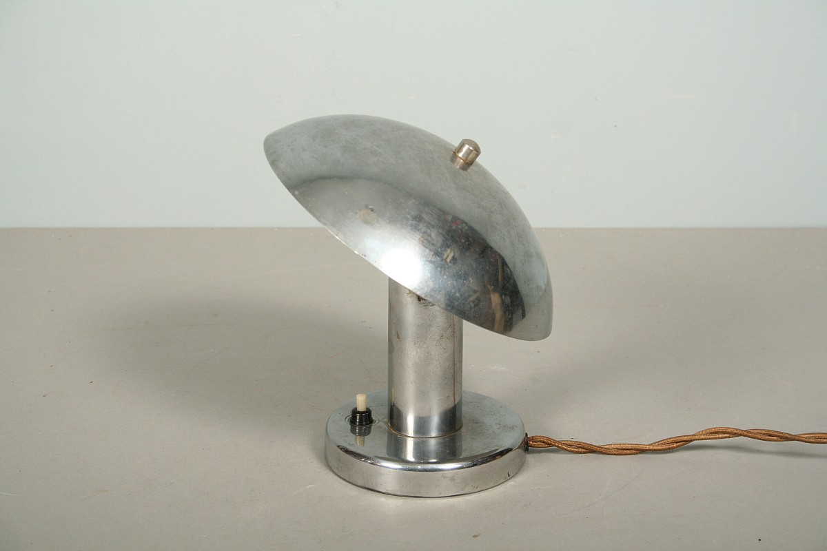 lampička na stolek ve tvaru hříbku s možností naklánění stínidla, funkcionalismus, pochromovaný kov, vše původní včetně elektroinstalace, neleštěno, 30. léta 20. století, 19 x 19 cm