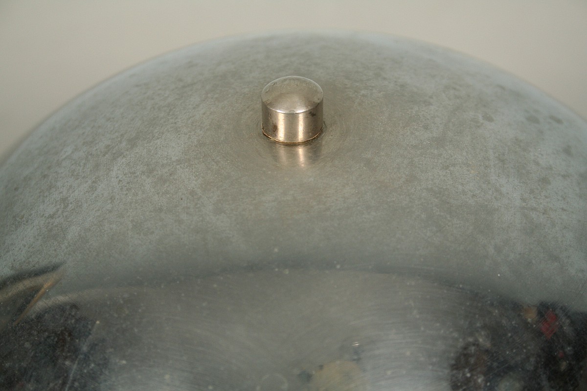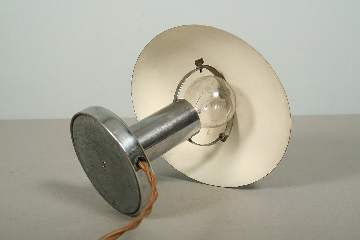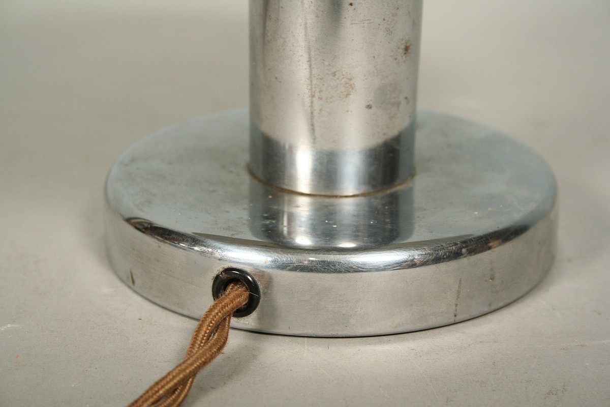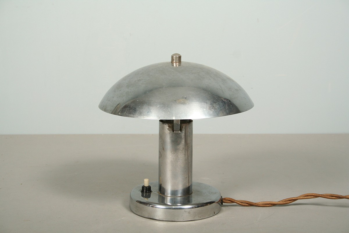 lampička na stolek ve tvaru hříbku s možností naklánění stínidla, funkcionalismus, pochromovaný kov, vše původní včetně elektroinstalace, neleštěno, 30. léta 20. století, 19 x 19 cm