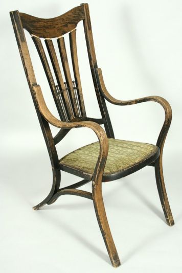 křeslo z ohýbaného dřeva s mosaznými doplňky, nerestaurováno, značeno Thonet