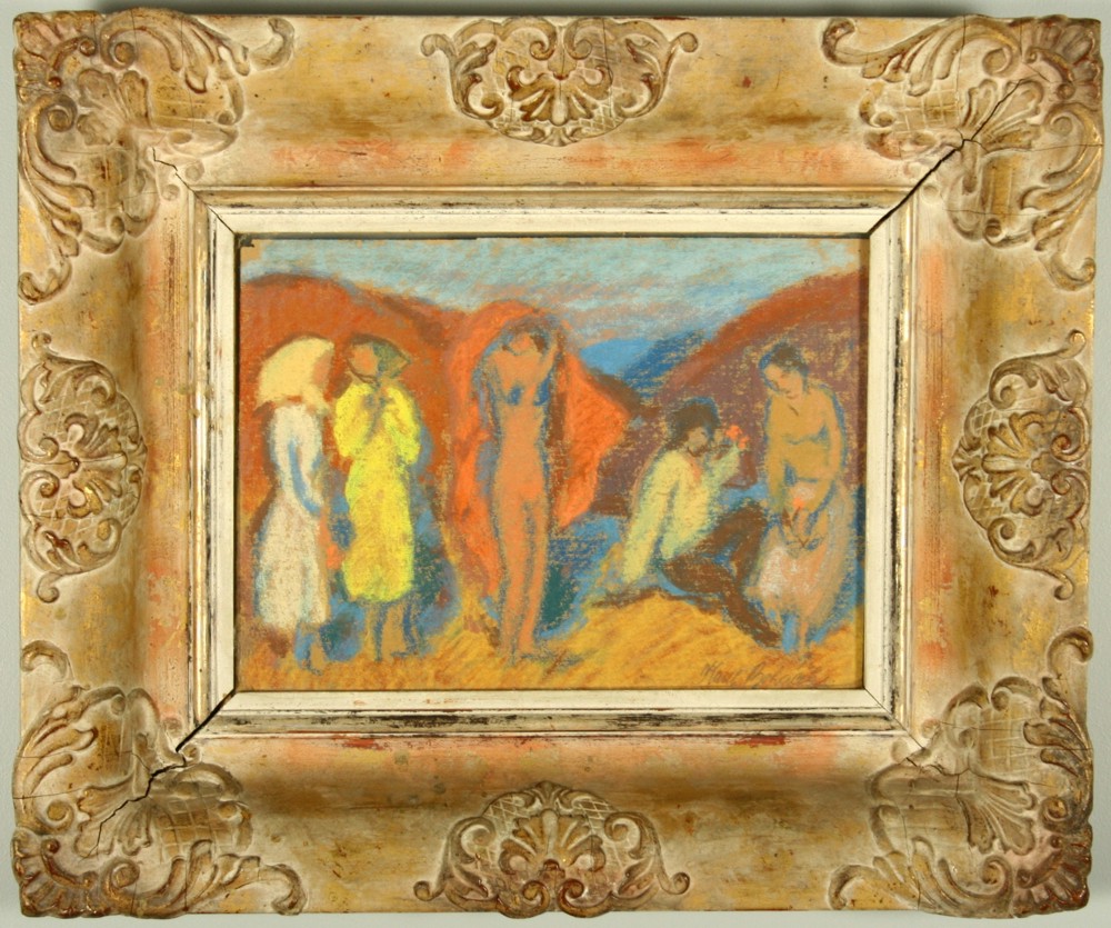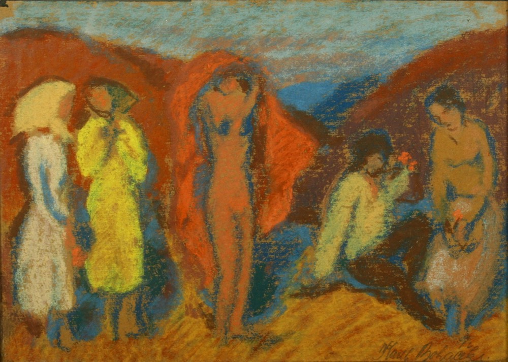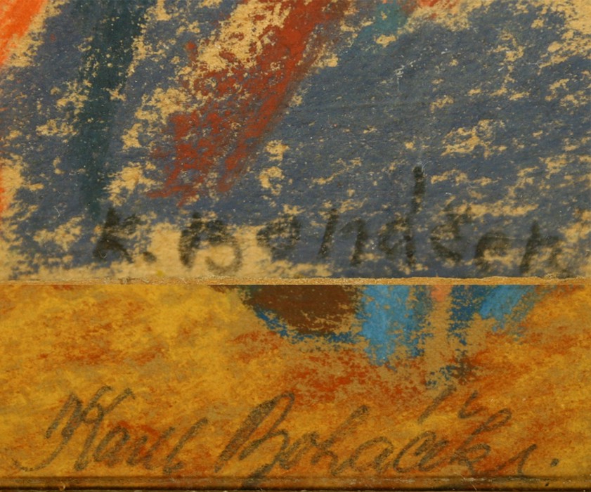Oboustranný pastel a křídy na papíře,  ve výřezu 22,5 x 31 cm s rámem 42,5 x 52,5 cm, podepsáno vpravo dole tužkou Karel Boháček, rámováno v původním rámu pod sklem