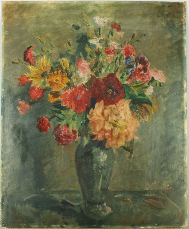 obraz kytice, olej na lepence, autor Emil Tylš, podesáno ze zadu s datací Emil Tylš Bugét 1937, nerámováno