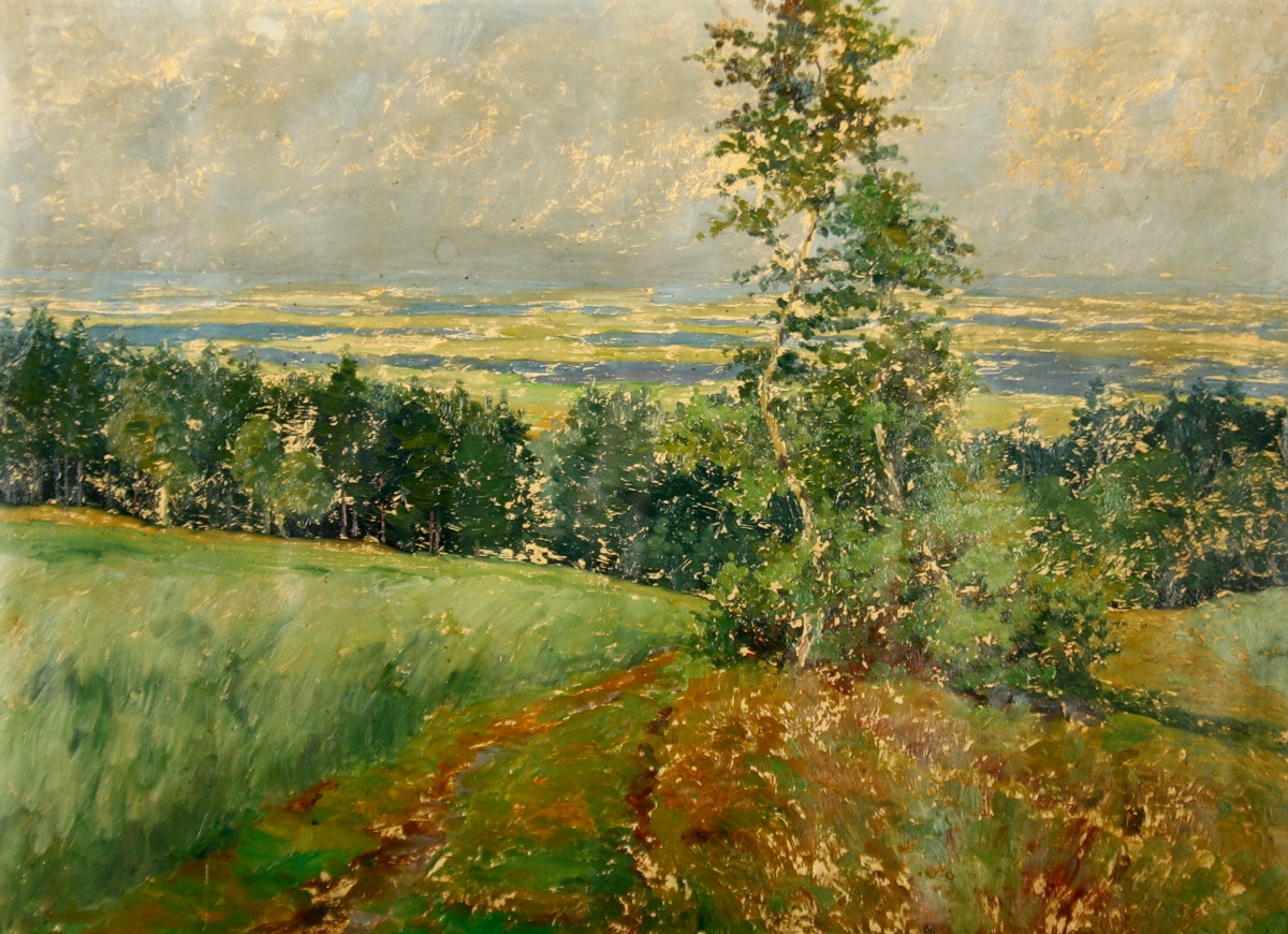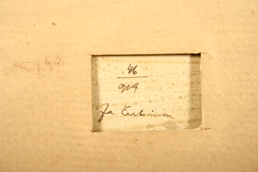 olej na lepence, ve výřezu 32 x 42 cm s rámem 47 x 57 cm, autor Karel Beneš, podepsáno vlevo dole K. Beneš na zadní straně přípis s věnováním Za Čertovinou / v Hlinsku 15.9.1919, rámováno v původním rámu pod sklem