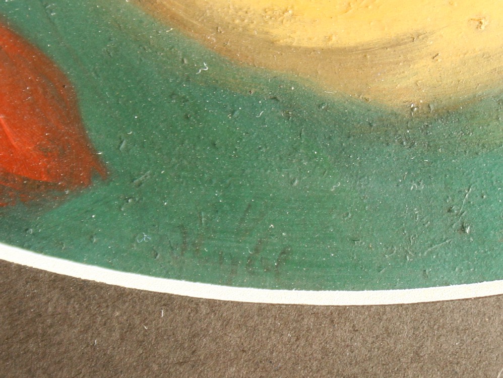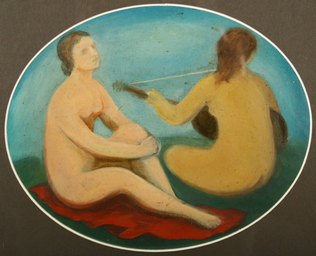 dva dívčí akty hrající na kytaru, olej na lepence, autor Karel Hýbl, podepsáno dole uprostřed, rámováno v oválné paspartě a zdobeném rámu pod sklem