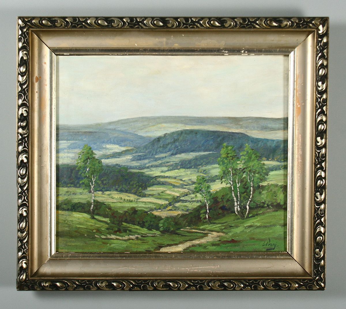 rozhled do krajiny, olej na plátně, ve výřezu 33 x 38,5 cm s rámem 45 x 50,5 cm, autor L. Vraný, podepsáno vpravo dole, rámováno ve zdobeném rámu