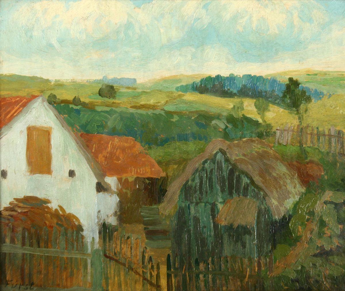 vesnické stavení v krajině, olej na lepence, ve výřezu 27,5 x 33,5 cm s rámem 43 x 49 cm, autor Jinřich Fürst, pdepsáno vlevo dole Fürst, rámováno v původním rámu pod sklem, obraz byl vystavený v Galerii v.u. v Náchodě na výstavě Mařákovci.... pod číslem 32 ze soupisu děl, výstavní razítko na zadní straně, barevně publikován v knize Mařákovci.... strana 45