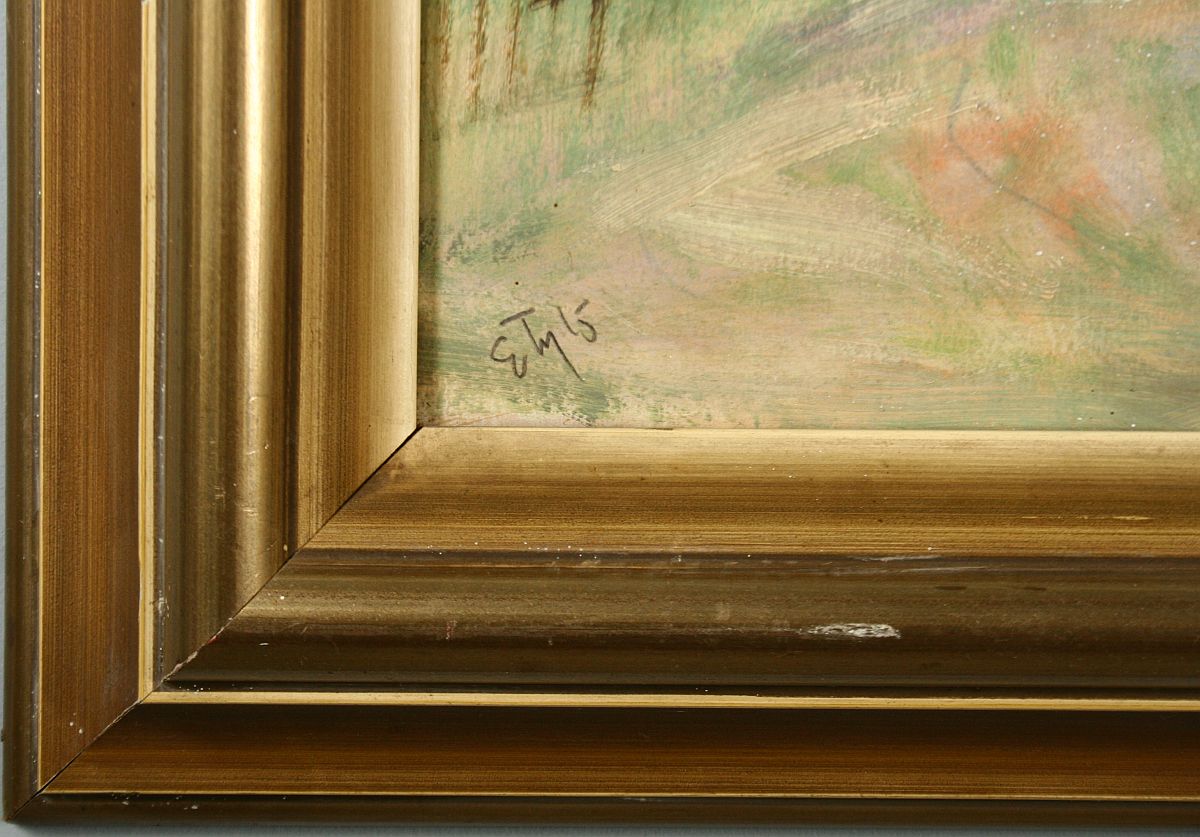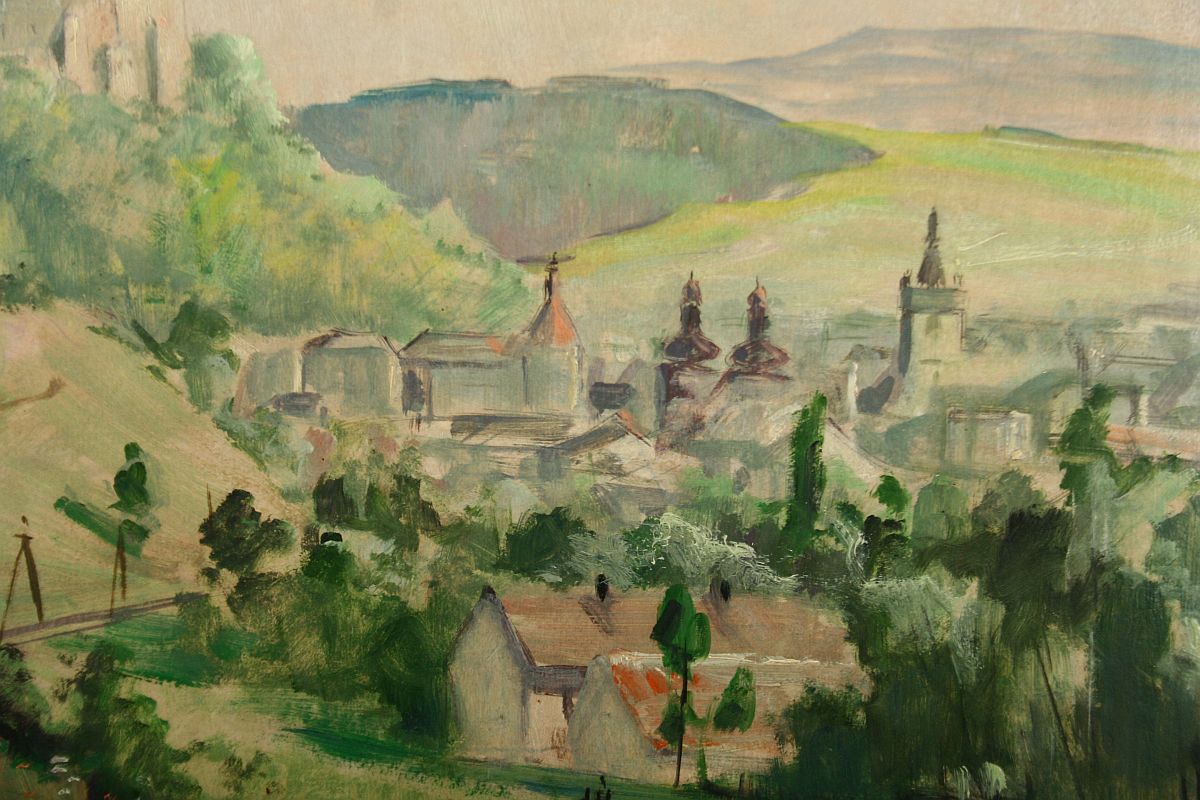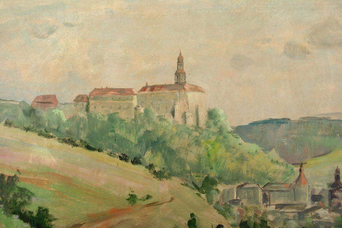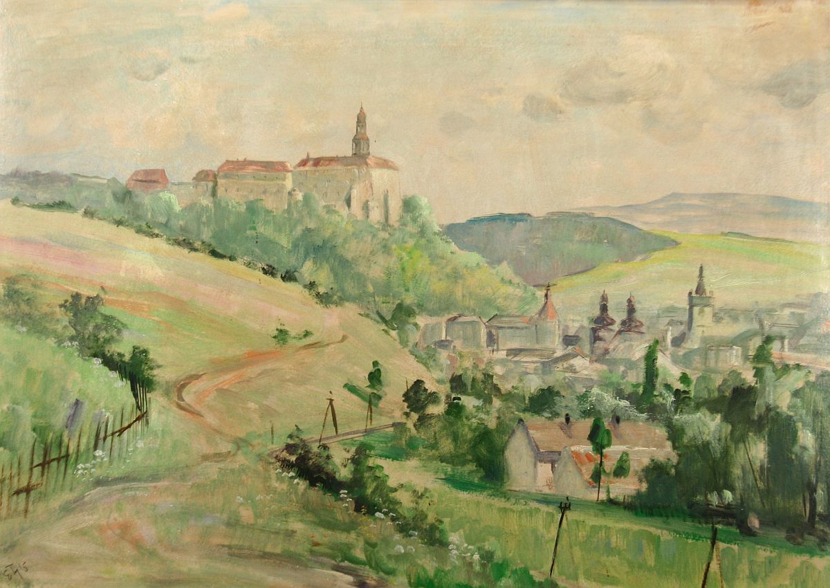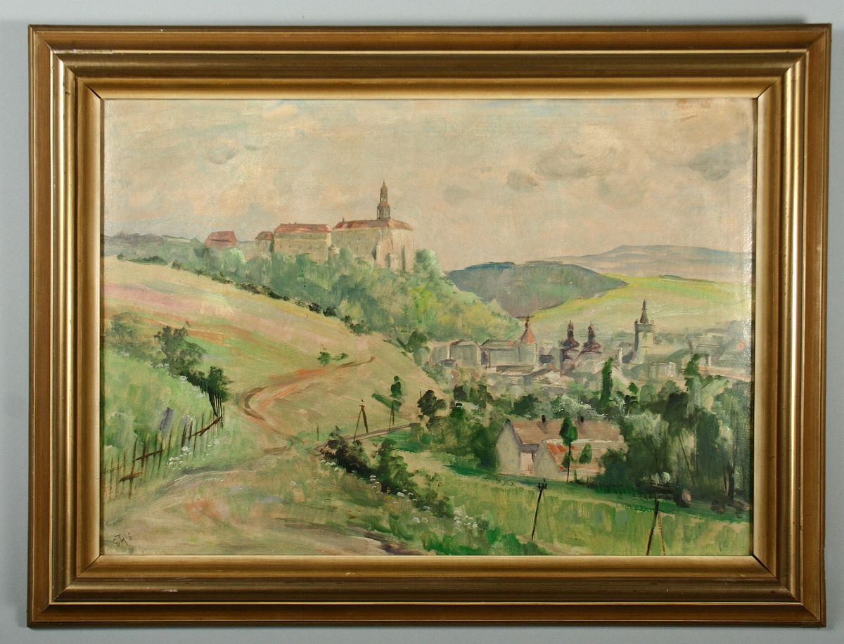 zámek nad městem Náchod, olej na lepence, ve výřezu 48 x 68 cm s rámem 64 x 84 cm, autor Emil Tylš podepsáno vlevo dole E. Tylš, rámováno v původním částečně poškozeném rámu
