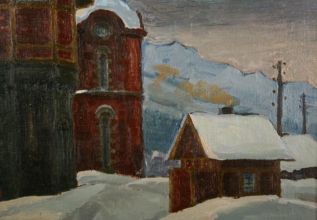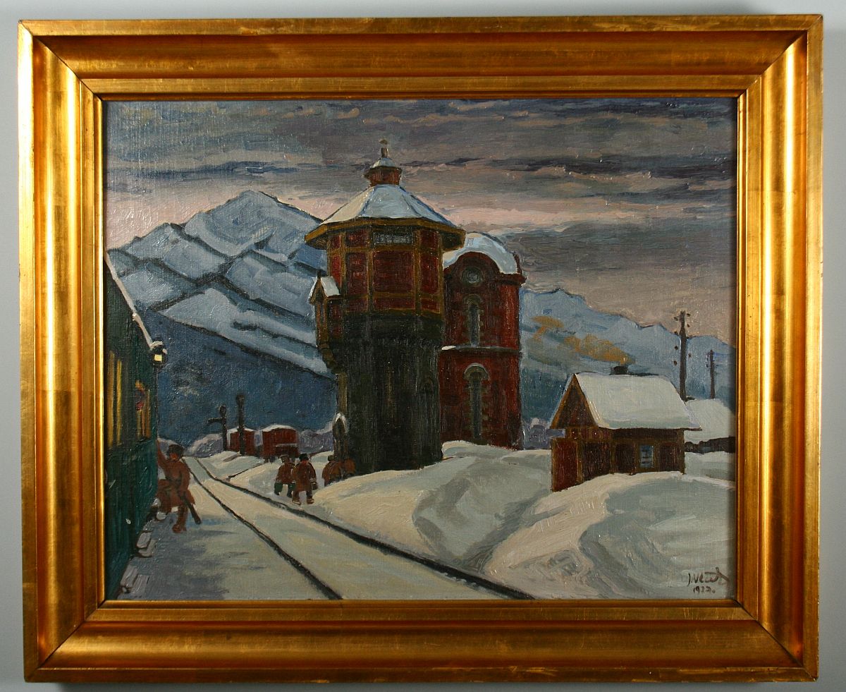 legionáři nastupující do vlaku v zasněžené krajině Zakarpatské Rusi, olej na plátně, ve výřezu 58,5 x 73,5 cm s rámem 76 x 91 cm, podepsáno vpravo dole J. Vlček, na zadní straně napínacího rámu je zaznamenáno několik dat,rámováno v původním částečně poškozeném rámu