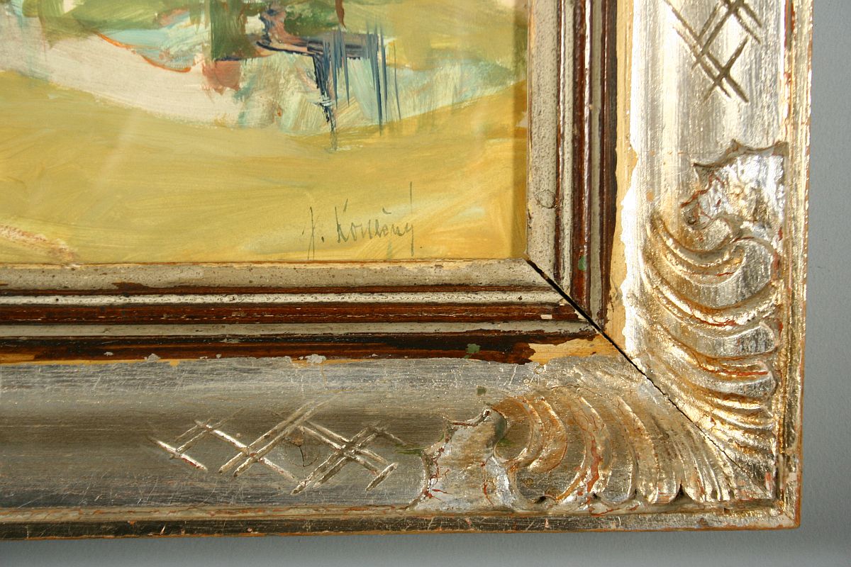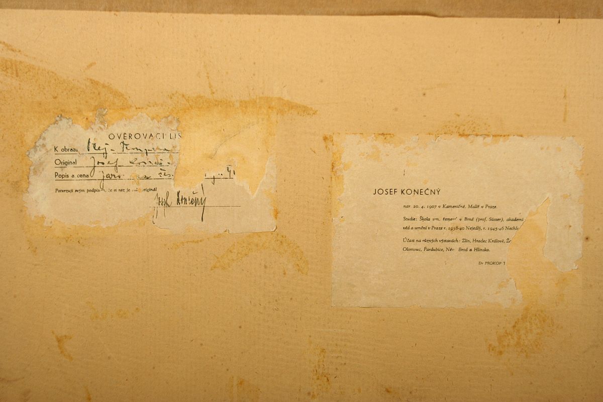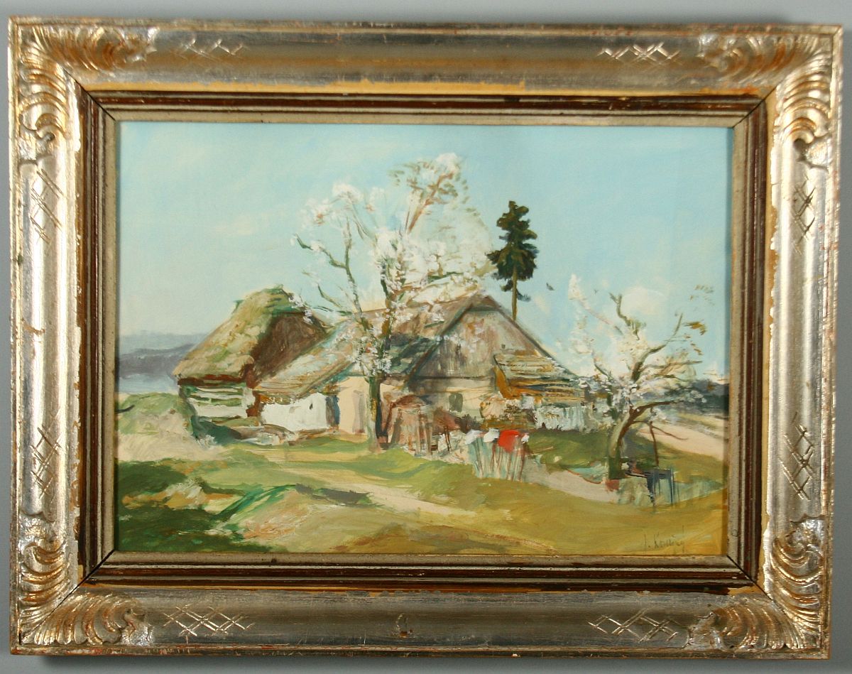 chaloupka s předzahrádkou s rozkvetlými stromy, tempera na lepence, ve výřezu 34 x 49 cm s rámem 50 x 65 cm, podepsáno v pravo dole J. Konečný, na zadní straně částečně dochovaný ověřovací list a jemnný štítek, rámováno v původním řezaném rámu pod sklem