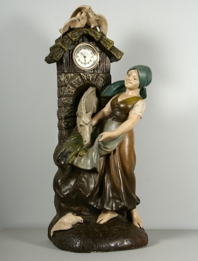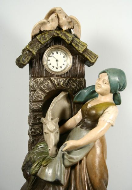 hodiny s figurou dívky krmící koně, patinovaná sádra, 68 x 25 x 20 cm, průměr fiferníku ? cm hodinový stroj značky?