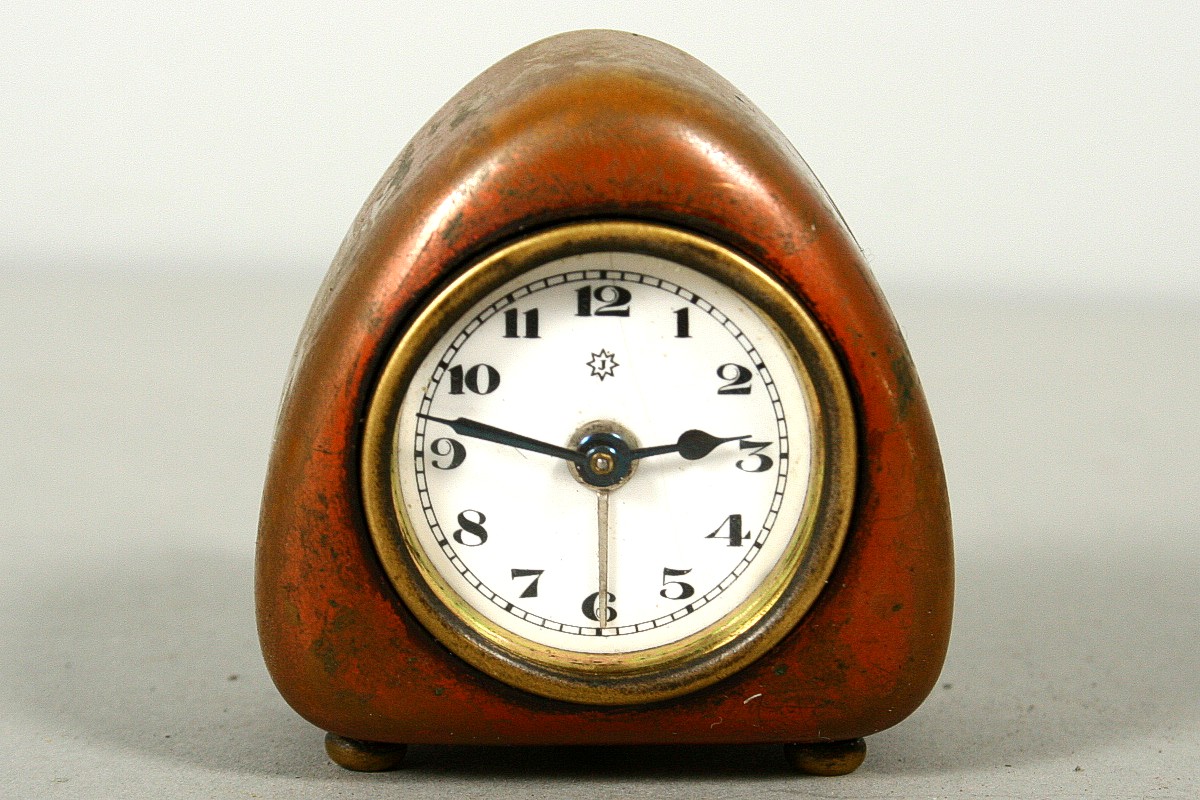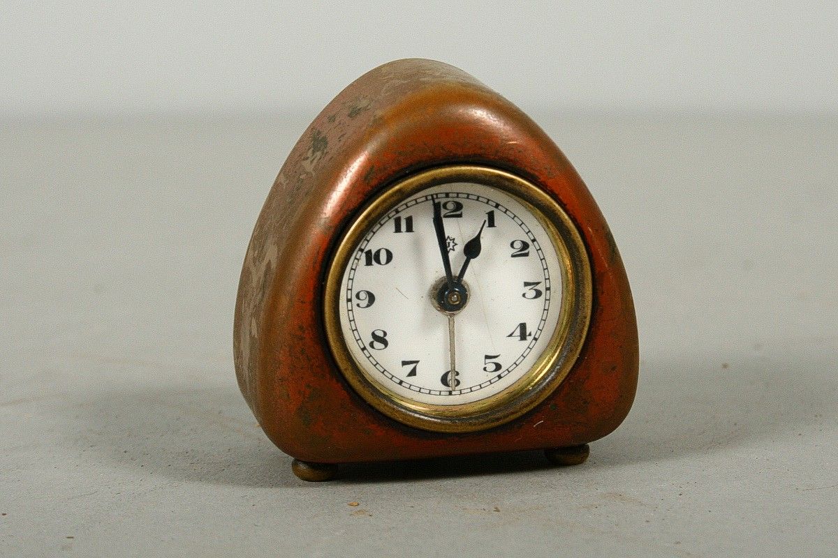 stolní budíkček v mosazném tónovaném pouzdře, značky junghans, stroj funkční, 5,5 x 5 x 4,5 cm