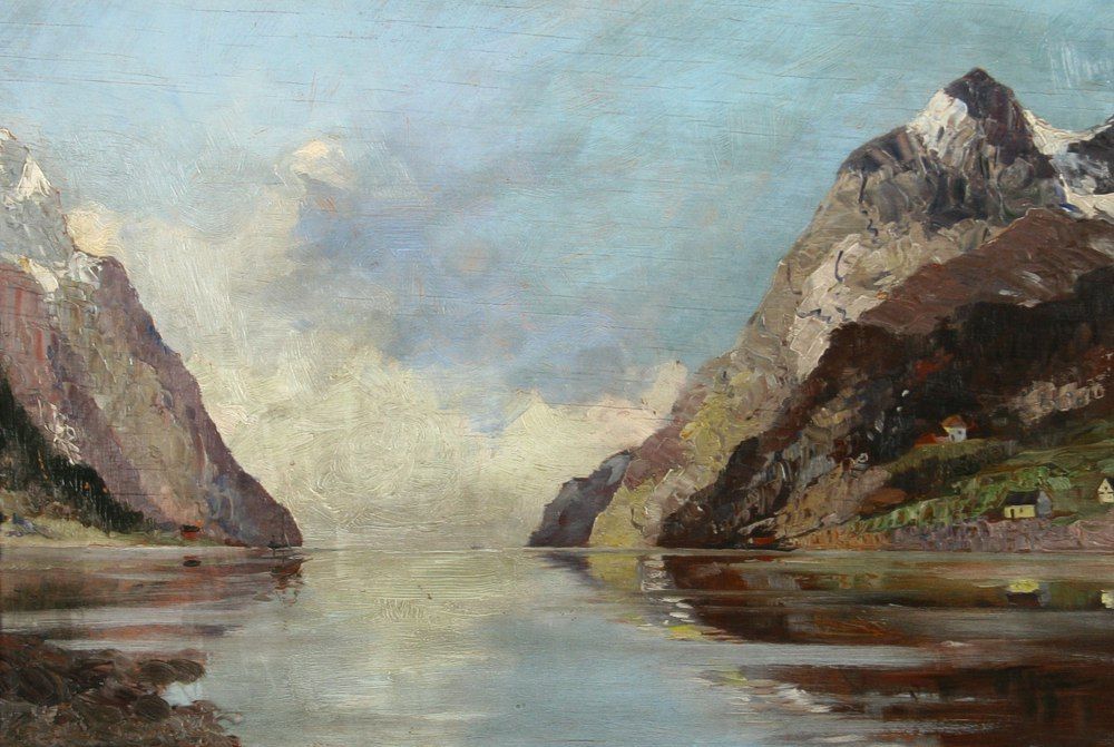 obraz norského fjordu, olej na dřevěné desce 35 x 50 cm s rámem 42 x 58 cm, autor Alois Tužínský, podepsáno vlevo dole Tužinov Tužínský, na zadní straně autorský přípis tužkou s dedikací a štítek rámaře, rámováno v původním černém rámu