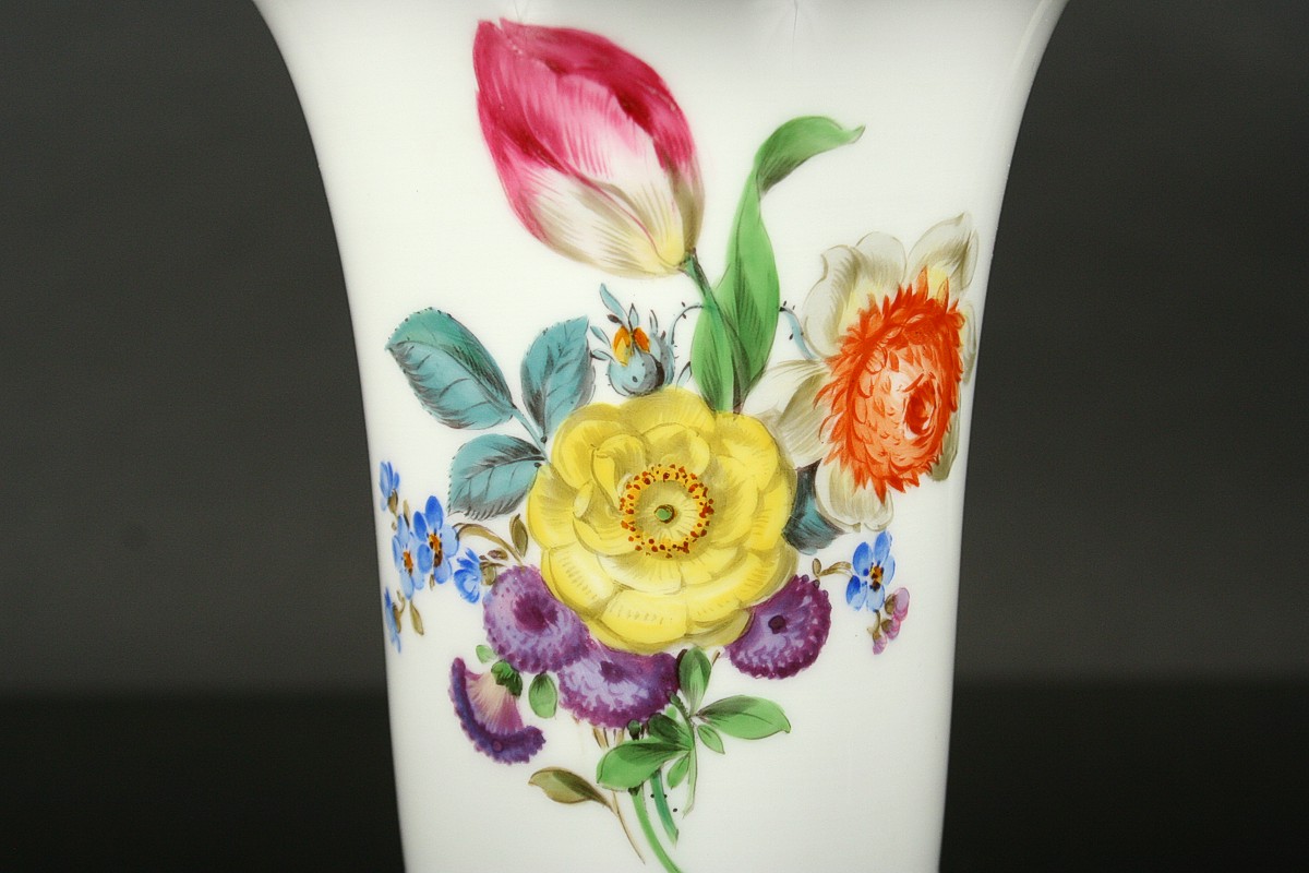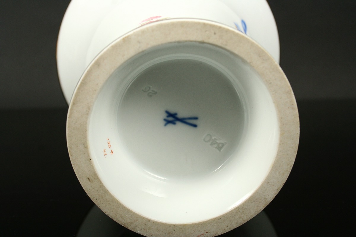 váza s pestře malovaným květinovým motivem a zlacenými linkami, malovaný zlacený bílý porcelán, 13,5 cm, na podstavě značen Míšeň modře pod glazurou znakem křížených kordů tlačenými čísly 540, 26, a červeně pasanými 130, 42