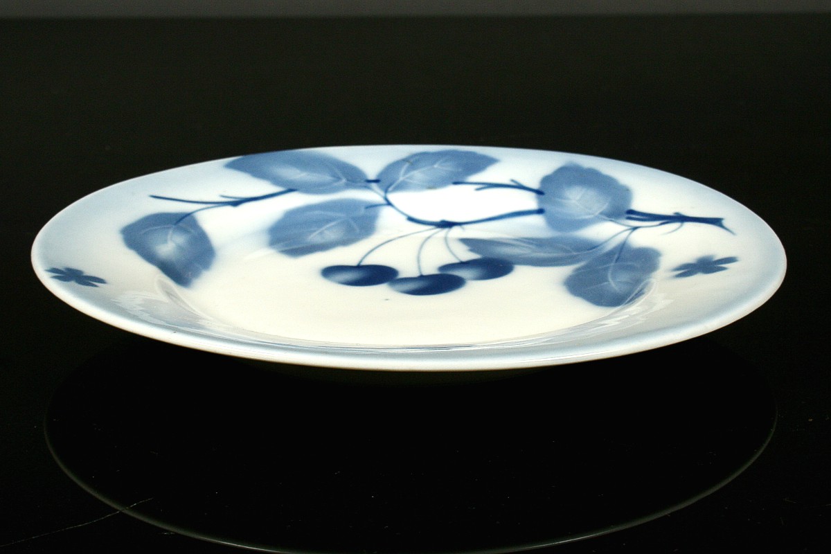 talíř zdobený motivem modrých třešní pod glazurou, porcelán, značený Teplitz, o průměru 19 cm