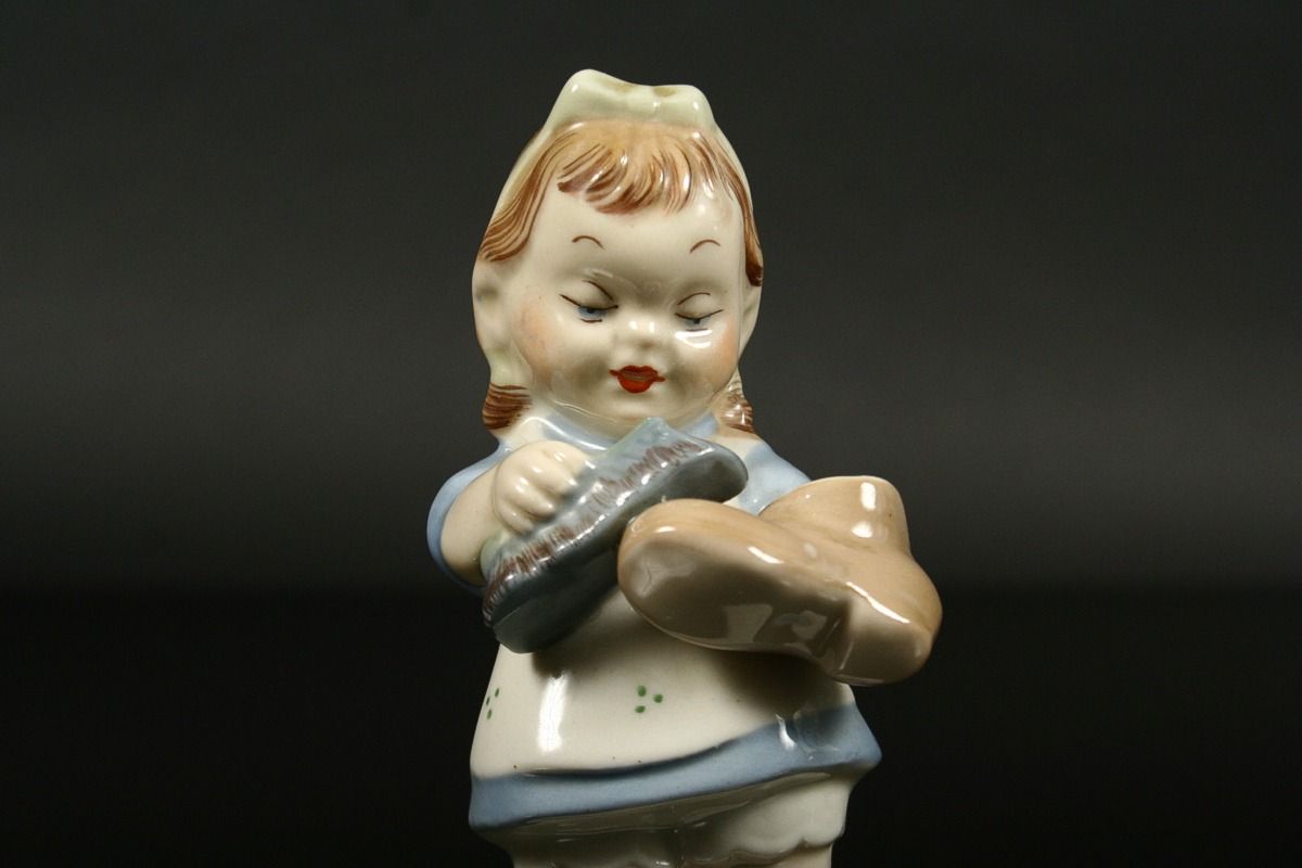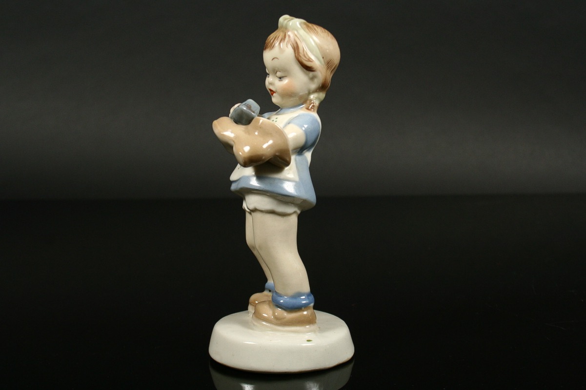 holčička v modrých šatečkách kartáčující botu, malovaný bílý porcelán, na zadní straně soklu značeno Elly Strobach, na podstavě značeno tlačenou číslicí a pod glazurou psaným znakem k, produkce Royal DUX Duchcov, 14,5 x 6 x 6 cm