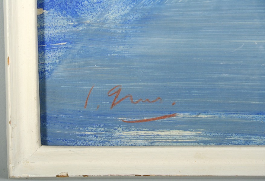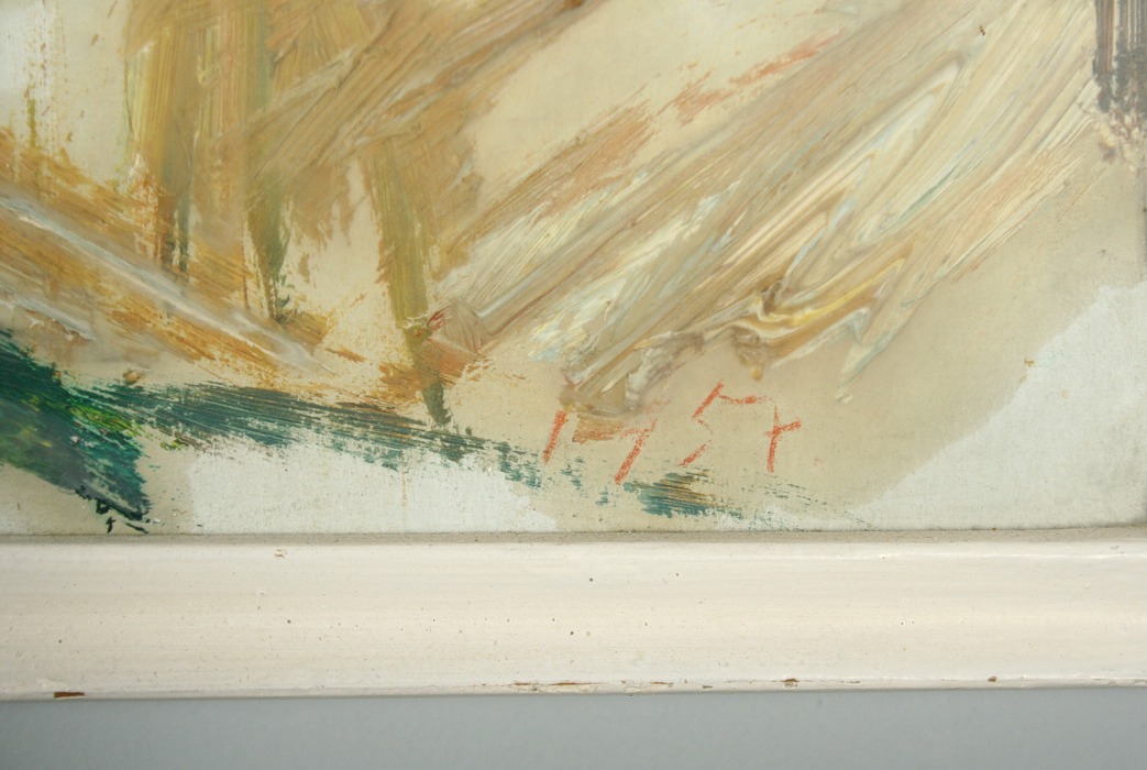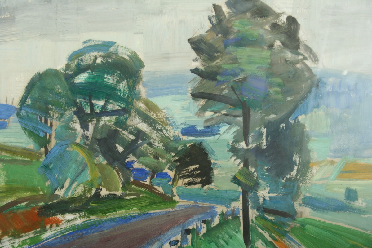 cesta krajinou, olej / lepenka, 47 x 62 cm, autor Jaroslav Grus, podepsáno vlevo dole J. Grus, vpravo datace 1957, rámováno v původním rámu pod sklem, získáno z ateliéru autora v 70. létech