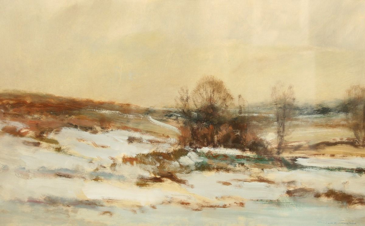 předjarní krajina se stromy, tempera na papíře, ve výřezu 31,5 x 44 s rámem 38 x 51 cm, podepsáno vpravo dole Josef Vondráček, rámováno v původním rámu s paspartou pod sklem