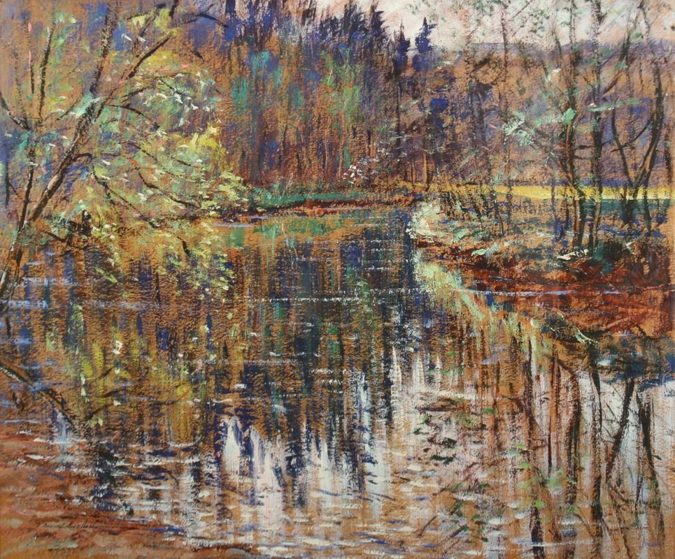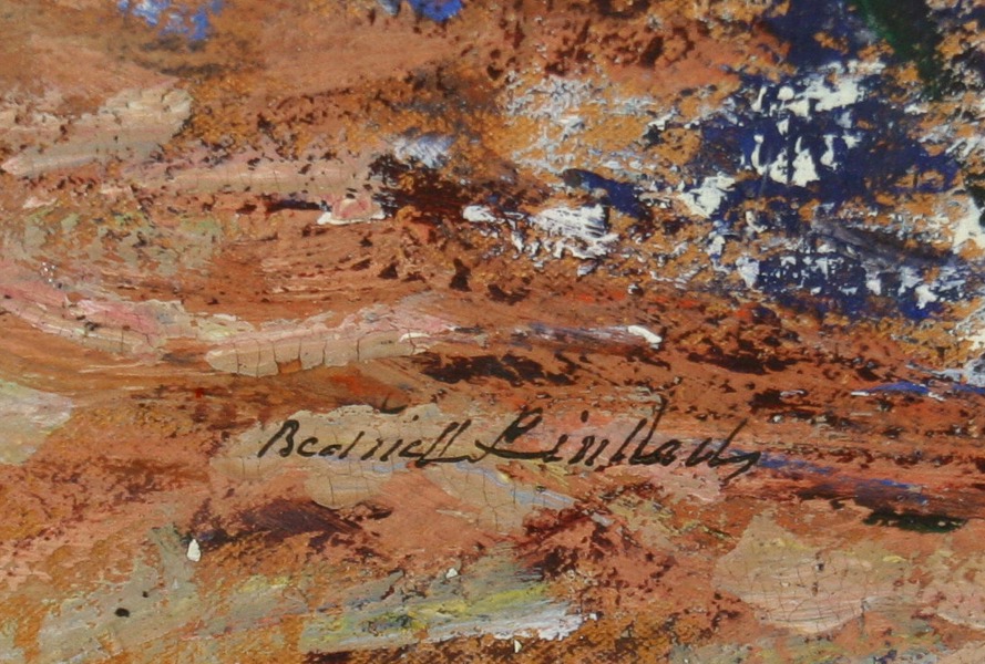 obraz krajiny s řekou Úpou protékající Babiččíným údolím v Ratibořicích, olej na lepence, lepenka 50 x 59,5 s rámem 61,5 x 71,5 cm, podepsáno vpravo dole Bedřich Linhart, rámováno v původním rámu pod sklem