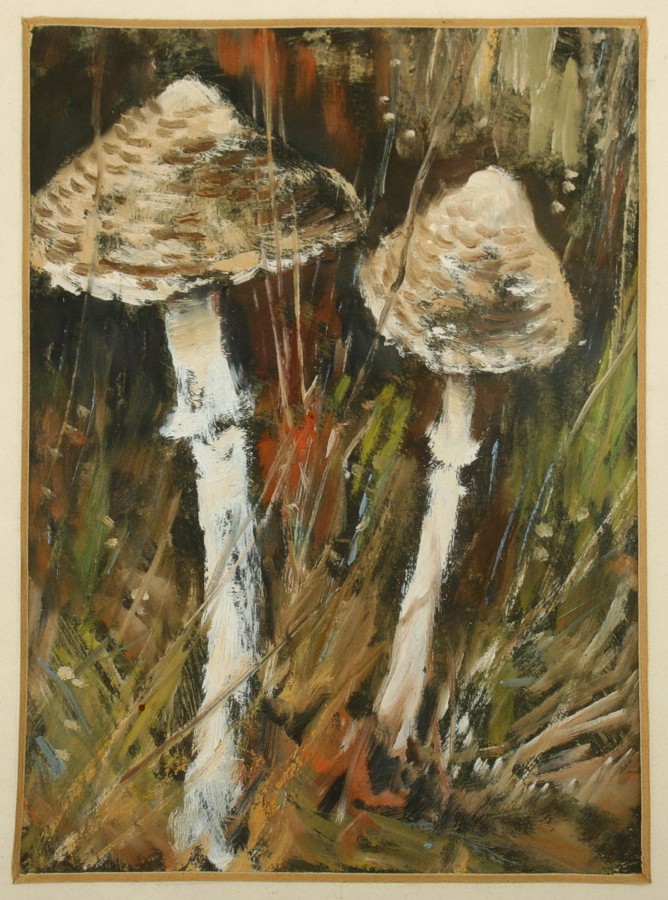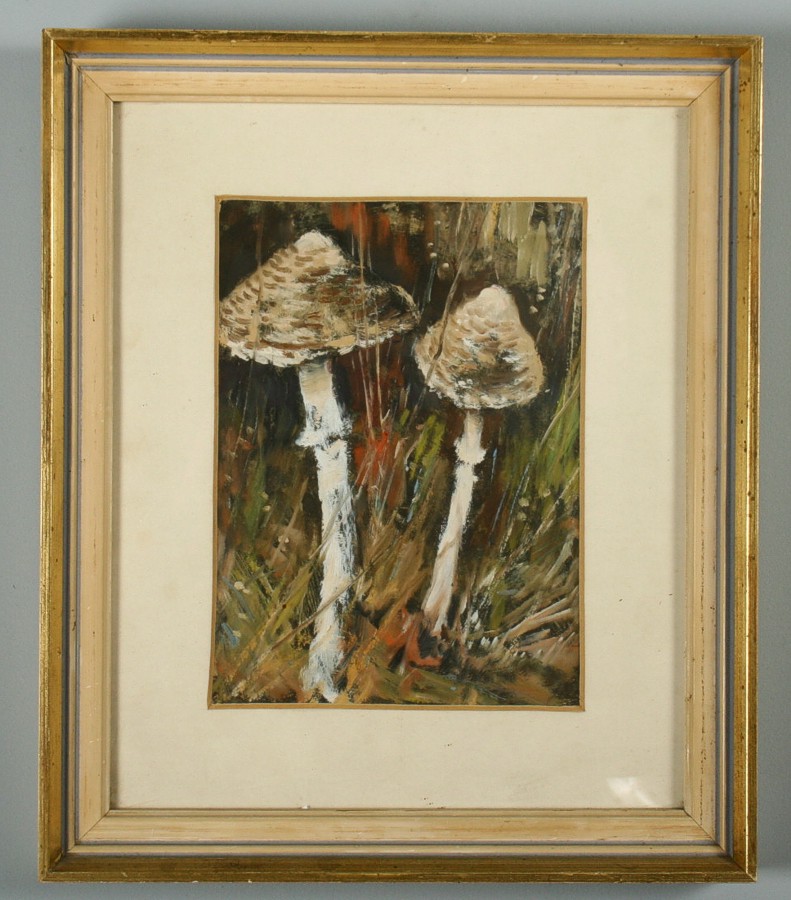 houbičky, olej na kartonu, ve výřezu 22 x 16 s rámem 37 x 31 cm, podepsáno vpravo dole tužkou špatně viditelné J. Vondráček, rámováno v původní paspartě a rámu pod sklem