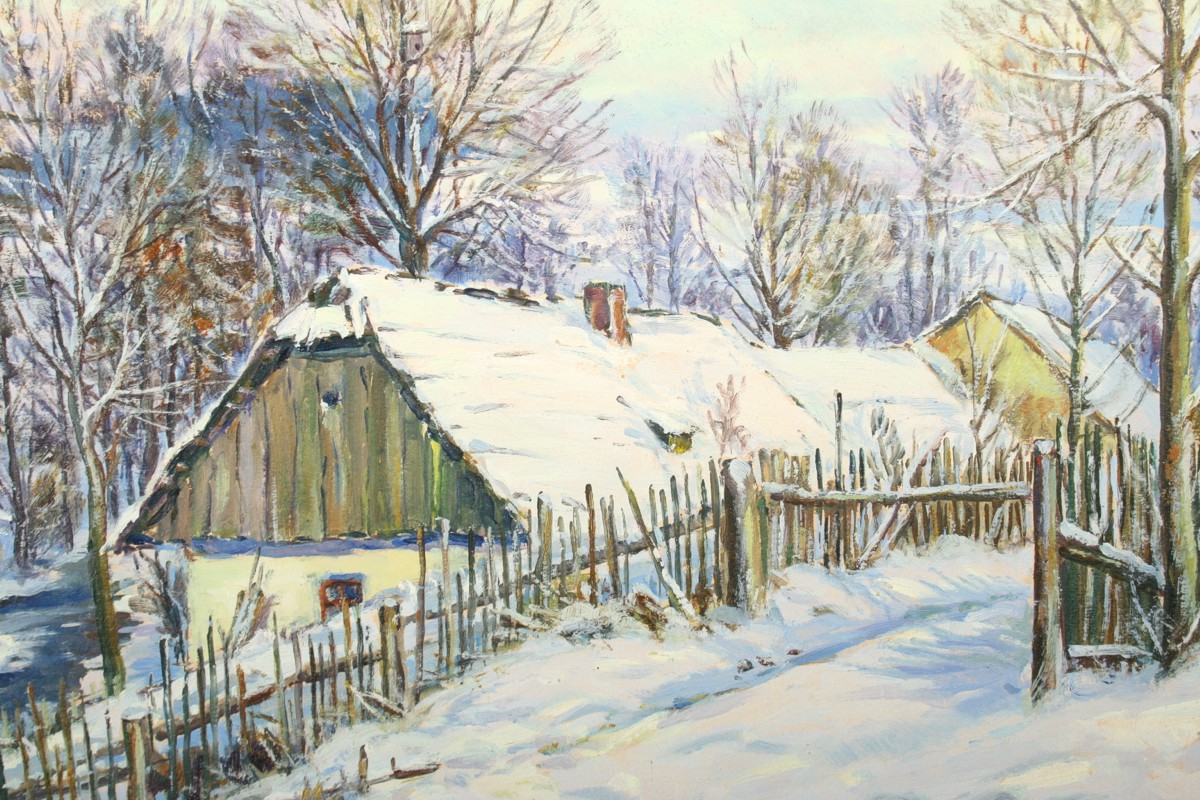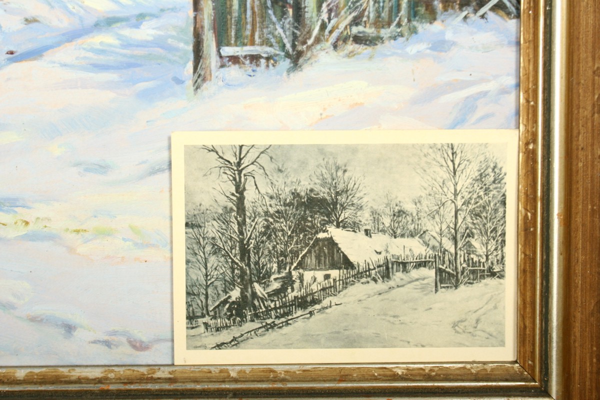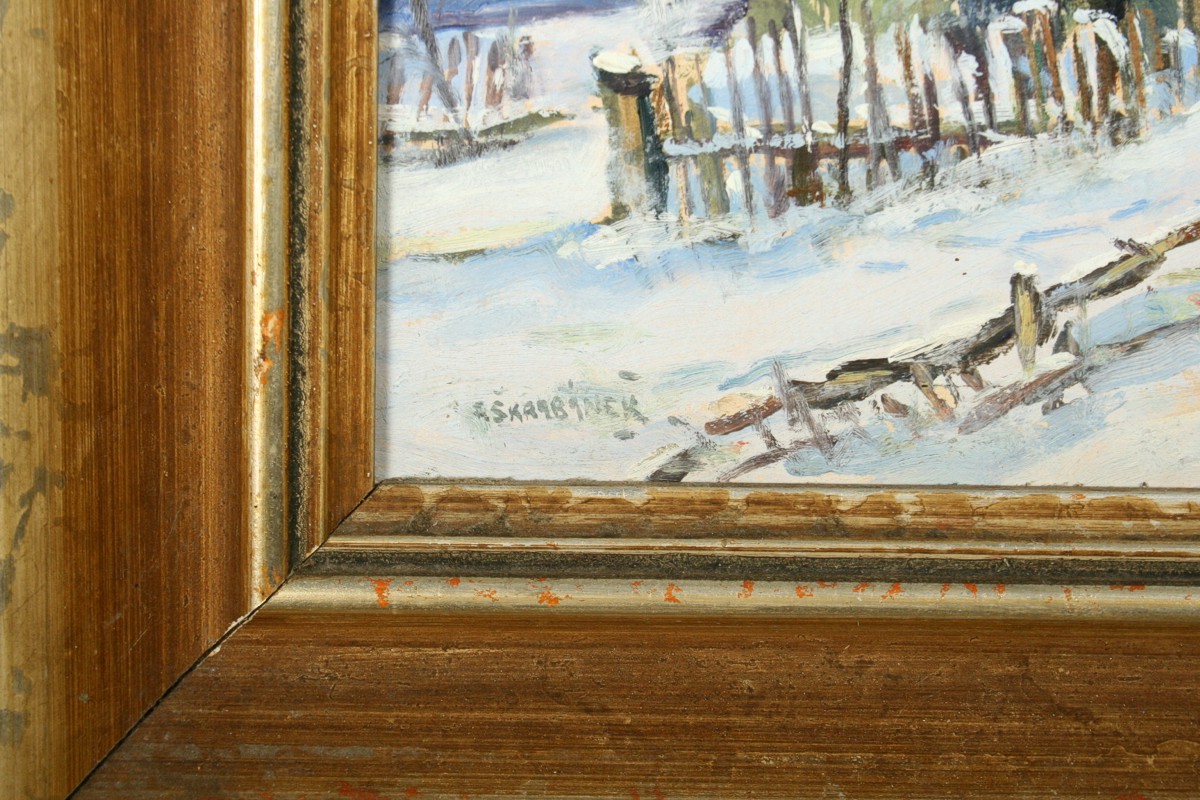 obraz chlupy v zimě ze Slavníče, olej na lepence 50 x 66 cm s rámem 66 x 82 cm, autor František Škrabánek podepsáno vlevo dole, bravůrní ukázka zvládnuté zimy v podání malíře Vysočiny a žáka prof. Engelmüllera, tento obraz je publikovaný na pohlednicích vydaných nákladem Fr. Riedla v Německém Brodě, na zadní straně autorský přípis a etiketa s číslem, rámováno pod sklem