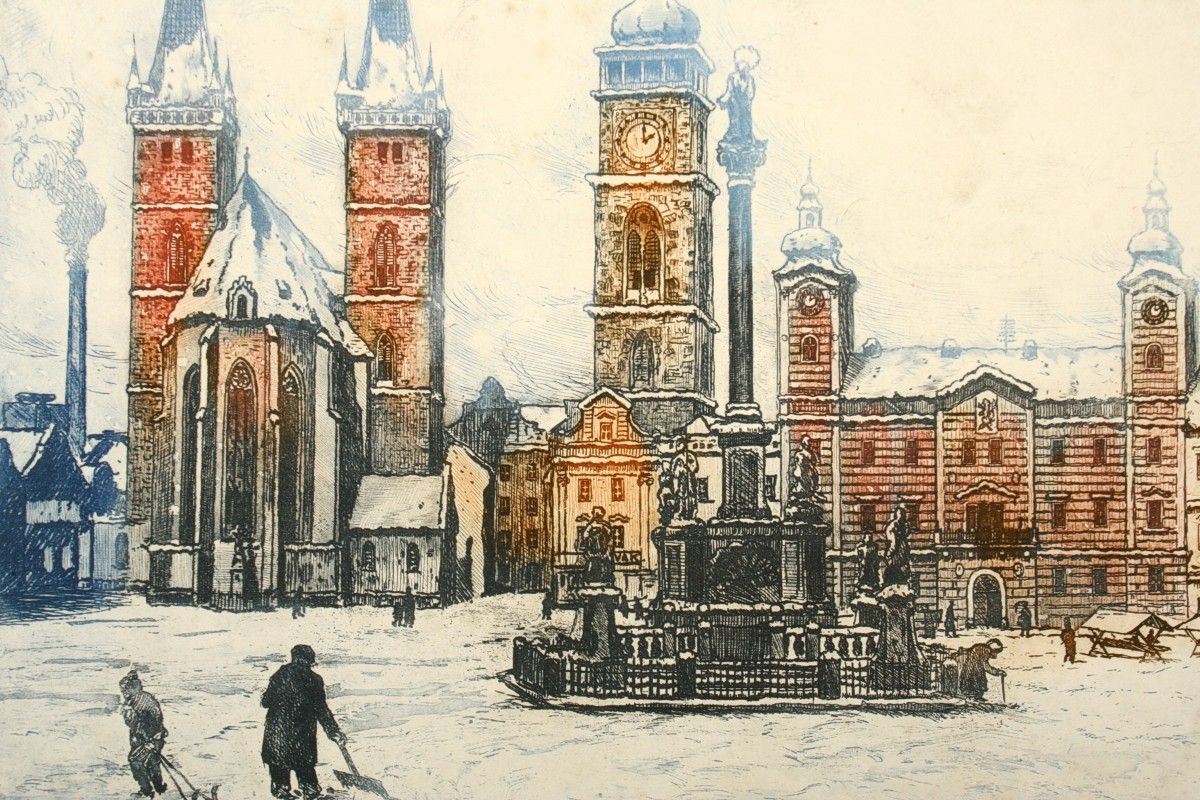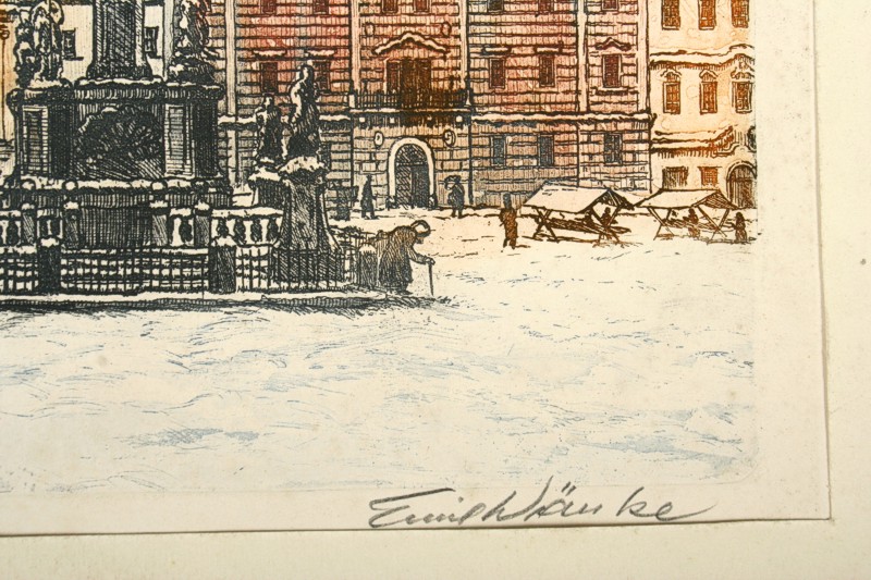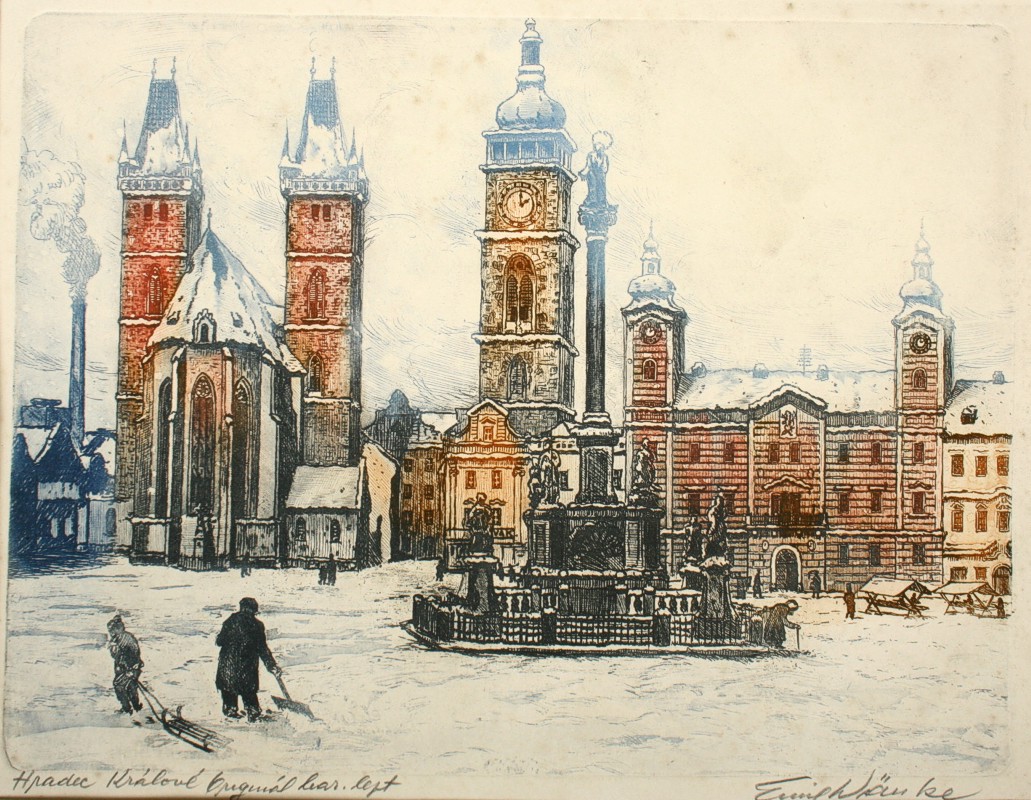 náměstí v Hradci Králové, barevný lept na papíře, tisková plocha 21 x 27,5 cm autor Emil Wänke, podepsáno tužkou dole Emil Wänke, volný list v paspartě