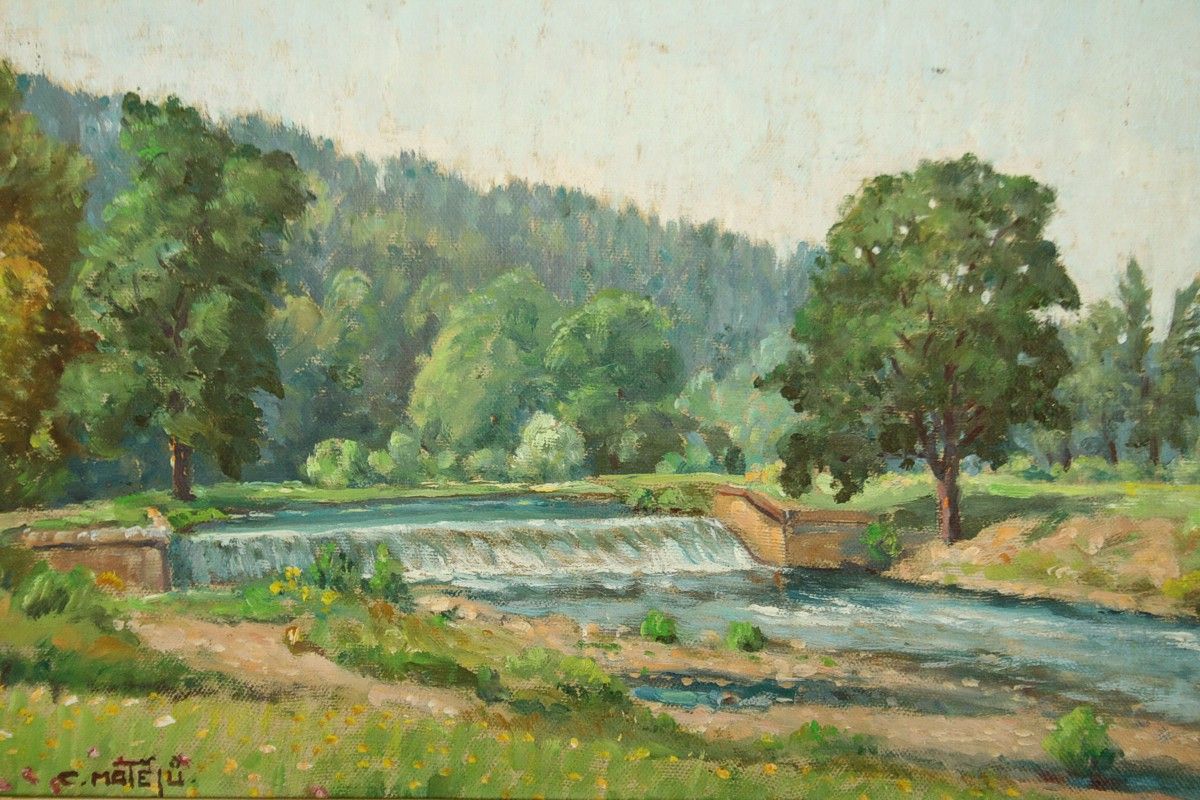 obraz splavu v Babiččině údolí v Ratibořicích, olej na plátně adjustovaném na kartonu, 24,5 x 34,5 cm s rámem 38 x 48 cm, autor Calestýn Matějů, podepsáno vlevo dole C. Matějů, rámováno v původním rámu