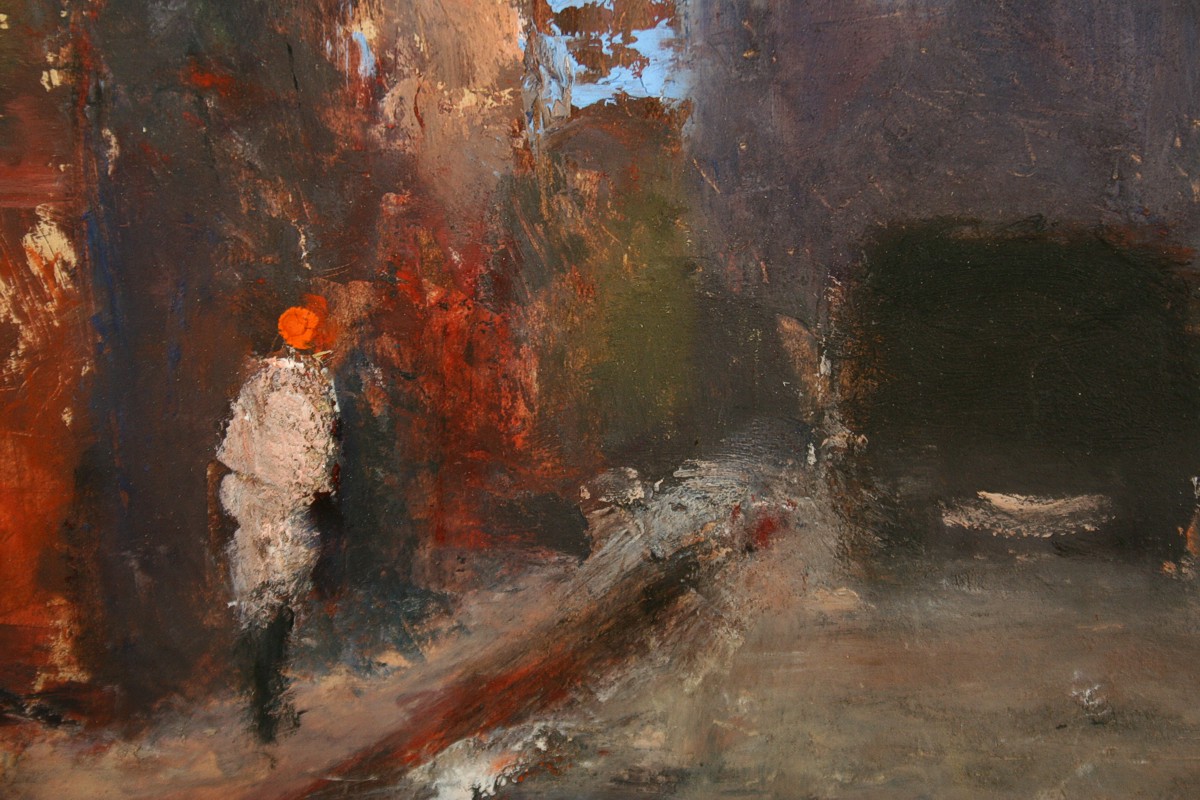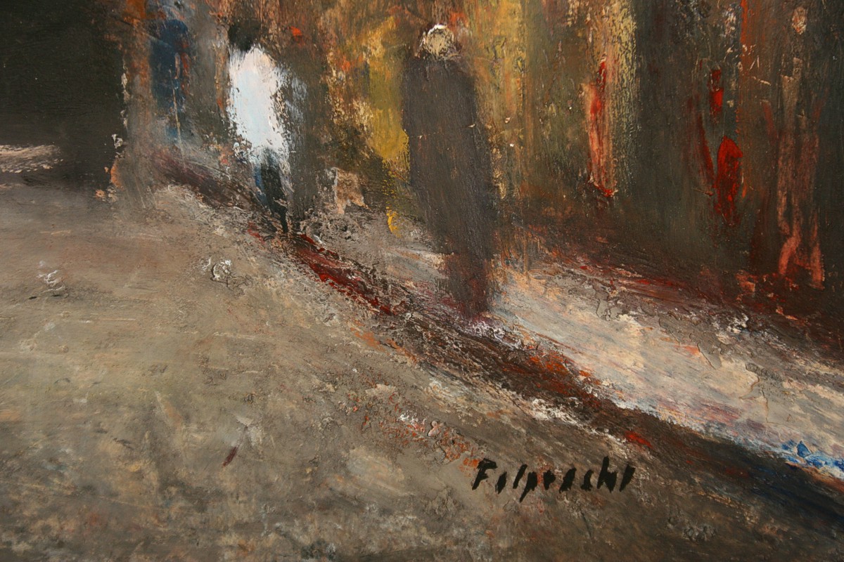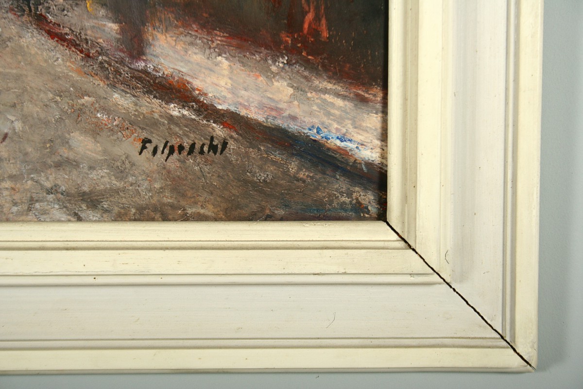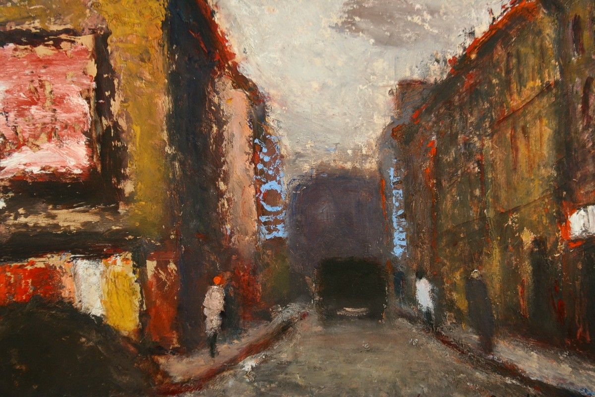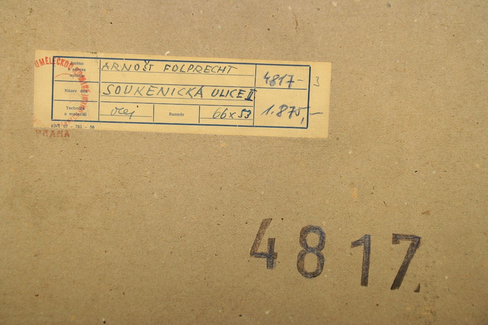obraz Soukenické ulice v Praze, olej na lepence, 47 x 66 cm s rámem 62,5 x 81,5 cm autor Arnošt Folprecht, podepsáno vpravo dole Folprecht, zezadu autorský štítek, rámováno v původním rámu