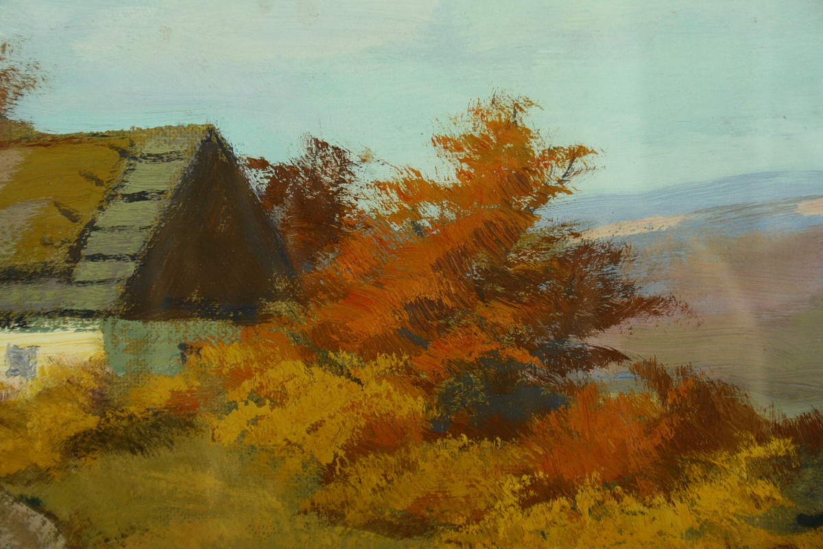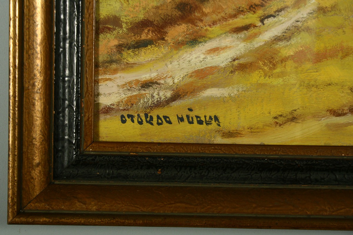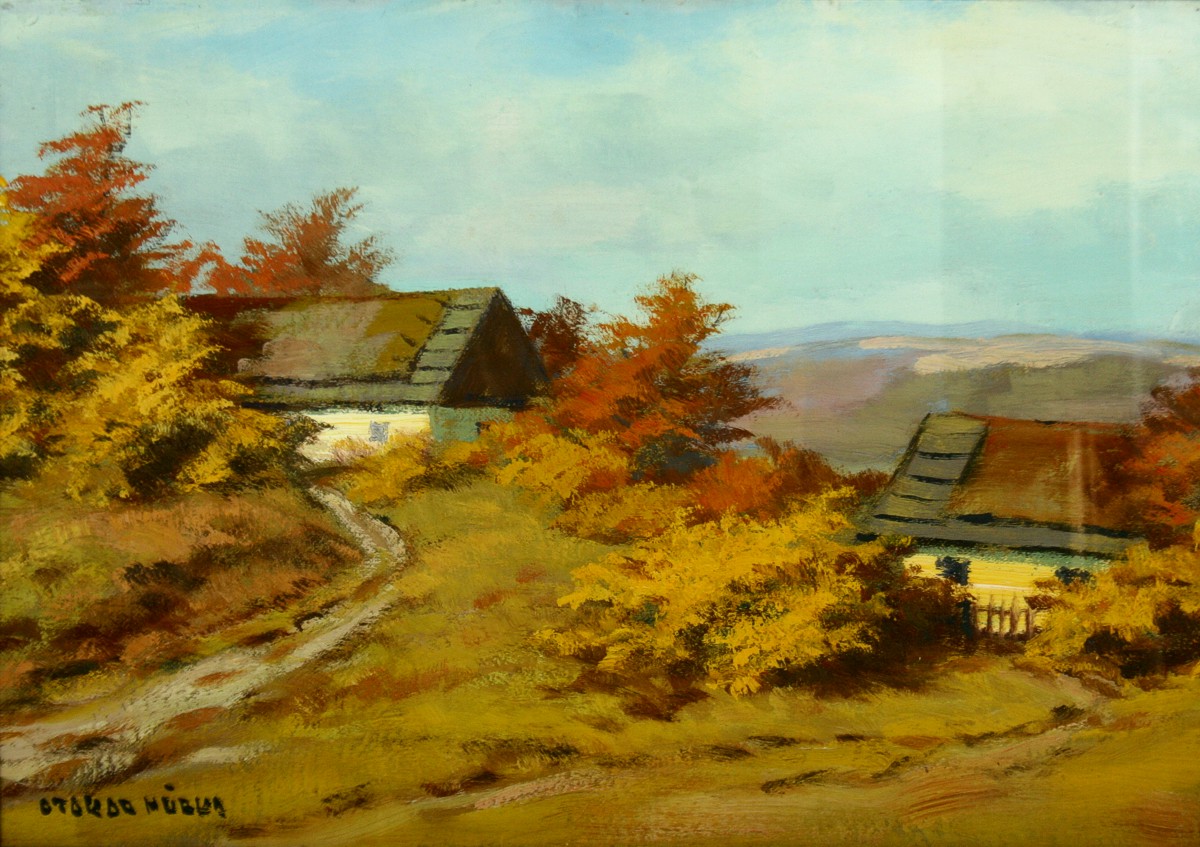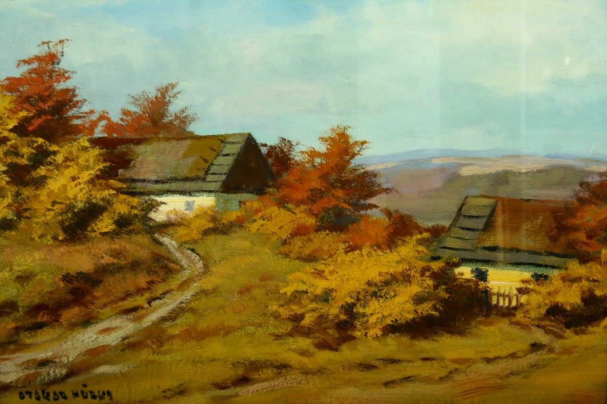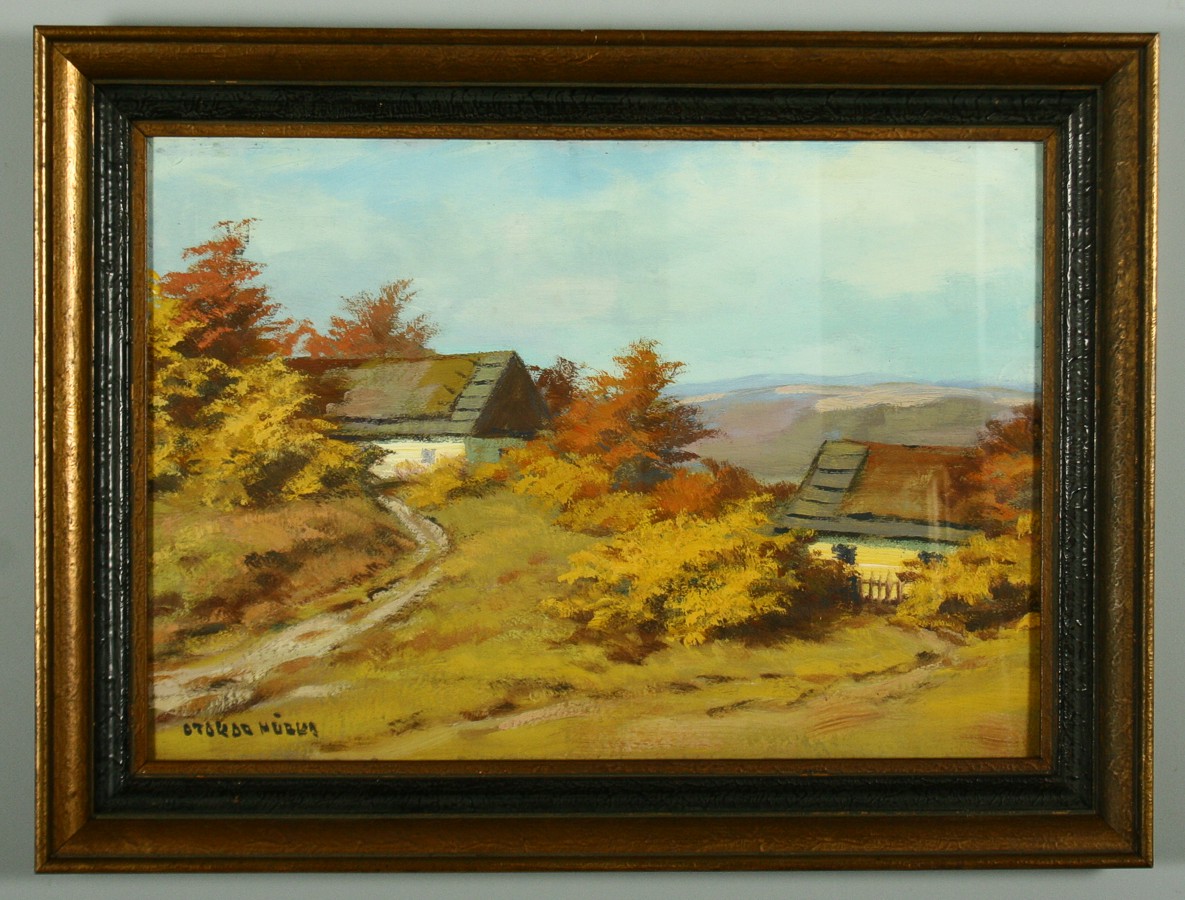 obraz chalupy v krajině, olej na lepence 34,5 x 50 cm s rámem 45,5 x 61 cm, autor Otakar Hůrka žák Kalvody, podepsáno vlevo dole Otakar Hůrka, rámováno v původním rámu pod sklem