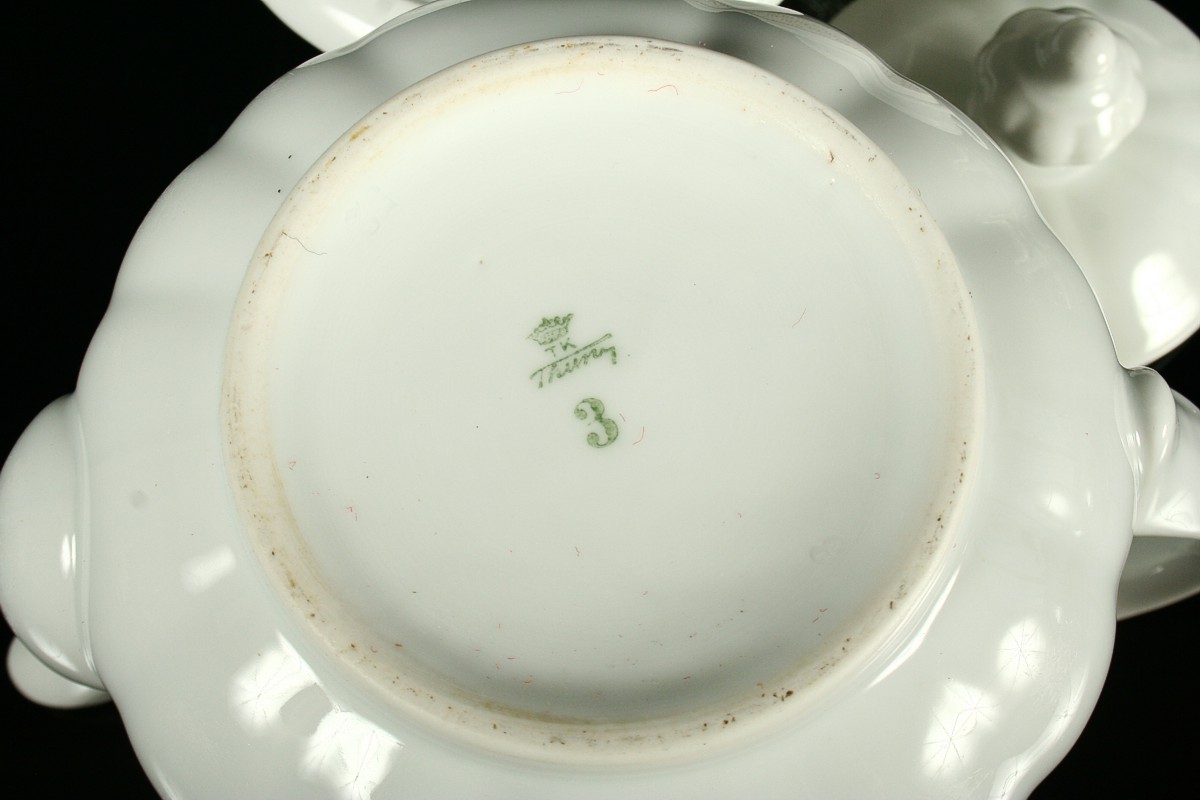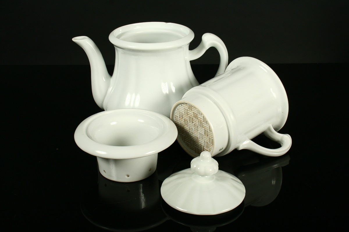 čajník porcelánová sestava konvice, sítko, louhovací odkapávač a víčko, bílý porcelán, značený tištěnou značkou Klášterec nad Ohří a číslem 3, výška 29 cm