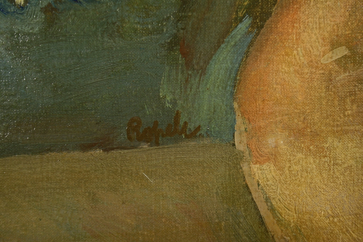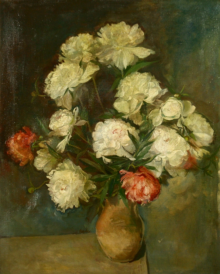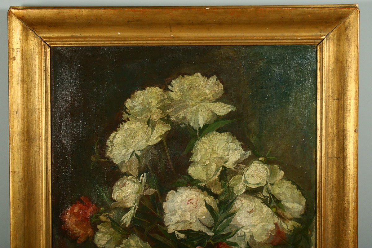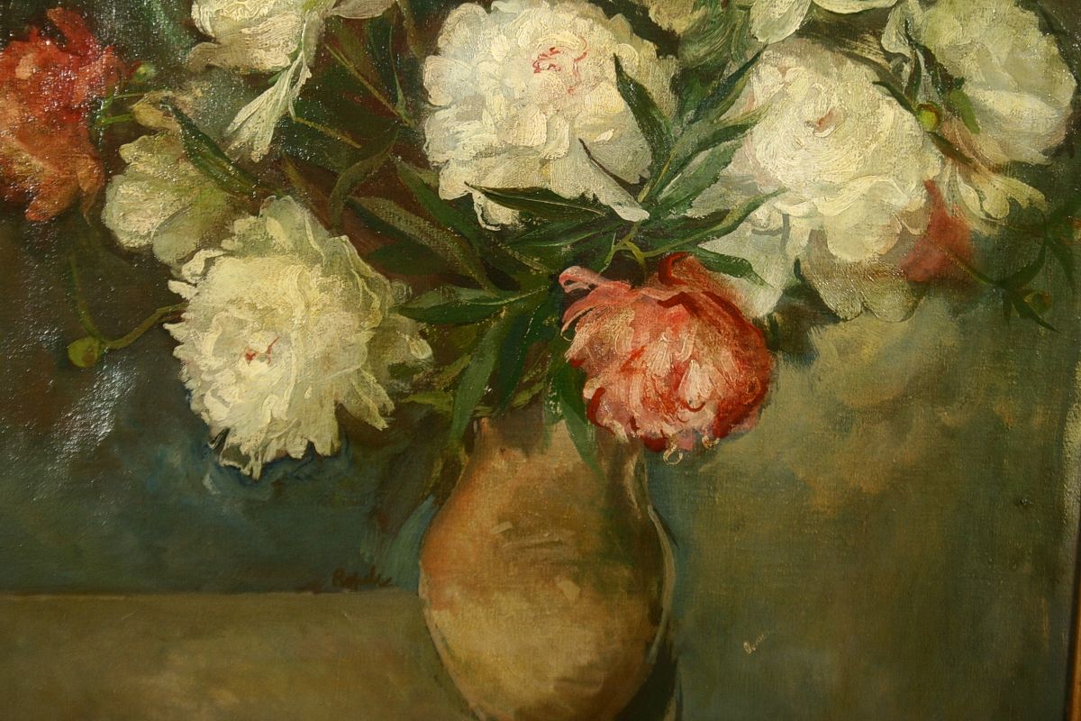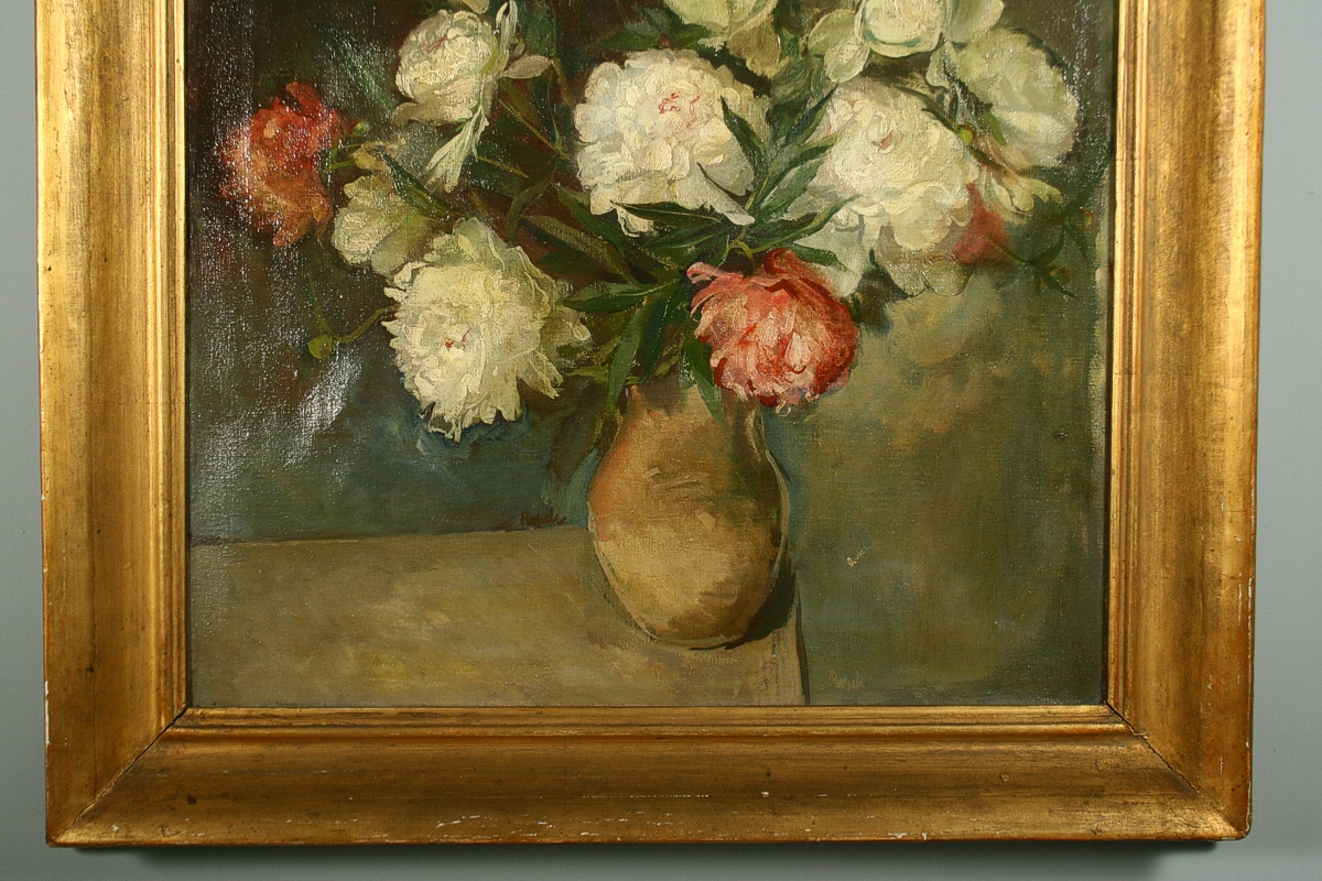 obraz kytice jiřin ve váze na kraji stolu, olej na plátně, 81 x 65 cm s rámem 99 x 84 cm, autor František Ropek, podepsáno v obraze u vázy Ropek, rámováno v původním zlaceném rámu