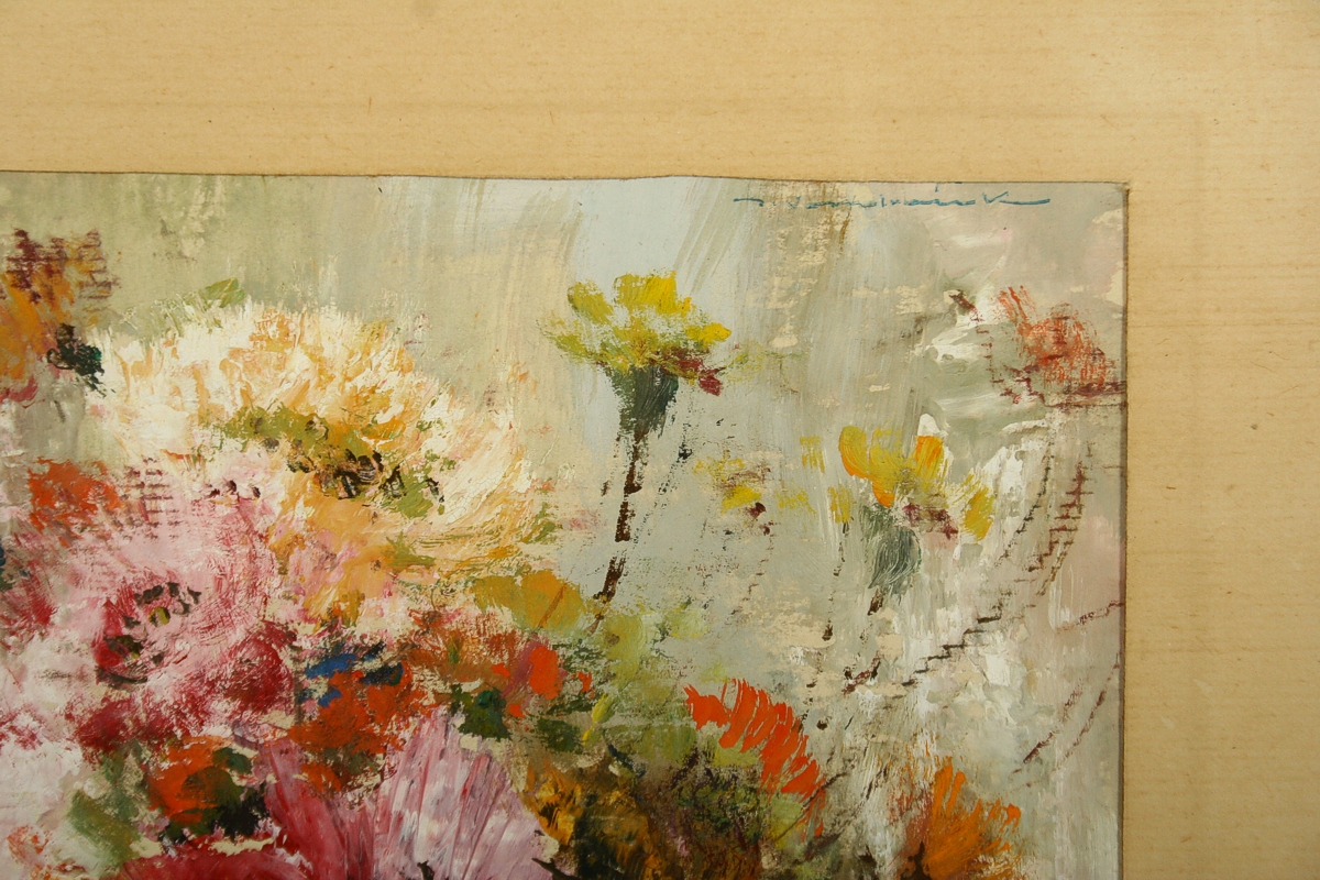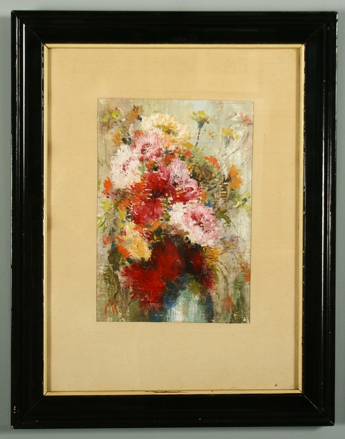 obraz kytice ve váze, olej na lepence, ve výřezu 24 x 17 cm, s rámem 45 x 35 cm, autor Josef Vondráček, podepsáno nahoře vpravo J. Vondráček, rámováno v paspartě a rámu pod sklem