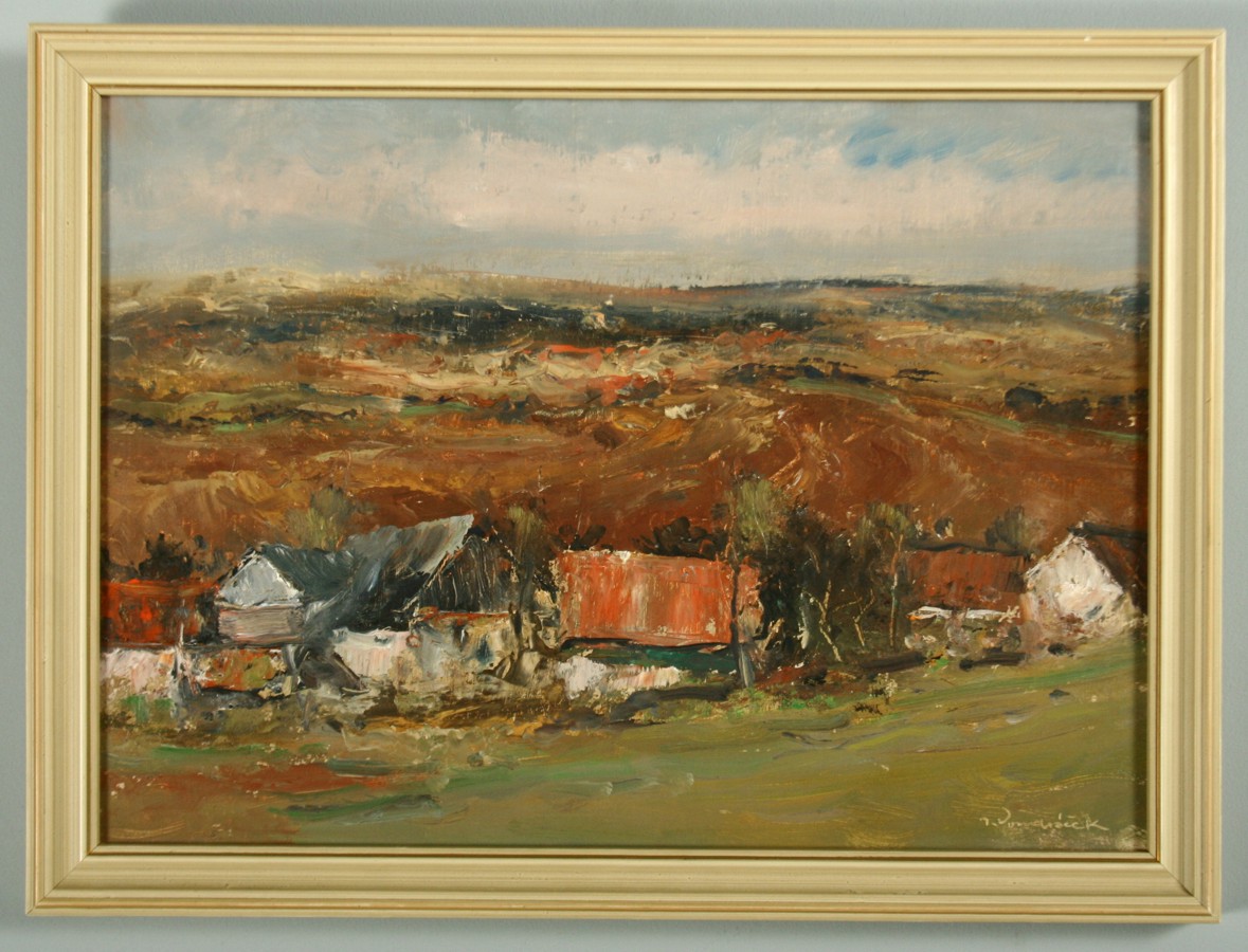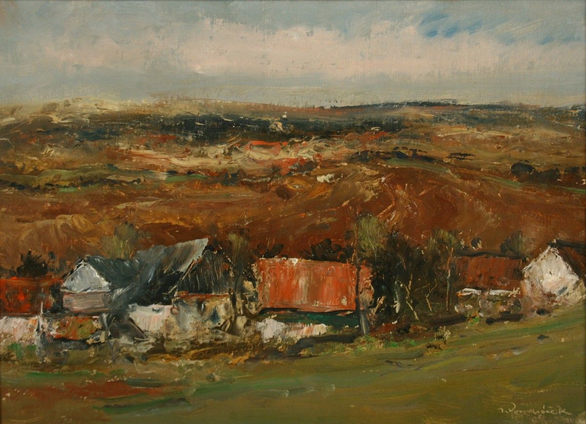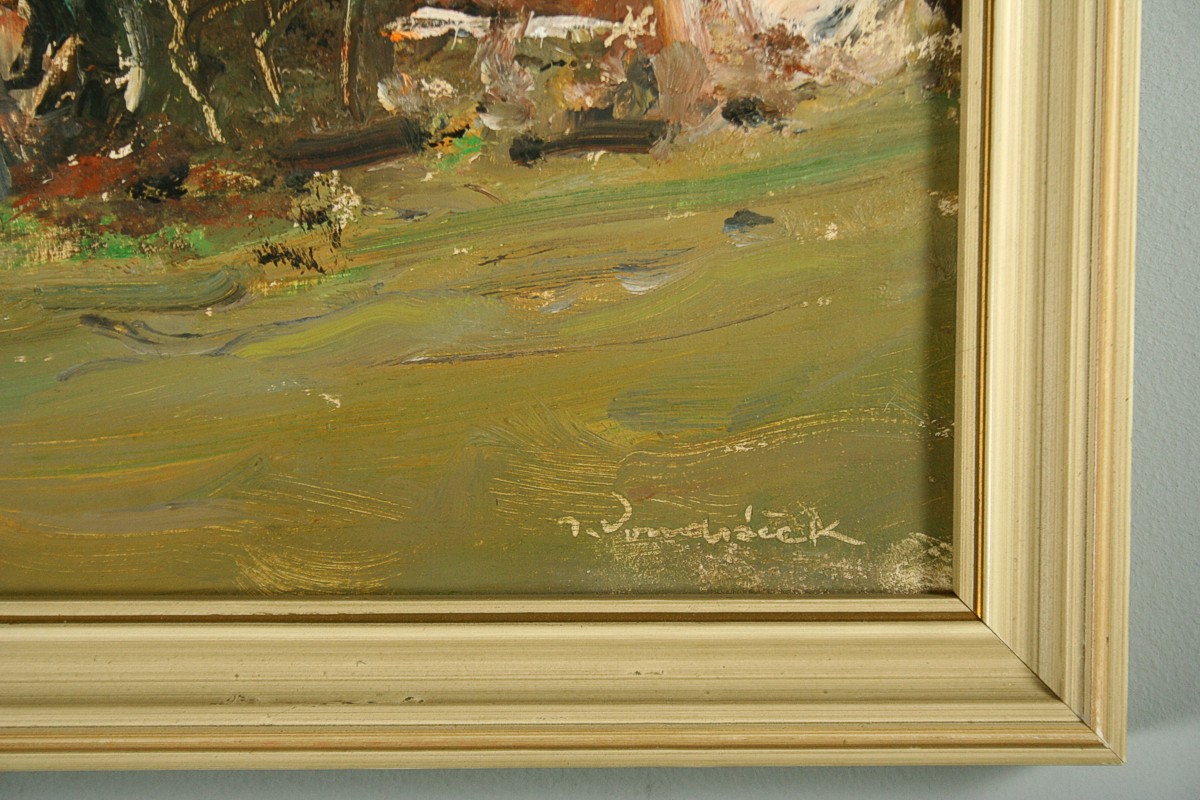 obraz krajiny s chalupami, olej na lepence 25 x 34 cm s rámem 29 x 38 cm, autor Josef Vondráček, podepsáno vpravo dole J. Vondráček, rámováno