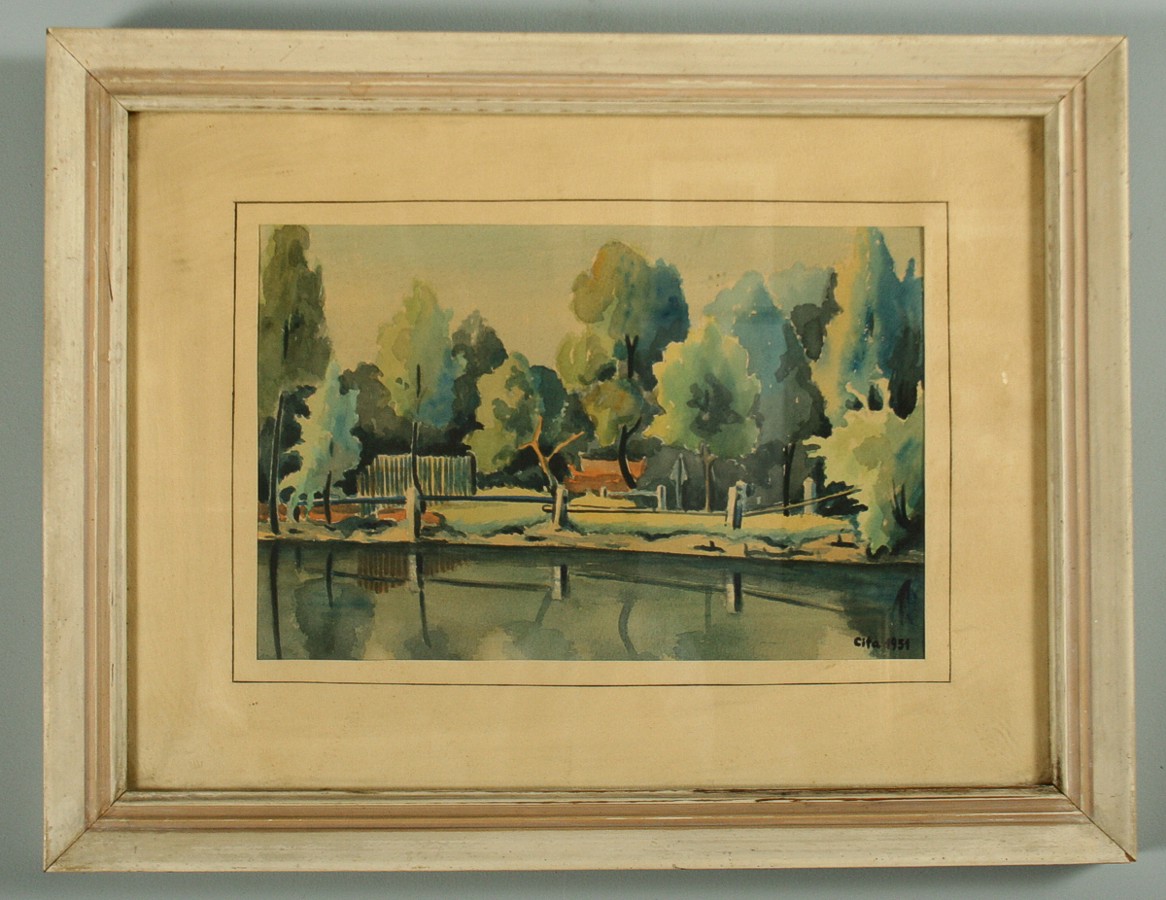 krajina s vodou a rybníkem, akvarel na papíře ve výřezu 18 x 27 cm s rámem 34 x 44 cm autor Jaroslav Cita, podepsáno vpravo dole Cita 1951, rámováno v paspartě a rámu pod sklem