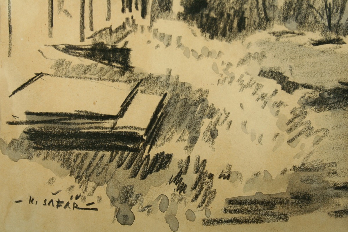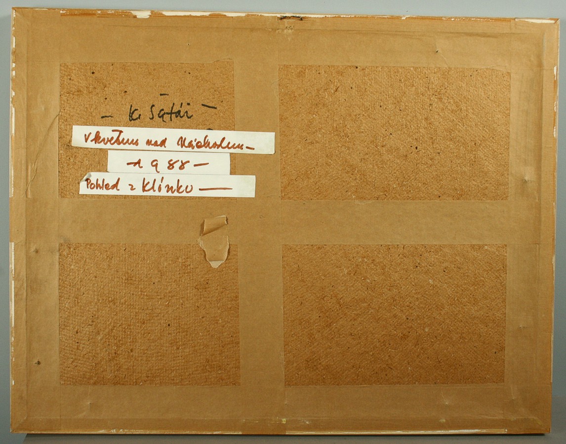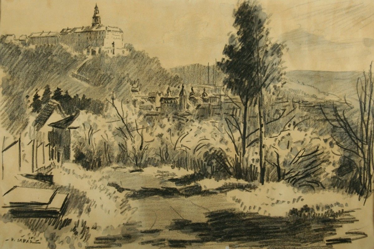 pohled na Náchod z Klínku, kresba úhlem na papíře, ve výřezu 32 x 46 cm s rámem 48 x 62 cm, autor Karel Šafář podepsáno vlevo dole K.Šafář ze zadu autorský přípis s datací a určením, rámováno v paspartě a rámu pod sklem