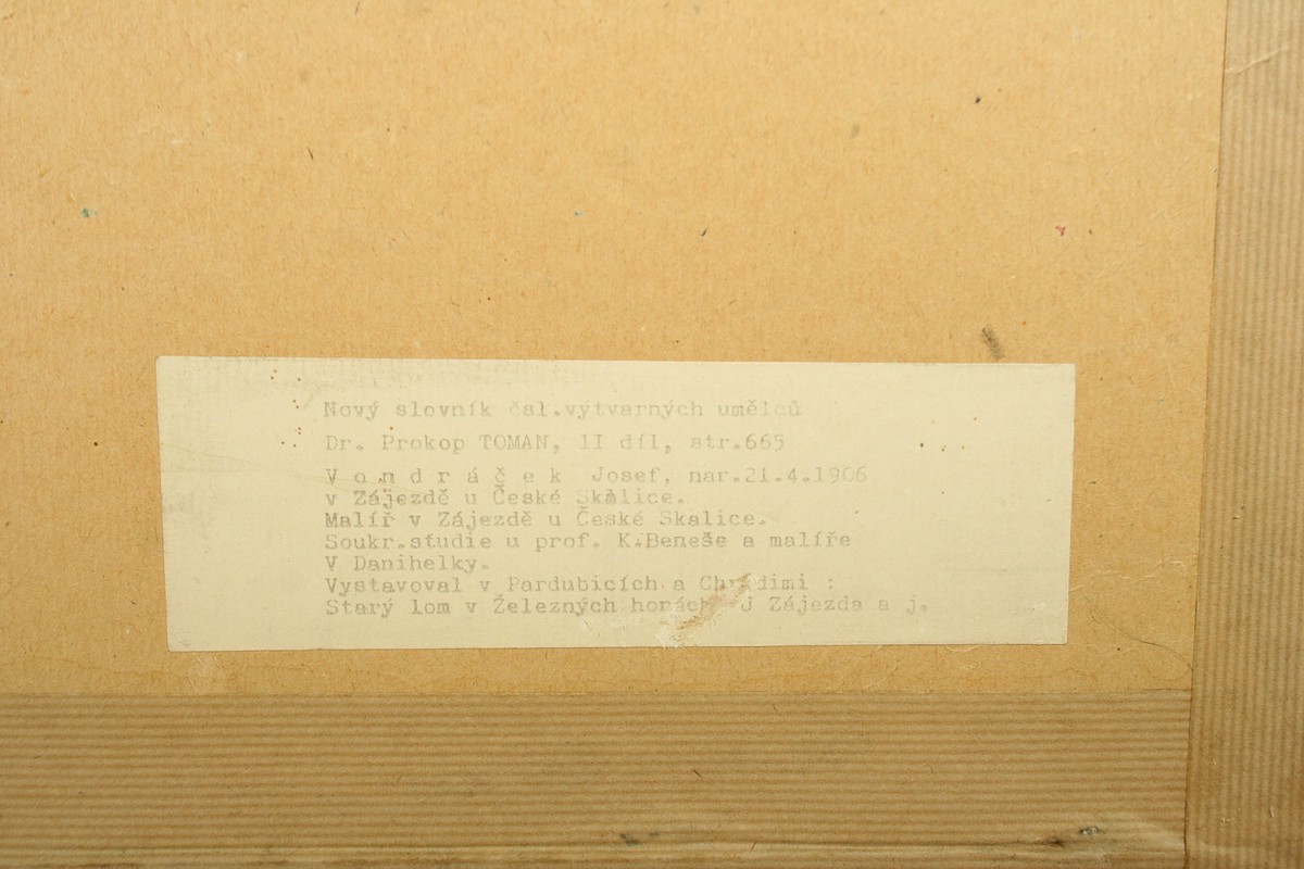 obraz zimní krajiny, olej tempera na lepence ve výřezu 36 x 45 cm s rámem 52 x 61 cm, autor Josef Vondráček, nepodepsáno, na zadní straně popisek autora, rámováno v paspartě a rámu pod sklem