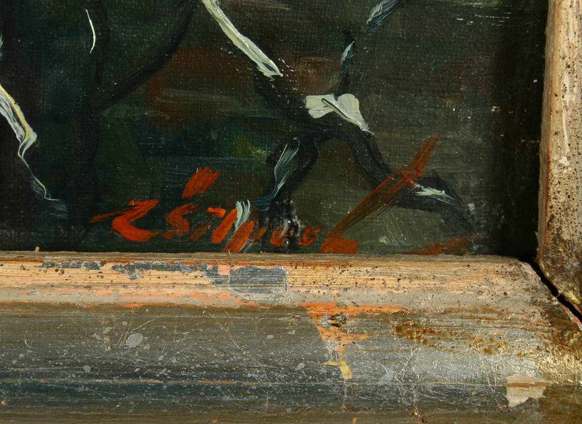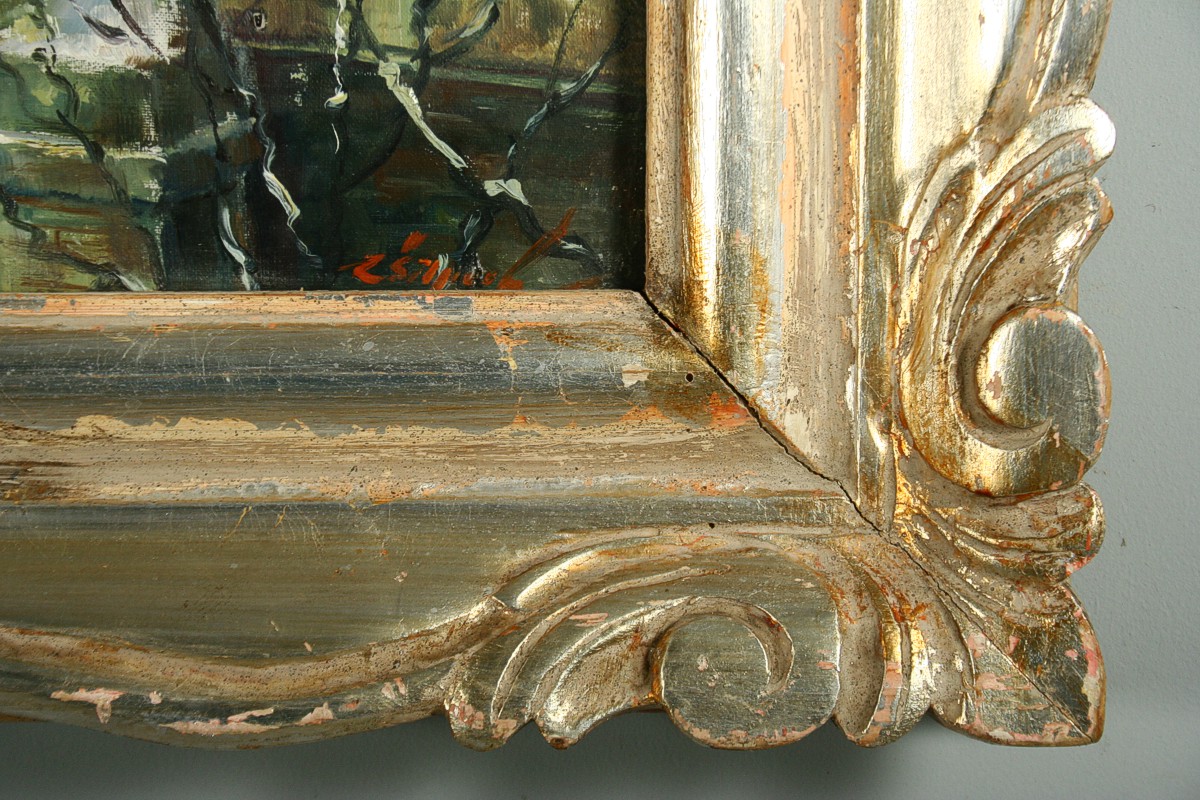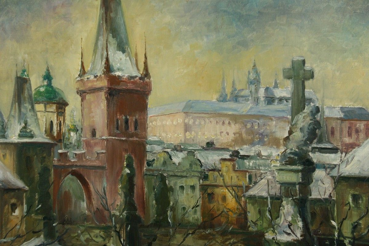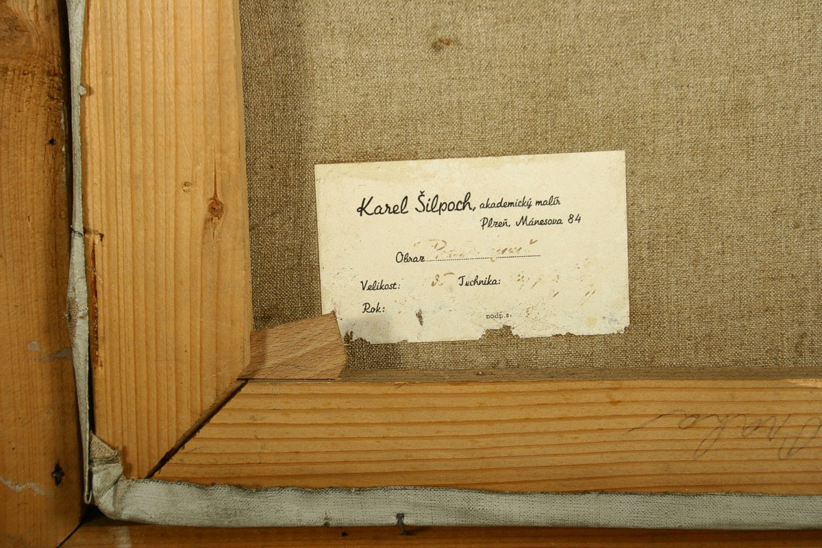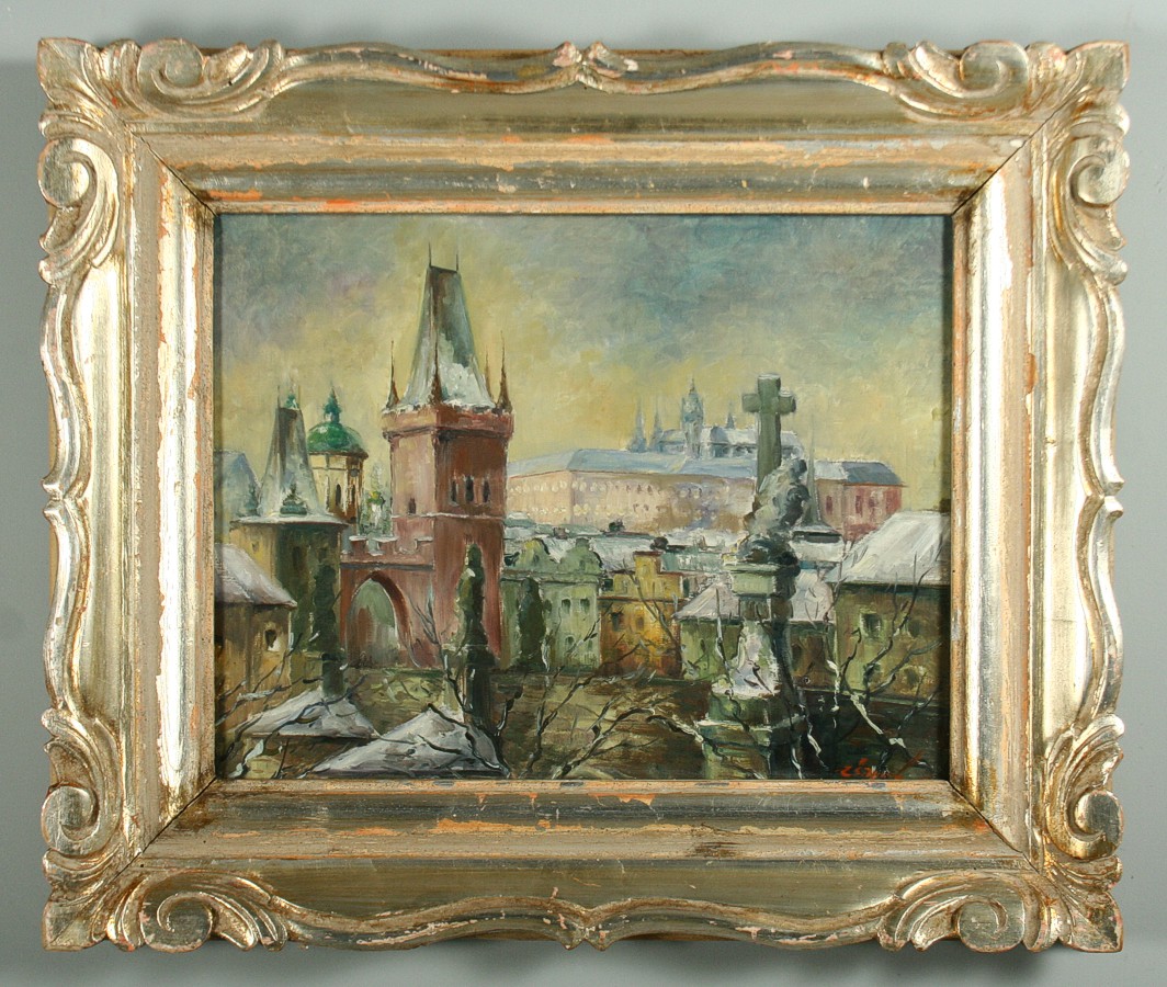 obraz Prahy pohled na Hradčany přes Karlův most, olej na plátně 35 x 45 cm s rámem 53 x 63 cm, autor Karel Šilpoch, podepsáno vpravo dole Šilpoch a ze zadu autorský štítek, rámováno v původním řezaném rámu