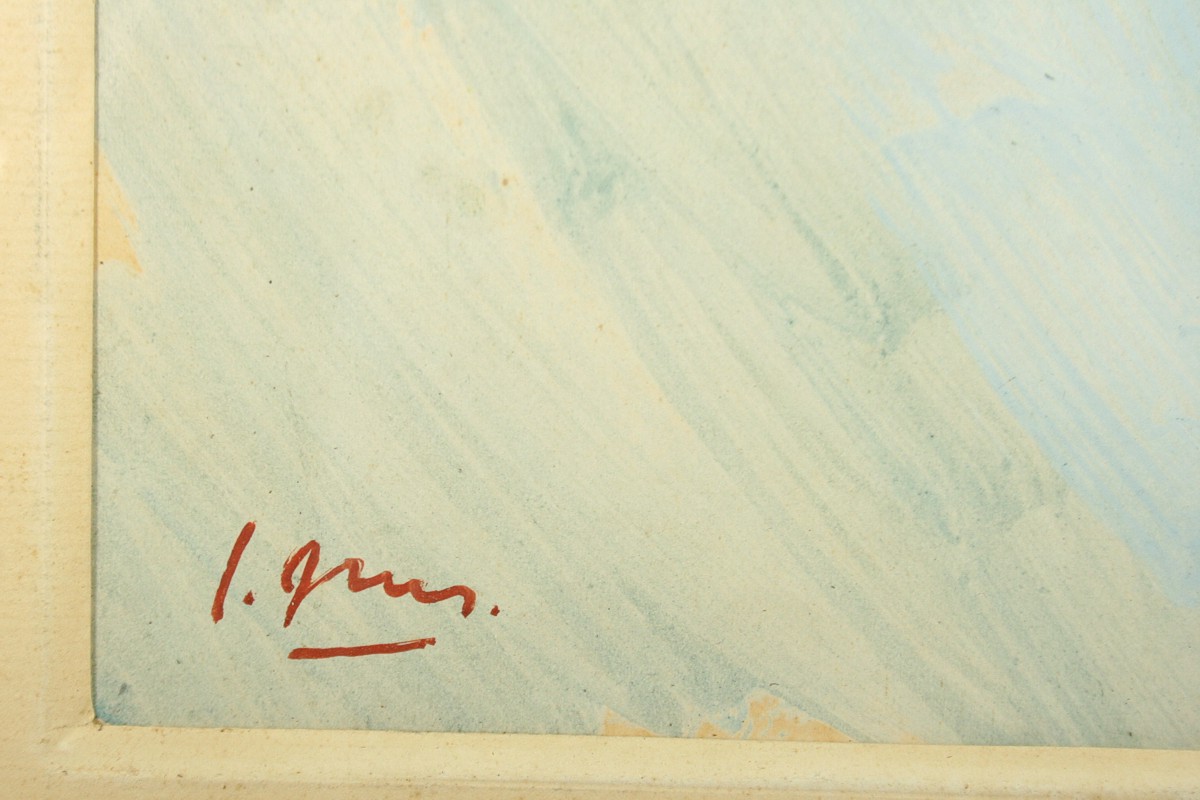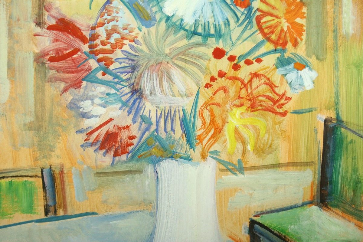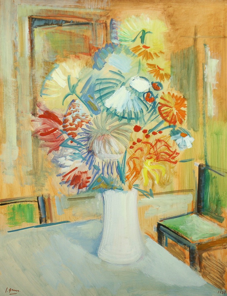 obraz kytice ve váze na stole v pokoji se židlí, olej tempera na lepence ve výřezu 65 x 50 cm s rámem 87 x 74 cm, autor Jaroslav Grus (1891 - 1983), podepsáno vlevo dole J. Grus datováno 1939, rámováno v původní paspartě a rámu pod sklem