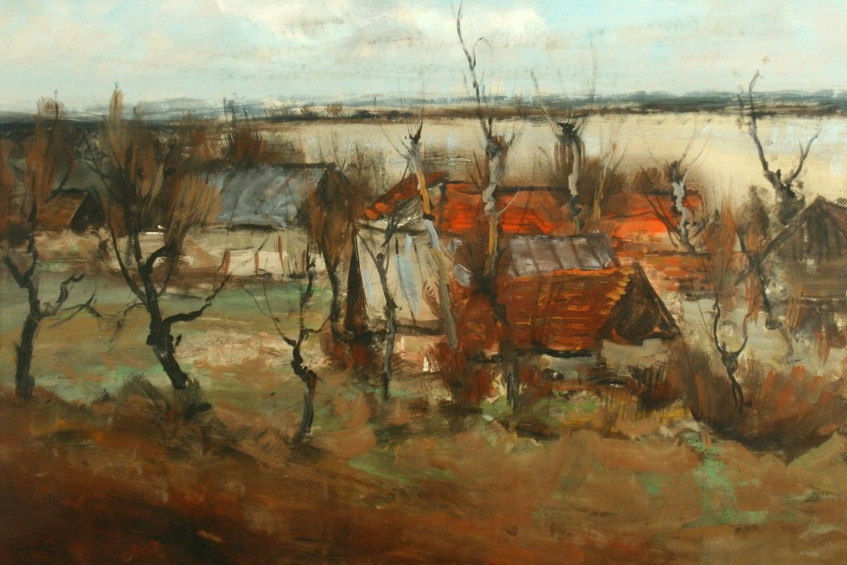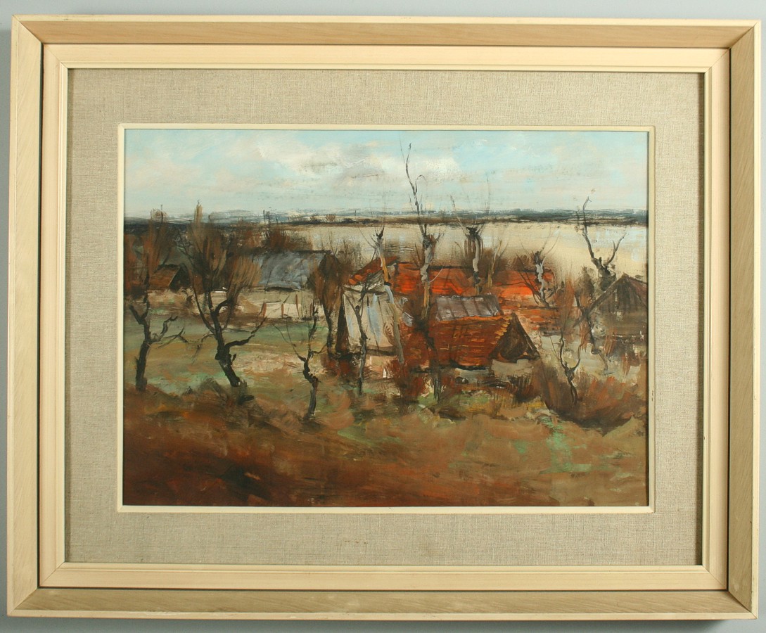 obraz krajiny u přehrady Rozkoš, olej tempera na kartonu, ve výřezu 35 x 49 cm, s rámem 55 x 69 cm, autor Josef Vondráček, nepodepsáno, rámováno v paspartě a původním rámu pod sklem