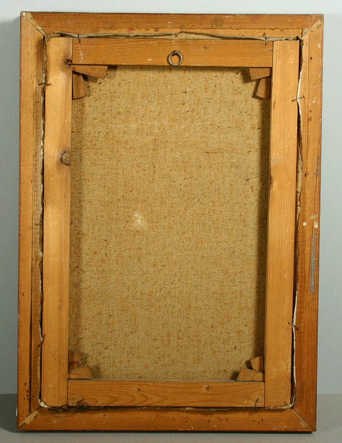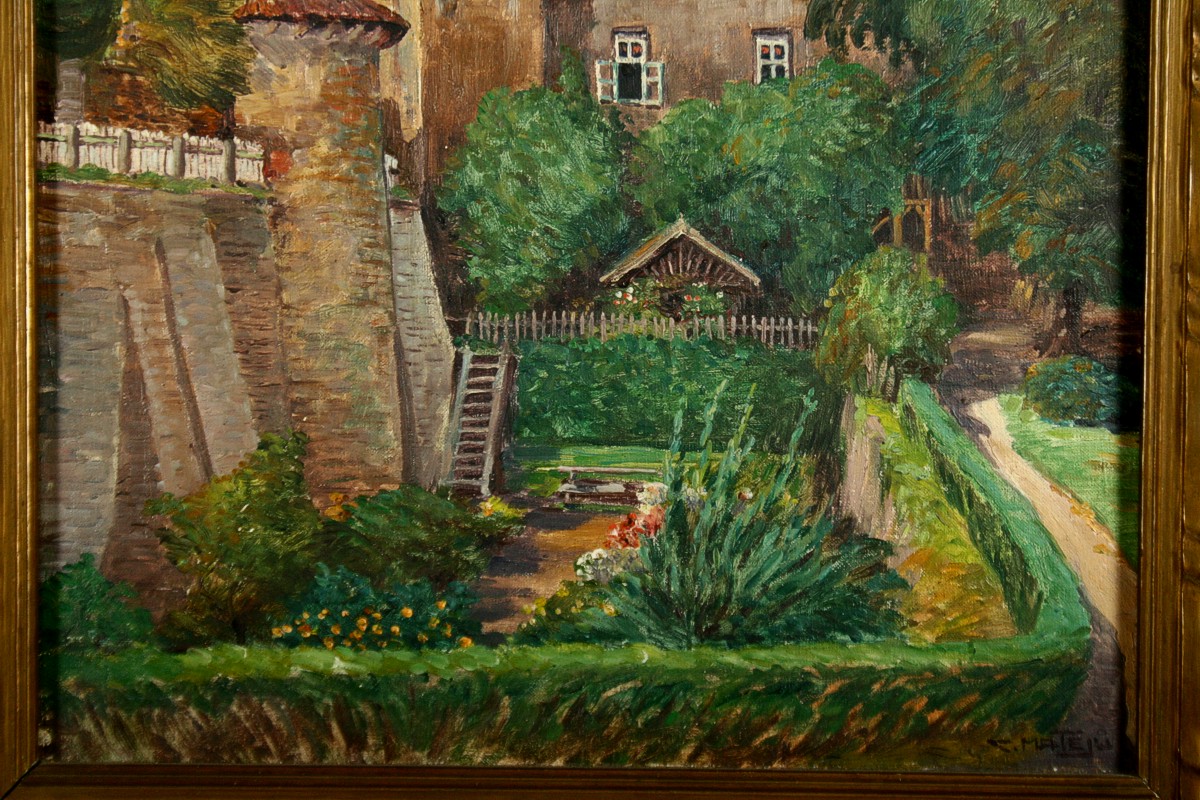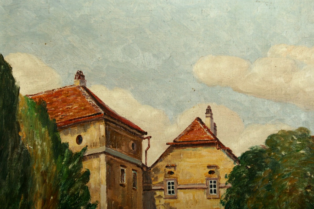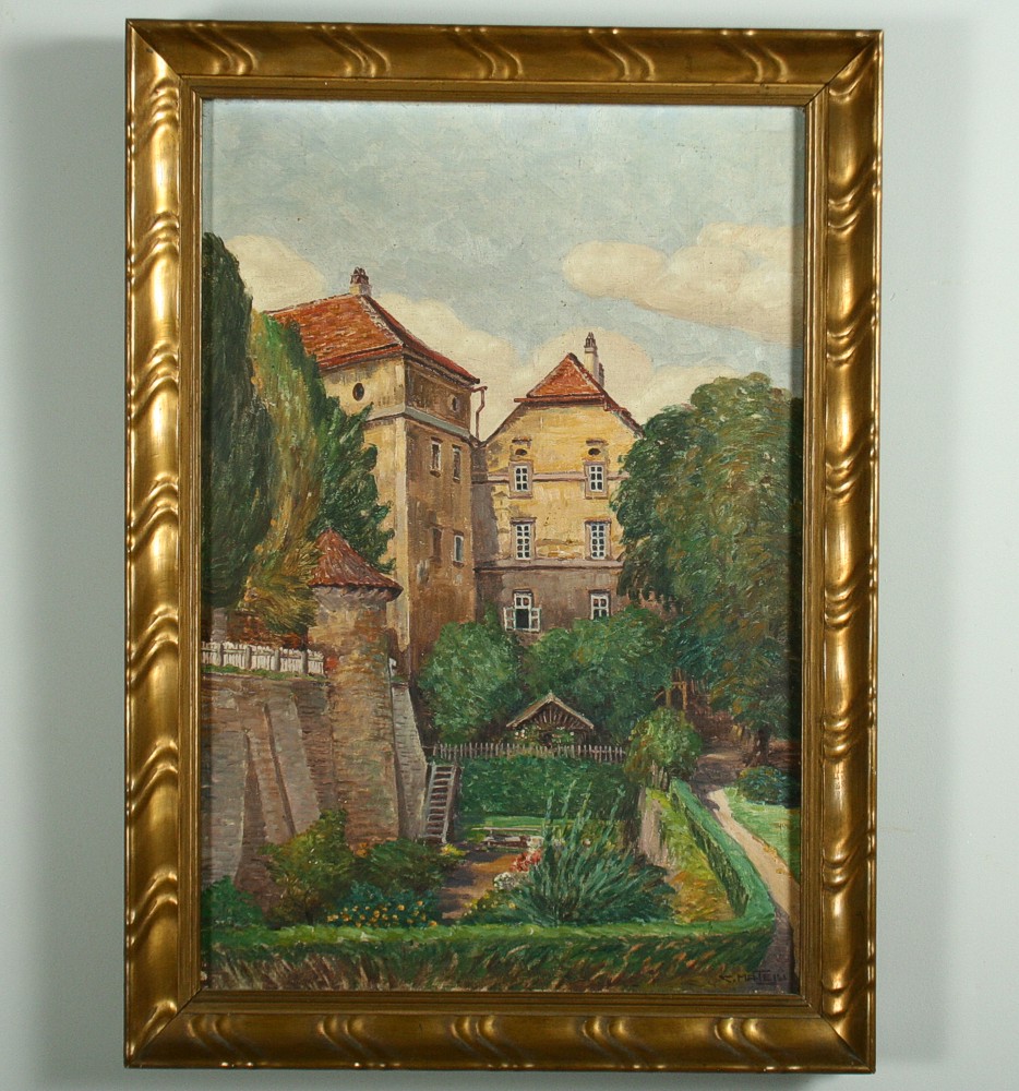 obraz náchodského zámku a zámeckého příkopu, olej na plátně 52 x 35 cm s rámem 43 x 60 cm, autor Calestýn Matějů, podepsáno vpravo dole C. Matějů, rámováno v původním rámu, párový obraz k položce 1271