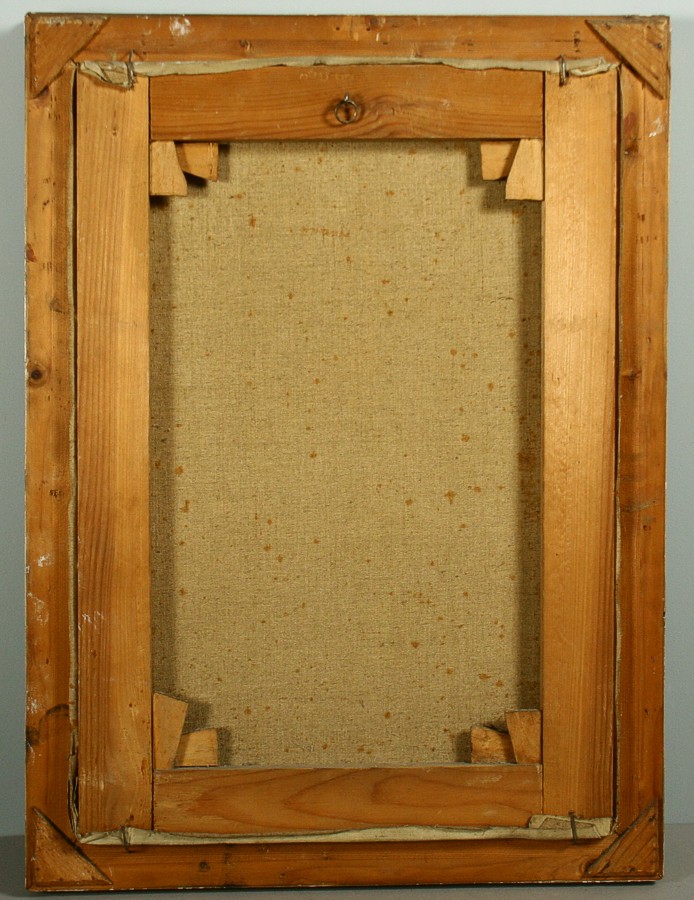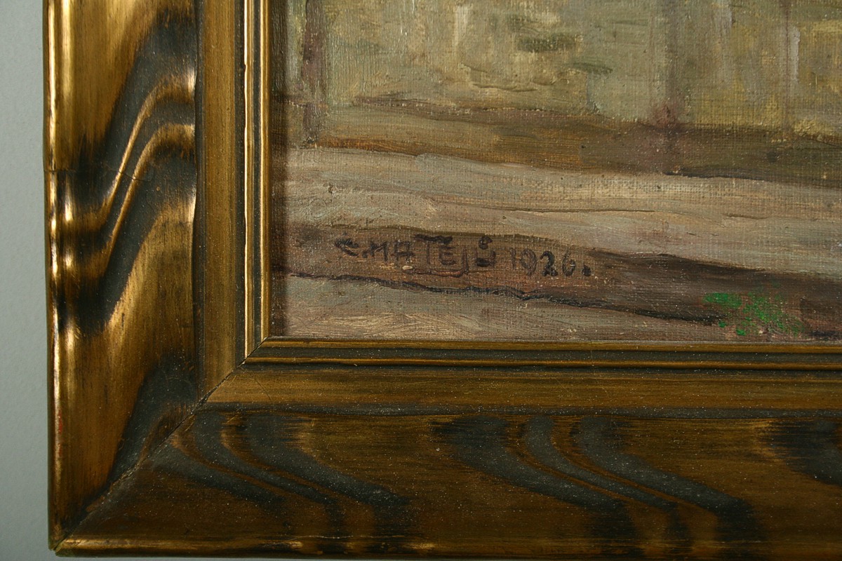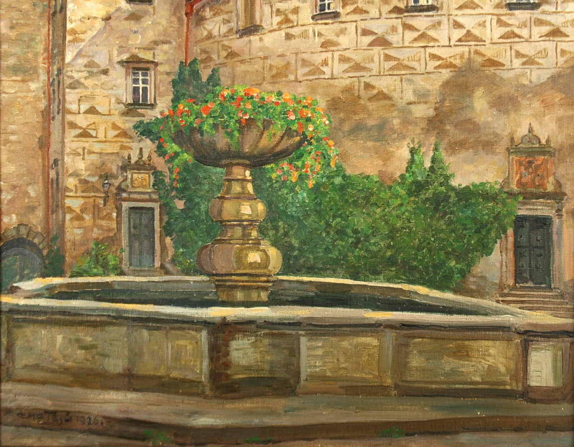 obraz náchodského zámku nádvoří s kašnou, olej na plátně 52 x 36 cm s rámem 59 x 44 cm, autor Calestýn Matějů, podepsáno vlevo dole C. Matějů 1926, rámováno v původním rámu, párový obraz k položce 1270