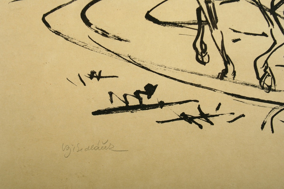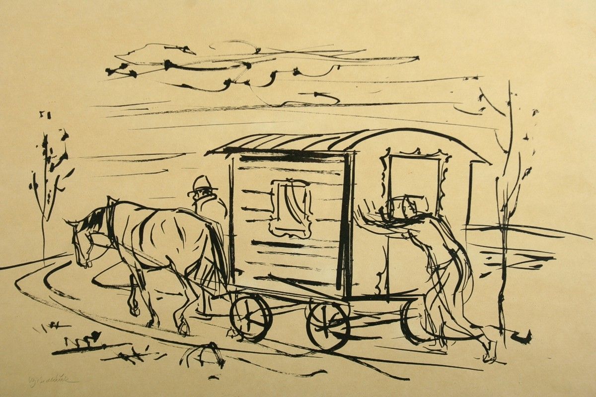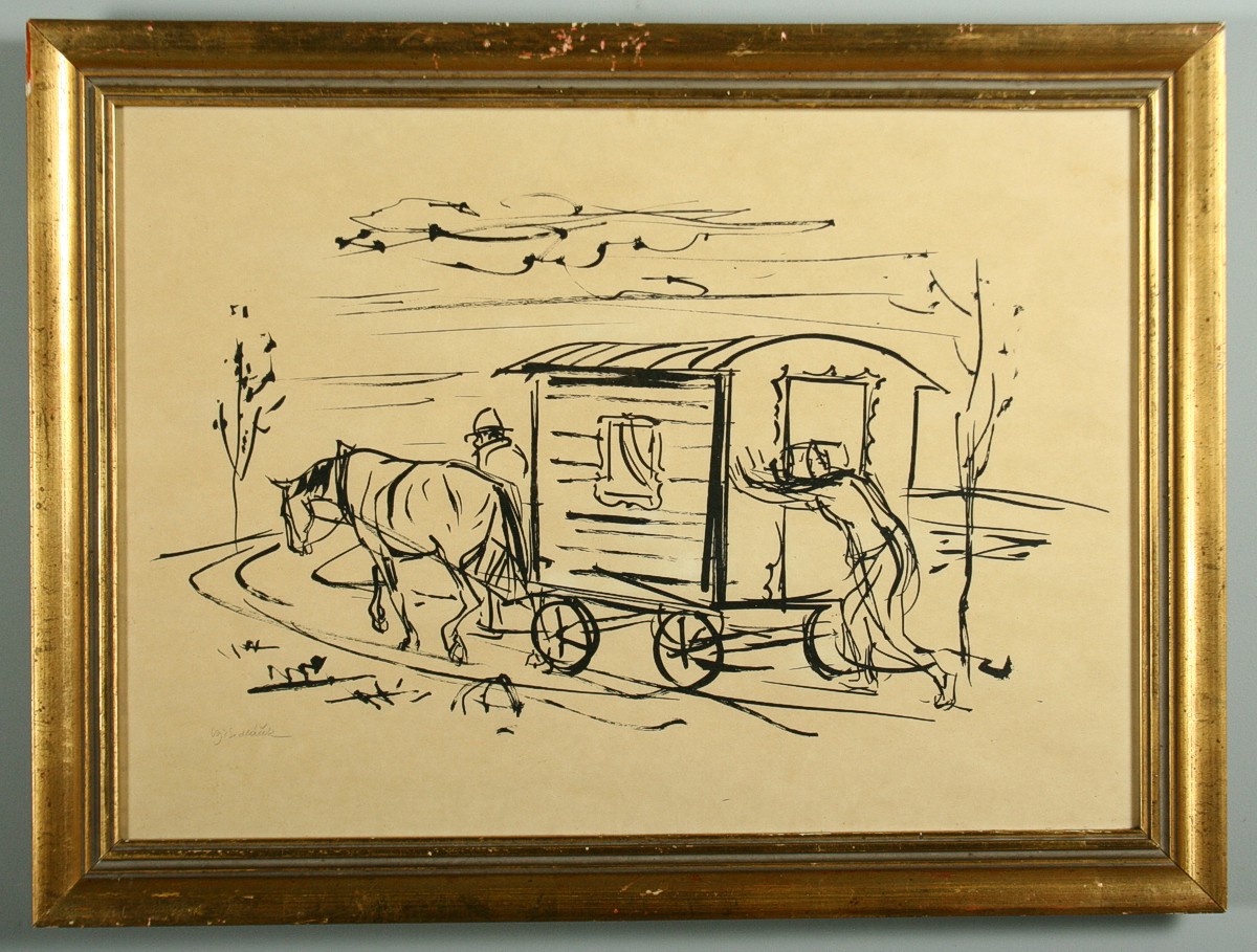 kočovníci s koněm a maringotkou, černobílá litografie na papíře, ve výřezu 37 x 52 cm s rámem 45 x 60 cm, autor Vojtěch Sedláček, podepsáno vlevo dole Vojt. Sedláček, rámováno v zlaceném rámu pod sklem