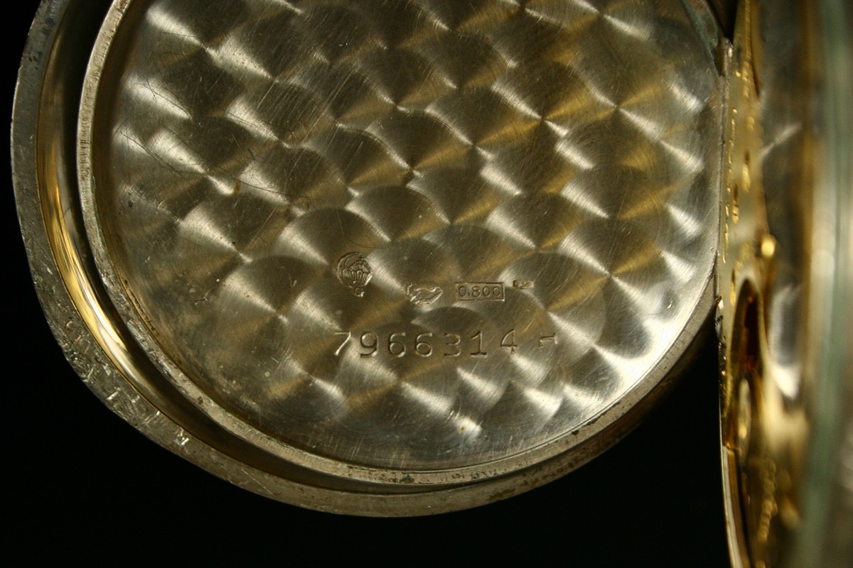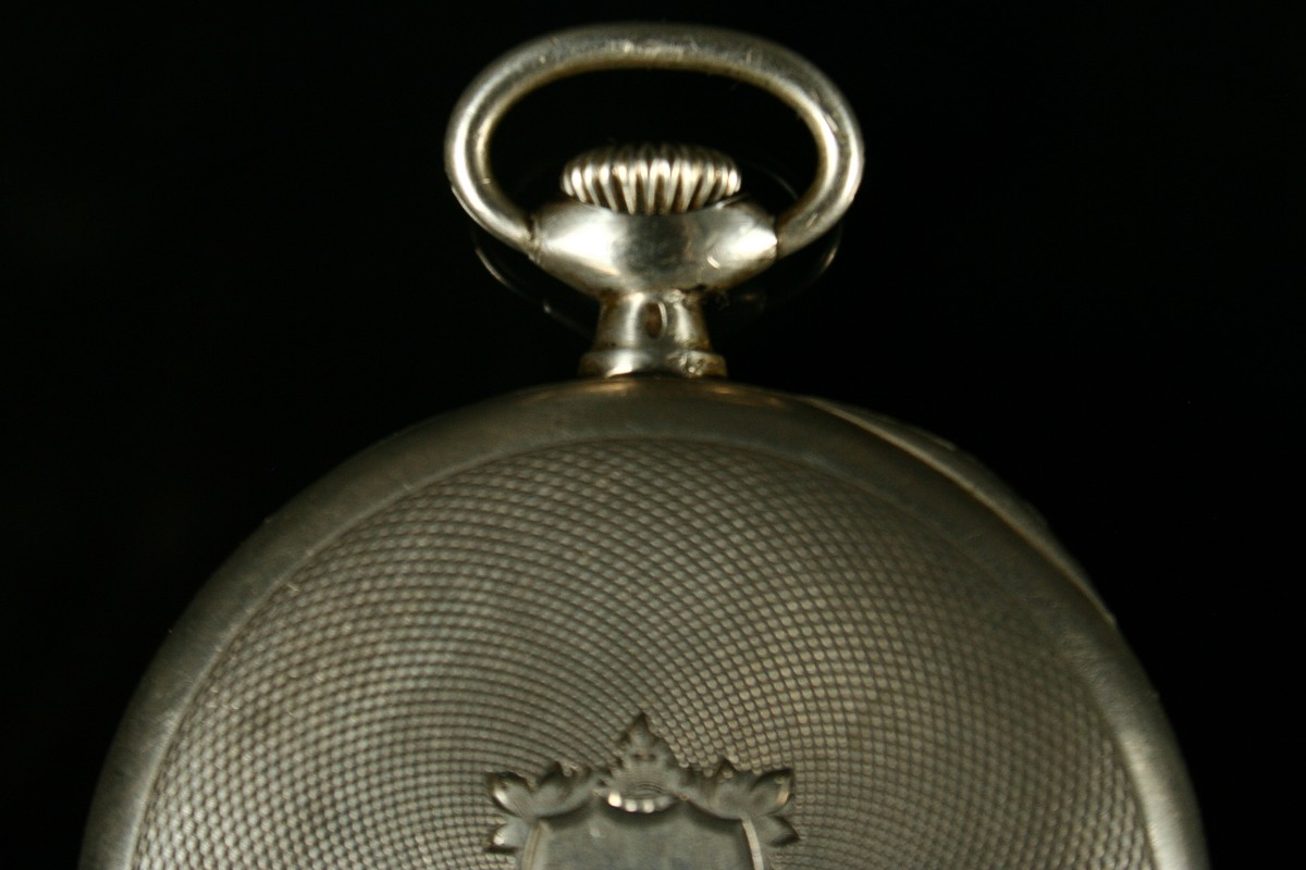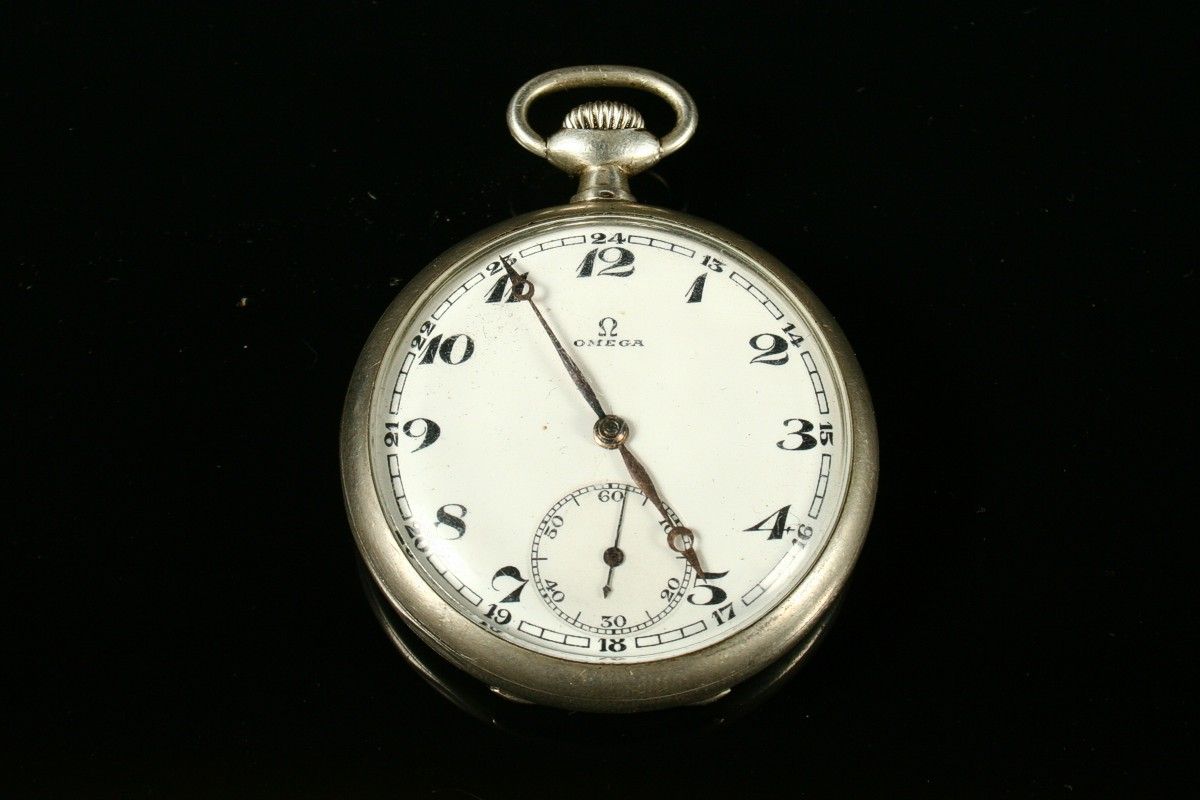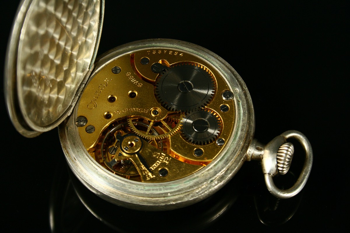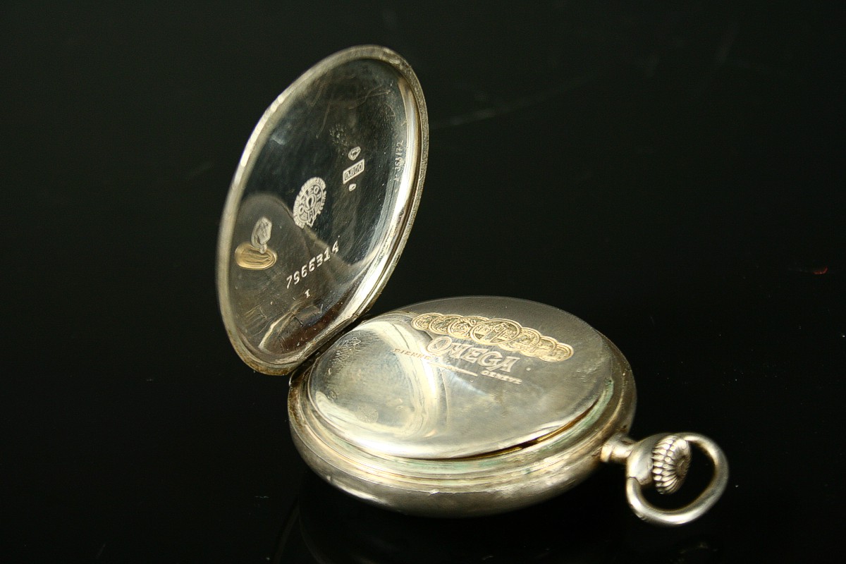 stříbrné kapesní hodinky dvou plášťové na zadním víčku zdobené, bílý smaltovaný ciferník značený OMEGA, stroj funkční značený OMEGA, na pláštích německé a švýcarcké puncy ryzosti 800/1000, s očkem 65 x 49 mm