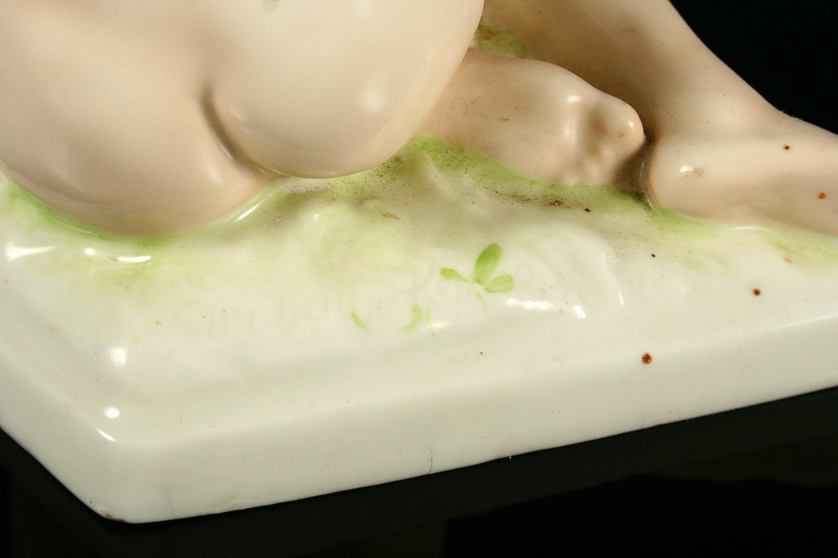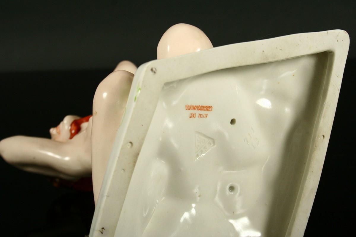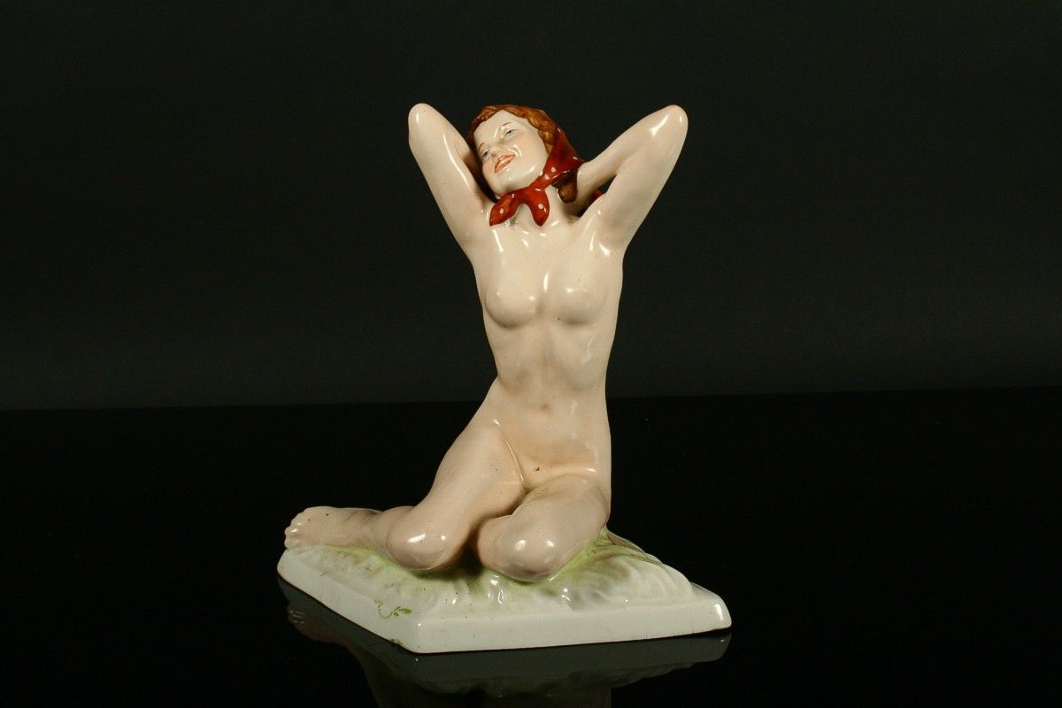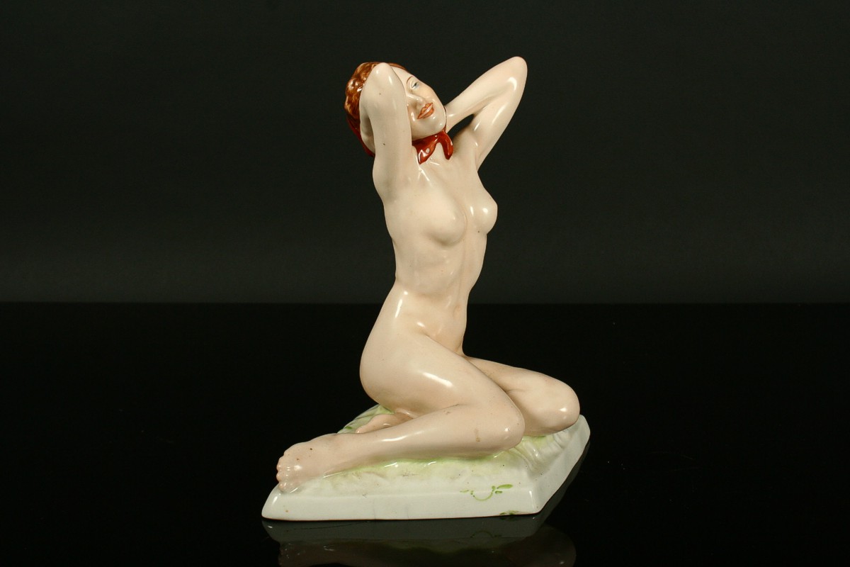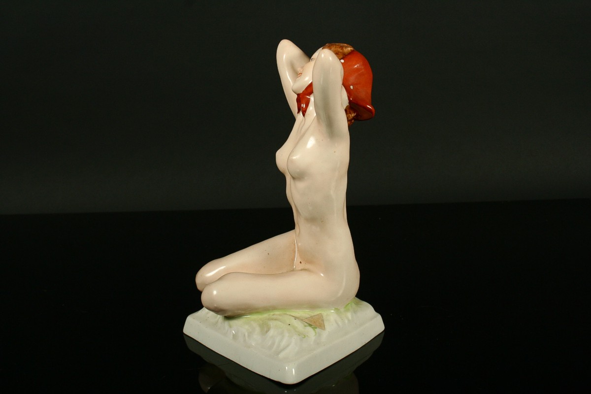 porcelánová soška, sedící dívčí akt se šátkem, malovaný bílý porcelán, na zadní straně soklu signováno Strobach König, na podstavě značeno tištěnou a tlačenou značkou Royal DUX Duchcov, 20,5 x 20,5 cm
