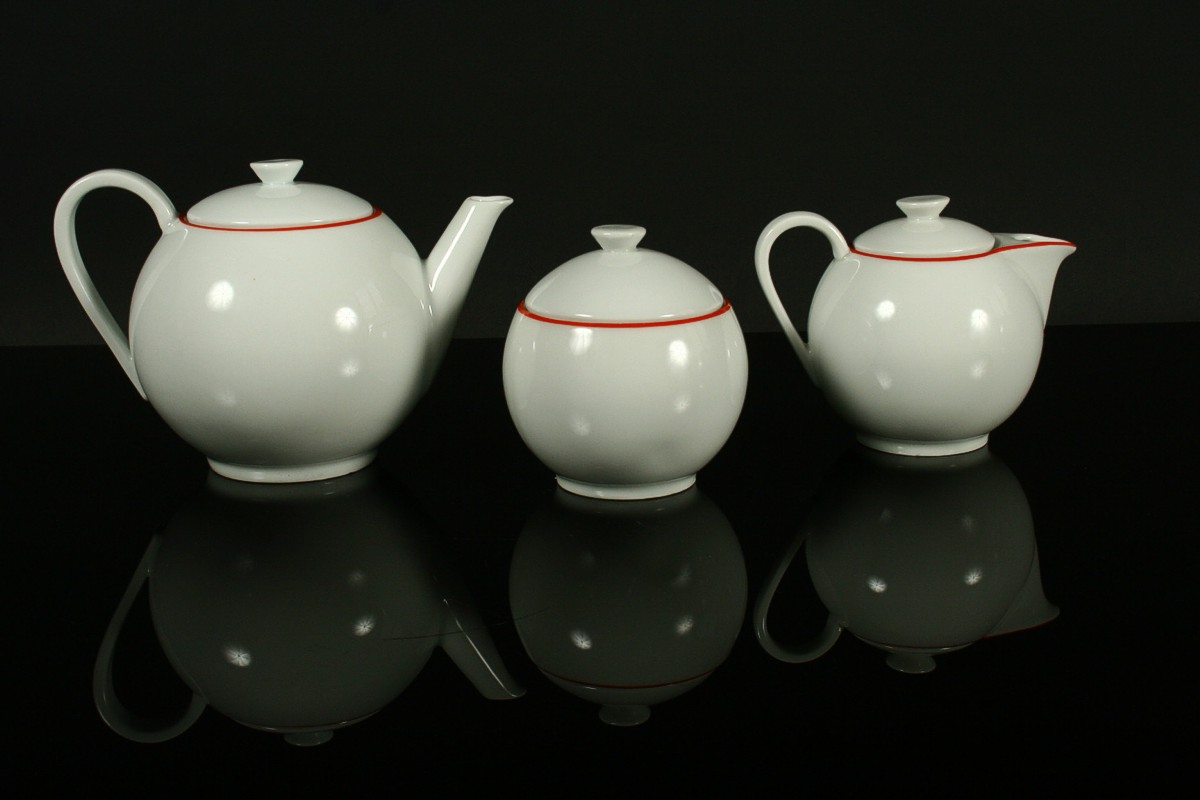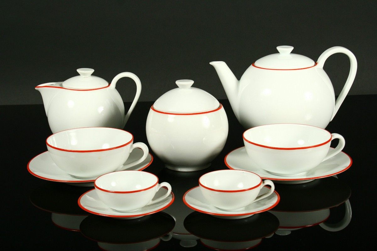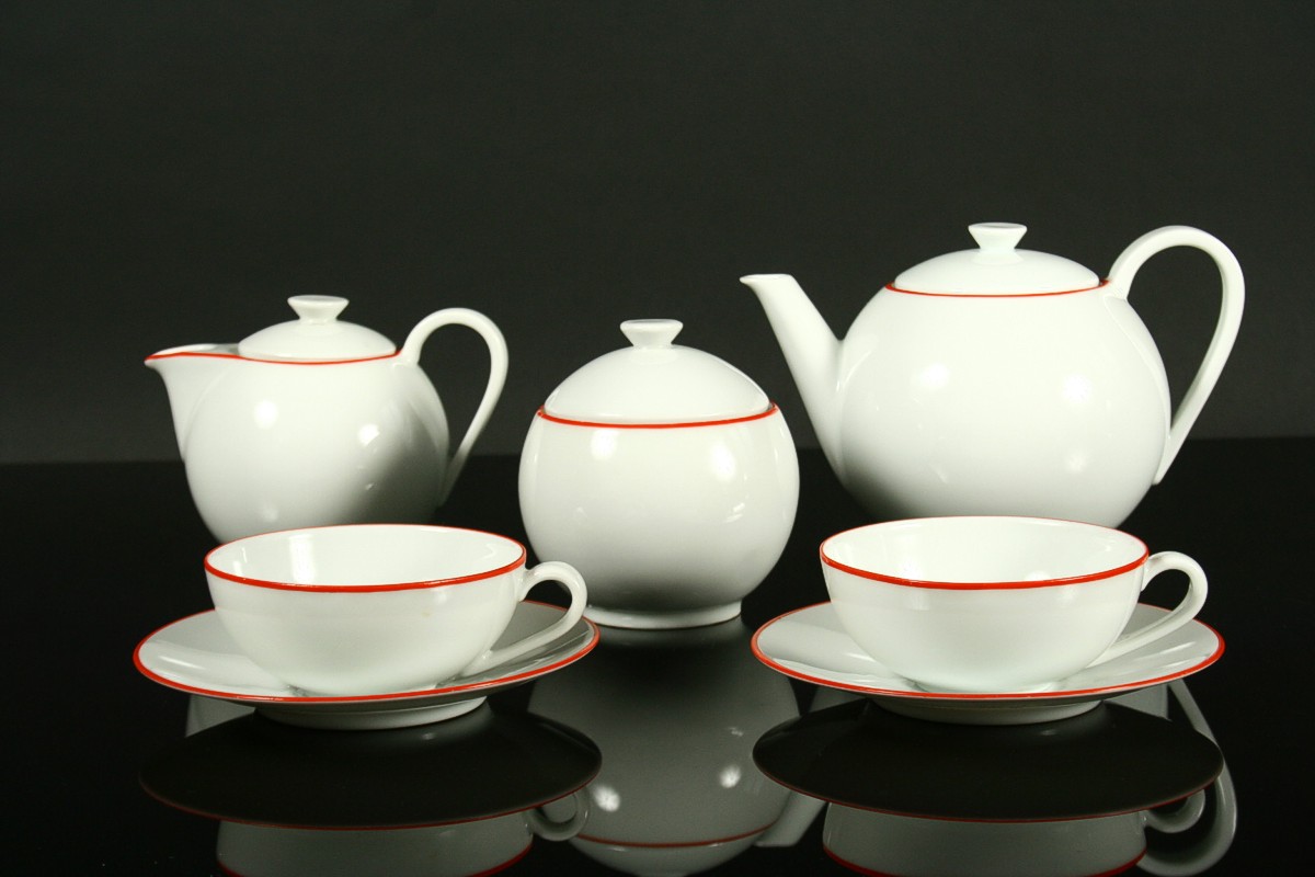čajový a moca přátelský servis od známého autora českého designu Ladislava Sutnara, 2 x moca šálek s podšálkem, 2 x čajový šálek s podšálkem, konvice, konvička a cukřenka s víčkem z bélého tenkého porcelánu s črvenou linkou po obvodu, značeno tištěnou značkou DP Loket