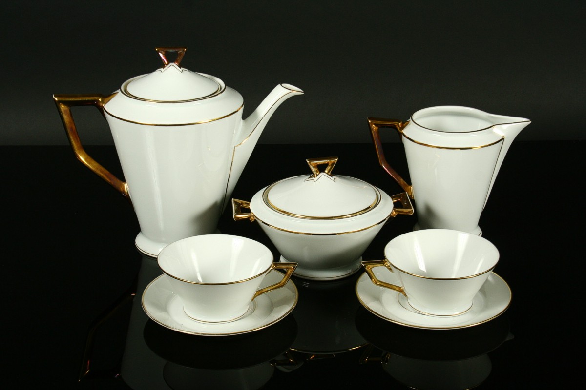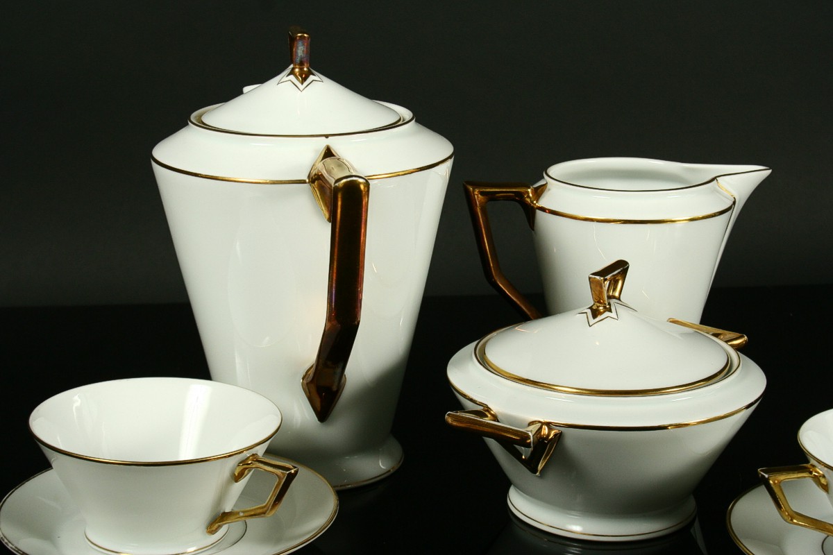 kompletní 6ti osobní servis z bílého porcelánu čistých geometrických tvarů zdobený zlatem v moderním stylu 30. let art deco, konvice s mléčenkou, cukřenkou, 6 x šálek s podšálky, značený tištěnou značkou Nová Role Bohemia