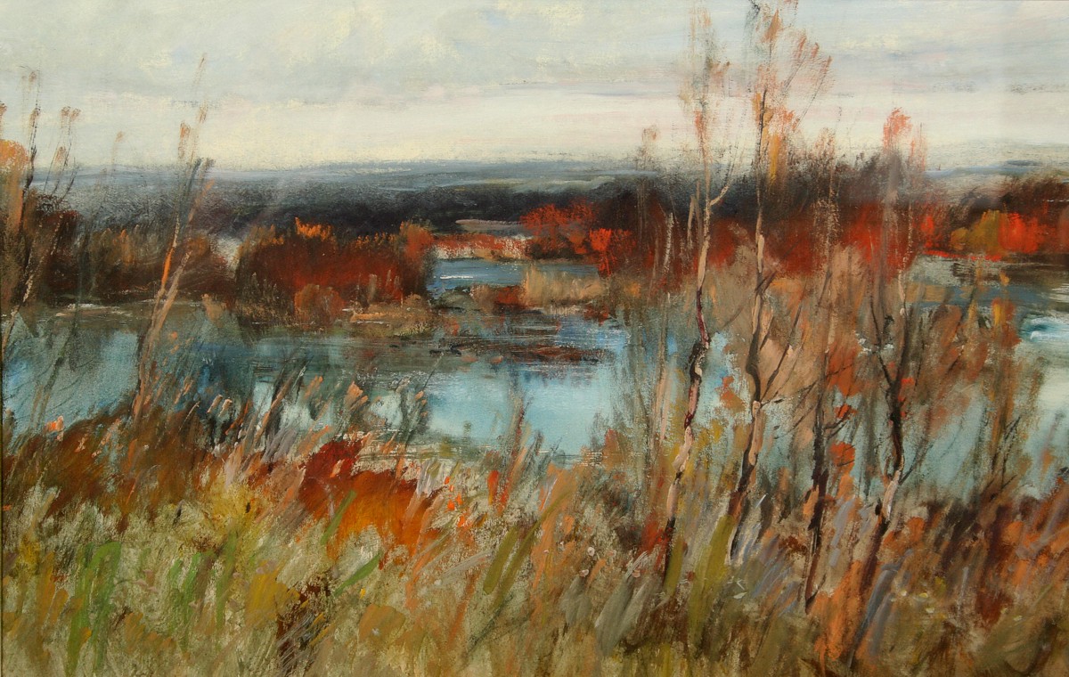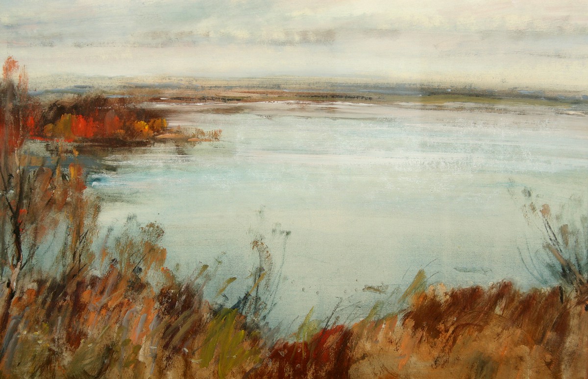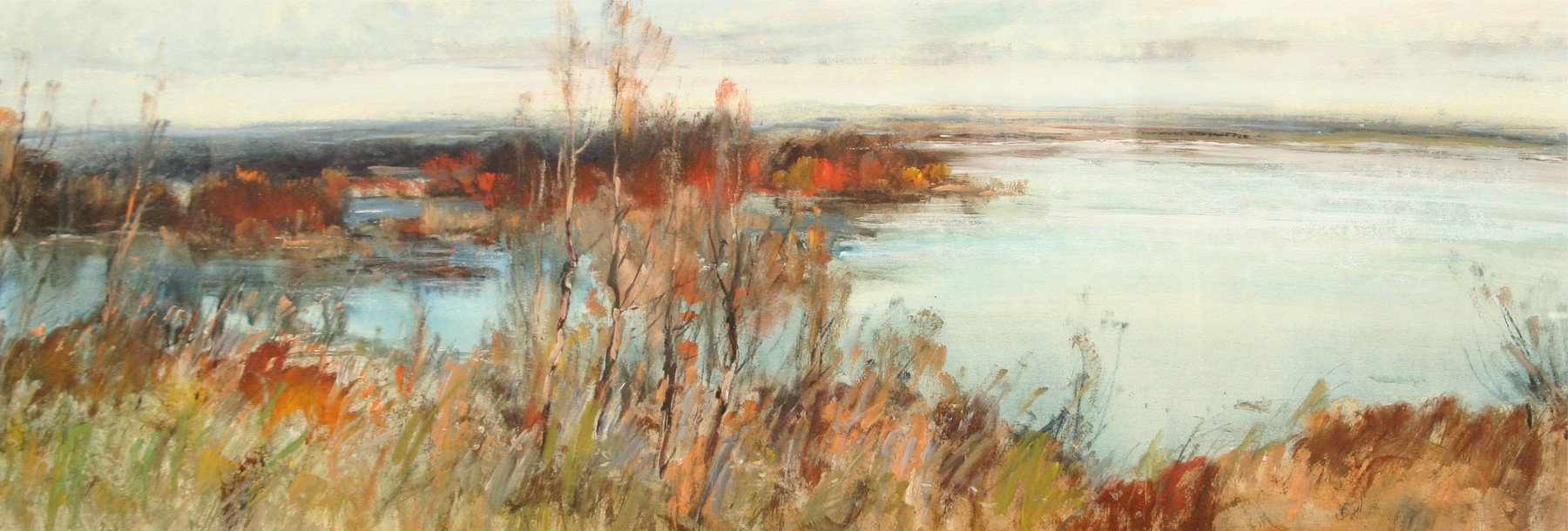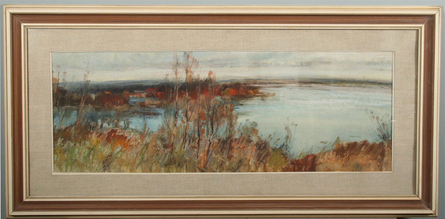 obraz krajiny a nádrže Rozkoš, olej na lepence ve výřezu 30 x 83 cm s rámem 53 x 107 cm, autor Josef Vondráček, nepodepsáno, rámováno pod sklem