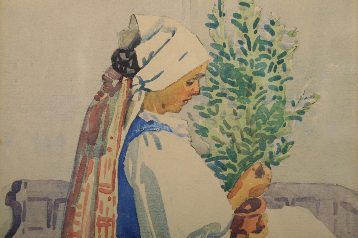 dívka s květinou, akvarel na papíře, ve výřezu 18 x 17 cm s rámem 38 x 33 cm, autor Antoš Frolka podepsáno vpravo dole akvarelem A. Frolka, rámováno v původní paspartě a rámu pod sklem