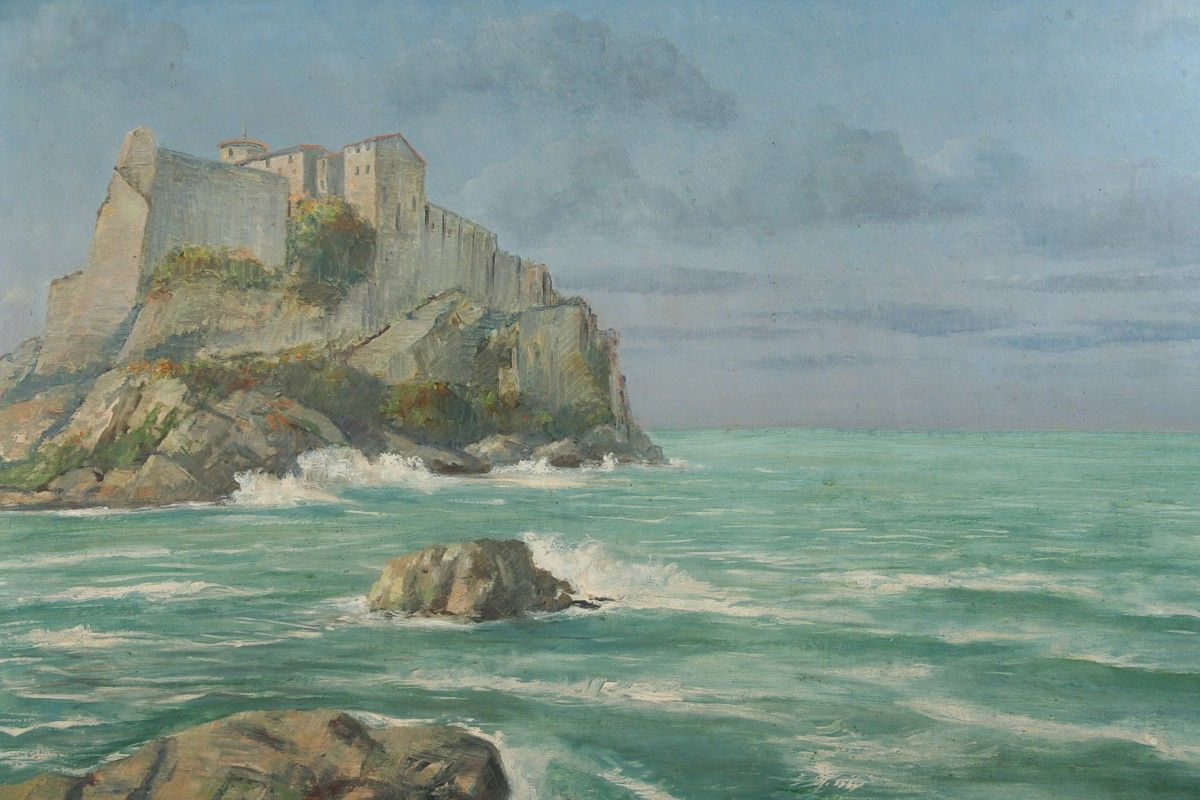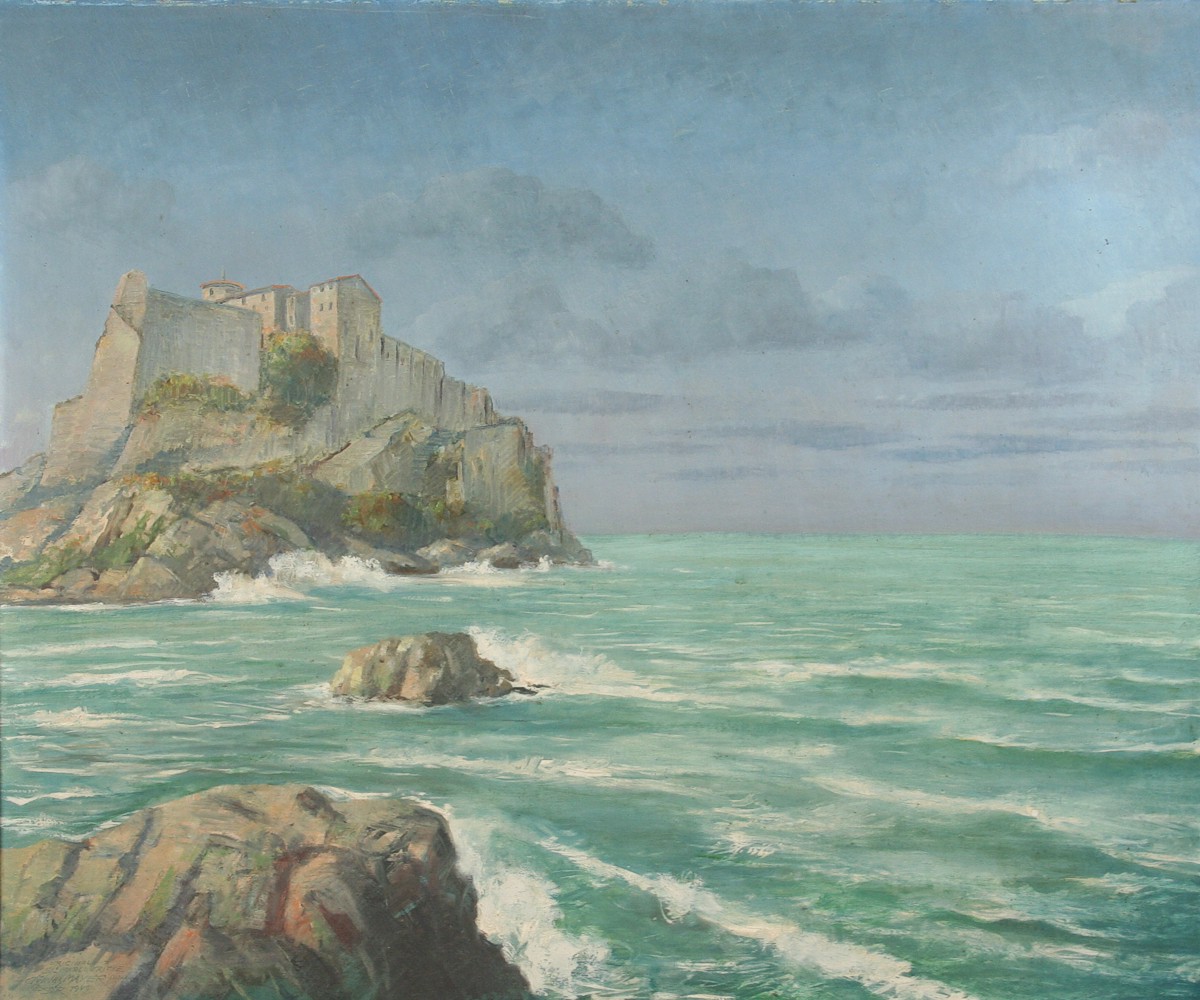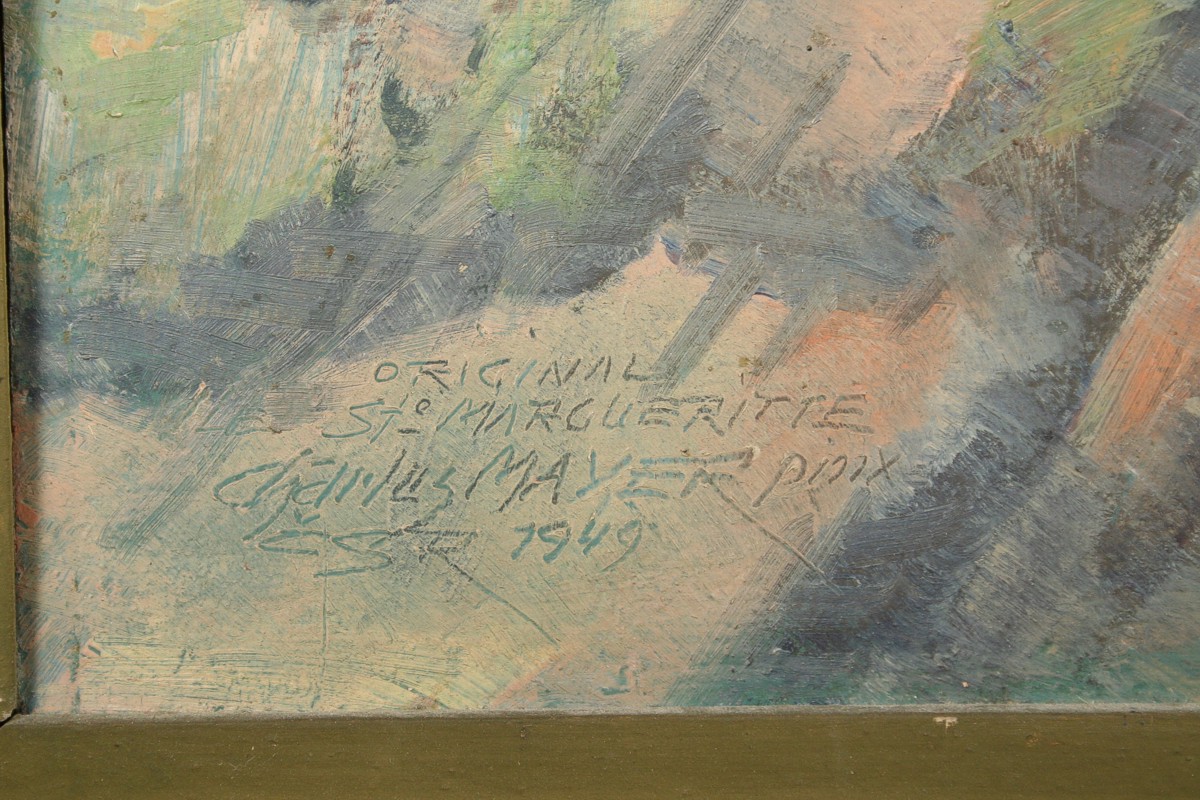 obraz ostrova, olej na kartonu 75 x 90 cm s rámem 99 x 114 cm, autor Karel Mayer, podepsáno vlevo dole Charles Mayer 1949, na zadní straně autorský přípis s datací 1949, obraz vznikl při jeho studijním pobytu ve Francii, rámováno v původním řezaném rámu