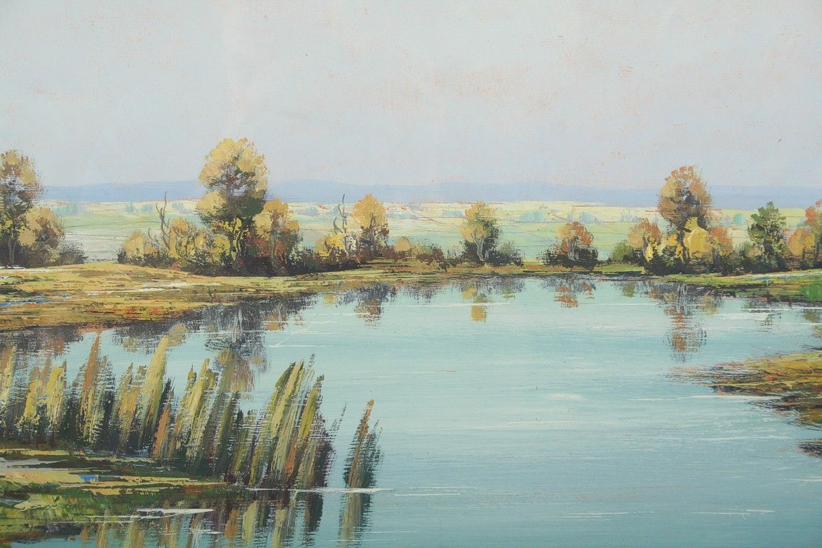 obraz krajiny s vodní hladinou z okolí Třeboně, olej na kartonu 49 x 65 cm s rámem 61 x 77 cm, autor Bohumil Pospíšil podepsáno vpravo dole Boh. Pospíšil, rámováno v původním rámu pod sklem
